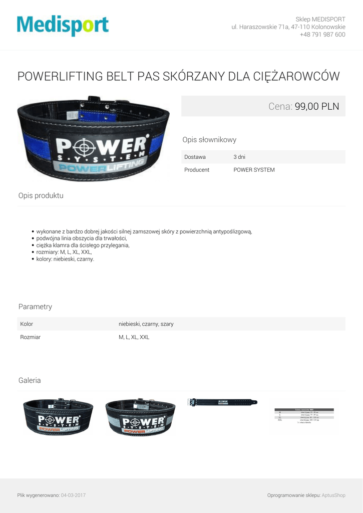 Sklep MEDISPORT ul. Haraszowskie 71a, 47-110 Kolonowskie +48 791 987 600 POWERLIFTING BELT PAS SKÓRZANY DLA CIĘŻAROWCÓW Cena: 99,00 PLN Opis słownikowy Dostawa 3 dni Producent POWER SYSTEM Opis produktu wykonane z bardzo dobrej jakości silnej zamszowej skóry z powierzchnią antypoślizgową, podwójna linia obszycia dla trwałości, ciężka klamra dla ścisłego przylegania, rozmiary: M, L, XL, XXL, kolory: niebieski, czarny. Parametry Kolor niebieski, czarny, szary Rozmiar M, L, XL, XXL Galeria Plik wygenerowano: 04-03-2017 Powered by TCPDF (www.tcpdf.org) Oprogramowanie sklepu: AptusShop