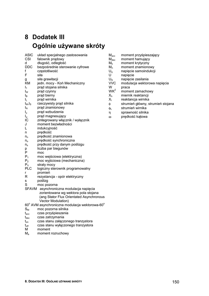 8 Dodatek III Ogólnie używane skróty ASIC układ specjalnego zastosowania CSI falownik prądowy d długość, odległość DDC bezpośrednie sterowanie cyfrowe f częstotliwość F siła g siła grawitacji KM jedn. mocy - Koń Mechaniczny I1 prąd stojana silnika IW prąd czynny IB prąd bierny IL prąd wirnika IM,IS rzeczywisty prąd silnika IN prąd znamionowy Iµ prąd wzbudzenia Iϕ prąd magnesujący IC zintegrowany włącznik / wyłącznik J moment bezwładności L indukcyjność n prędkość nn prędkość znamionowa no prędkość synchroniczna prędkość przy danym poślizgu ns p liczba par biegunów P moc P1 moc wejściowa (elektryczna) P2 moc wyjściowa (mechaniczna) PV straty mocy PLC logiczny sterownik programowalny r promień R rezystancja - opór elektryczny s poślizg S moc pozorna SFAVM asynchroniczna modulacja napięcia zorientowana wg wektora pola stojana (ang Stator Flux Orientated Asynchronous Vector Modulation) o o 60 AVM asynchroniczna modulacja wektorowa-60 SM moc pozorna silnika czas przyśpieszenia tacc tdec czas zatrzymania ton czas stanu załączonego tranzystora toff czas stanu wyłączonego tranzystora M moment Ma moment rozruchowy 8. DODATEK III: OGÓLNIE UŻYWANE SKRÓTY Macc Mdec Mk Mn Uq U US VVC W 2 WK Xh Xl φ φL η ω moment przyśpieszający moment hamujący moment krytyczny moment znamionowy napięcie samoindukcji napięcie napięcie zasilania modulacja wektorowa napięcia praca moment zamachowy miernik reaktancji reaktancja wirnika strumień główny, strumień stojana strumień wirnika sprawność silnika prędkość kątowa 150