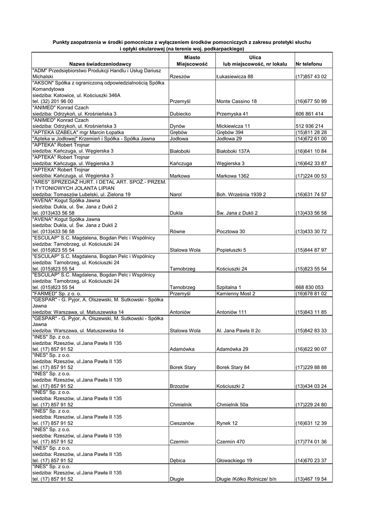 Punkty zaopatrzenia w środki pomocnicze z wyłączeniem środków pomocniczych z zakresu protetyki słuchu i optyki okularowej (na terenie woj. podkarpackiego) Nazwa świadczeniodawcy "ADM" Przedsiębiorstwo Produkcji Handlu i Usług Dariusz Michalski "AKSON" Spółka z ograniczoną odpowiedzialnością Spółka Komandytowa siedziba: Katowice, ul. Kościuszki 346A tel. (32) 201 96 00 "ANIMED" Konrad Czach siedziba: Odrzykoń, ul. Krośnieńska 3 "ANIMED" Konrad Czach siedziba: Odrzykoń, ul. Krośnieńska 3 "APTEKA IZABELA" mgr Marcin Łopatka "Apteka w Jodłowej" Krzemień i Spółka - Spółka Jawna "APTEKA" Robert Trojnar siedziba: Kańczuga, ul. Węgierska 3 "APTEKA" Robert Trojnar siedziba: Kańczuga, ul. Węgierska 3 "APTEKA" Robert Trojnar siedziba: Kańczuga, ul. Węgierska 3 "ARES" SPRZEDAŻ HURT. I DETAL ART. SPOŻ.- PRZEM. I TYTONIOWYCH JOLANTA LIPIAN siedziba: Tomaszów Lubelski, ul. Zielona 19 "AVENA" Kogut Spółka Jawna siedziba: Dukla, ul. Św. Jana z Dukli 2 tel. (013)433 56 58 "AVENA" Kogut Spółka Jawna siedziba: Dukla, ul. Św. Jana z Dukli 2 tel. (013)433 56 58 "ESCULAP" S.C. Magdalena, Bogdan Pelc i Wspólnicy siedziba: Tarnobrzeg, ul. Kościuszki 24 tel. (015)823 55 54 "ESCULAP" S.C. Magdalena, Bogdan Pelc i Wspólnicy siedziba: Tarnobrzeg, ul. Kościuszki 24 tel. (015)823 55 54 "ESCULAP" S.C. Magdalena, Bogdan Pelc i Wspólnicy siedziba: Tarnobrzeg, ul. Kościuszki 24 tel. (015)823 55 54 "FARMED" Sp. z o. o. "GESPAR" - G. Pyjor, A. Olszewski, M. Sutkowski - Spółka Jawna siedziba: Warszawa, ul. Matuszewska 14 "GESPAR" - G. Pyjor, A. Olszewski, M. Sutkowski - Spółka Jawna siedziba: Warszawa, ul. Matuszewska 14 "INES" Sp. z o.o. siedziba: Rzeszów, ul.Jana Pawła II 135 tel. (17) 857 91 52 "INES" Sp. z o.o. siedziba: Rzeszów, ul.Jana Pawła II 135 tel. (17) 857 91 52 "INES" Sp. z o.o. siedziba: Rzeszów, ul.Jana Pawła II 135 tel. (17) 857 91 52 "INES" Sp. z o.o. siedziba: Rzeszów, ul.Jana Pawła II 135 tel. (17) 857 91 52 "INES" Sp. z o.o. siedziba: Rzeszów, ul.Jana Pawła II 135 tel. (17) 857 91 52 "INES" Sp. z o.o. siedziba: Rzeszów, ul.Jana Pawła II 135 tel. (17) 857 91 52 "INES" Sp. z o.o. siedziba: Rzeszów, ul.Jana Pawła II 135 tel. (17) 857 91 52 "INES" Sp. z o.o. siedziba: Rzeszów, ul.Jana Pawła II 135 tel. (17) 857 91 52 Miasto Miejscowość Ulica lub miejscowość, nr lokalu Nr telefonu Rzeszów Łukasiewicza 88 (17)857 43 02 Przemyśl Monte Cassino 18 (16)677 50 99 Dubiecko Przemyska 41 606 861 414 Dynów Grębów Jodłowa Mickiewicza 11 Grębów 394 Jodłowa 29 512 936 214 (15)811 28 28 (14)672 61 00 Białoboki Białoboki 137A (16)641 10 84 Kańczuga Węgierska 3 (16)642 33 87 Markowa Markowa 1362 (17)224 00 53 Narol Boh. Września 1939 2 (16)631 74 57 Dukla Św. Jana z Dukli 2 (13)433 56 58 Równe Pocztowa 30 (13)433 30 72 Stalowa Wola Popiełuszki 5 (15)844 87 97 Tarnobrzeg Kościuszki 24 (15)823 55 54 Tarnobrzeg Przemyśl Szpitalna 1 Kamienny Most 2 668 830 053 (16)678 81 02 Antoniów Antoniów 111 (15)843 11 85 Stalowa Wola Al. Jana Pawła II 2c (15)842 83 33 Adamówka Adamówka 29 (16)622 90 07 Borek Stary Borek Stary 84 (17)229 88 88 Brzozów Kościuszki 2 (13)434 03 24 Chmielnik Chmielnik 50a (17)229 24 80 Cieszanów Rynek 12 (16)631 12 39 Czermin Czermin 470 (17)774 01 36 Dębica Głowackiego 19 (14)670 23 37 Długie Długie /Kółko Rolnicze/ b/n (13)467 19 54 "INES" Sp. z o.o. siedziba: Rzeszów, ul.Jana Pawła II 135 tel. (17) 857 91 52 "INES" Sp. z o.o. siedziba: Rzeszów, ul.Jana Pawła II 135 tel. (17) 857 91 52 "INES" Sp. z o.o. siedziba: Rzeszów, ul.Jana Pawła II 135 tel. (17) 857 91 52 "INES" Sp. z o.o. siedziba: Rzeszów, ul.Jana Pawła II 135 tel. (17) 857 91 52 "INES" Sp. z o.o. siedziba: Rzeszów, ul.Jana Pawła II 135 tel. (17) 857 91 52 "INES" Sp. z o.o. siedziba: Rzeszów, ul.Jana Pawła II 135 tel. (17) 857 91 52 "INES" Sp. z o.o. siedziba: Rzeszów, ul.Jana Pawła II 135 tel. (17) 857 91 52 "INES" Sp. z o.o. siedziba: Rzeszów, ul.Jana Pawła II 135 tel. (17) 857 91 52 "INES" Sp. z o.o. siedziba: Rzeszów, ul.Jana Pawła II 135 tel. (17) 857 91 52 "INES" Sp. z o.o. siedziba: Rzeszów, ul.Jana Pawła II 135 tel. (17) 857 91 52 "INES" Sp. z o.o. siedziba: Rzeszów, ul.Jana Pawła II 135 tel. (17) 857 91 52 "INES" Sp. z o.o. siedziba: Rzeszów, ul.Jana Pawła II 135 tel. (17) 857 91 52 "INES" Sp. z o.o. siedziba: Rzeszów, ul.Jana Pawła II 135 tel. (17) 857 91 52 "INES" Sp. z o.o. siedziba: Rzeszów, ul.Jana Pawła II 135 tel. (17) 857 91 52 "INES" Sp. z o.o. siedziba: Rzeszów, ul.Jana Pawła II 135 tel. (17) 857 91 52 "INES" Sp. z o.o. siedziba: Rzeszów, ul.Jana Pawła II 135 tel. (17) 857 91 52 "INES" Sp. z o.o. siedziba: Rzeszów, ul.Jana Pawła II 135 tel. (17) 857 91 52 "INES" Sp. z o.o. siedziba: Rzeszów, ul.Jana Pawła II 135 tel. (17) 857 91 52 "INES" Sp. z o.o. siedziba: Rzeszów, ul.Jana Pawła II 135 tel. (17) 857 91 52 "INES" Sp. z o.o. siedziba: Rzeszów, ul.Jana Pawła II 135 tel. (17) 857 91 52 "INES" Sp. z o.o. siedziba: Rzeszów, ul.Jana Pawła II 135 tel. (17) 857 91 52 "INES" Sp. z o.o. siedziba: Rzeszów, ul.Jana Pawła II 135 tel. (17) 857 91 52 "INES" Sp. z o.o. siedziba: Rzeszów, ul.Jana Pawła II 135 tel. (17) 857 91 52 "INES" Sp. z o.o. siedziba: Rzeszów, ul.Jana Pawła II 135 tel. (17) 857 91 52 Domaradz Domaradz 323 (13)434 76 60 Frysztak M. Frysztackiego 10 (17)276 09 00 Frysztak M. Frysztackiego 18 (17)277 74 56 Głogów Małopolski Fabryczna 17 (17)851 72 14 Głogów Małopolski Krasickiego 8 783 959 837 Głogów Małopolski Rynek 31 (17)851 81 47 Głowienka Szkolna 2B (13)421 97 31 Gorzyce Por. Sarny 5 (15)836 22 67 Iwonicz-Zdrój Aleja Słoneczna 9 (13)435 00 19 Iwonicz-Zdrój Słoneczna 4 (13)435 02 22 Jabłonica Polska Jabłonica Polska 217 (13)436 30 71 Jarosław 3 Maja 43 (16)621 27 31 Jarosław Jana Pawła II 21 (16)621 14 45 Jarosław Poniatowskiego 53 (16)621 08 88 Jarosław Sikorskiego 2A (16)621 59 19 Jasielnica Rosielna Jasienica Rosielna 216 (13) 420 36 71 Kolbuszowa 