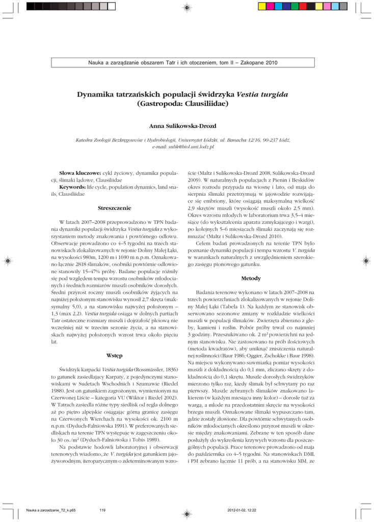 Nauka a zarządzanie obszarem Tatr i ich otoczeniem, tom II – Zakopane 2010 Dynamika tatrzańskich populacji świdrzyka Vestia turgida (Gastropoda: Clausiliidae) Anna Sulikowska−Drozd Katedra Zoologii Bezkręgowców i Hydrobiologii, Uniwersytet Łódzki, ul. Banacha 12/16, 90−237 Łódź, e−mail: [email protected] Słowa kluczowe: cykl życiowy, dynamika popula− cji, ślimaki lądowe, Clausiliidae Keywords: life cycle, population dynamics, land sna− ils, Clausiliidae Streszczenie W latach 2007–2008 przeprowadzono w TPN bada− nia dynamiki populacji świdrzyka Vestia turgida z wyko− rzystaniem metody znakowania i powtórnego odłowu. Obserwacje prowadzono co 4–5 tygodni na trzech sta− nowiskach zlokalizowanych w rejonie Doliny Małej Łąki, na wysokości 980m, 1200 m i 1690 m n.p.m. Oznakowa− no łącznie 2818 ślimaków, osobniki powtórnie odłowio− ne stanowiły 15–47% próby. Badane populacje różniły się pod względem tempa wzrostu osobników młodocia− nych i średnich rozmiarów muszli osobników dorosłych. Średni przyrost roczny muszli osobników żyjących na najniżej położonym stanowisku wynosił 2,7 skręta (mak− symalny 5,0), a na stanowisku najwyżej położonym – 1,3 (max 2,2). Vestia turgida osiąga w dolnych partiach Tatr ostateczne rozmiary muszli i dojrzałość płciową nie wcześniej niż w trzecim sezonie życia, a na stanowi− skach najwyżej położonych wzrost trwa około pięciu lat. Wstęp Świdrzyk karpacki Vestia turgida (Rossmässler, 1836) to gatunek zasiedlający Karpaty, z pojedynczymi stano− wiskami w Sudetach Wschodnich i Szumawie (Riedel 1988). Jest on gatunkiem zagrożonym, wymienionym na Czerwonej Liście – kategoria VU (Wiktor i Riedel 2002). W Tatrach zasiedla różne typy siedlisk od regla dolnego aż po piętro alpejskie osiągając górną granicę zasięgu na Czerwonych Wierchach na wysokości ok. 2100 m n.p.m. (Dyduch−Falniowska 1991). W preferowanych sie− dliskach na terenie TPN występuje w zagęszczeniu oko− ło 30 os./m2 (Dyduch−Falniowska i Tobis 1989). Na podstawie hodowli laboratoryjnej i obserwacji terenowych wiadomo, że V. turgida jest gatunkiem jajo− żyworodnym, iteroparycznym o zdeterminowanym wzro− Nauka a zarzadzanie_T2_k.p65 119 ście (Maltz i Sulikowska−Drozd 2008, Sulikowska−Drozd 2009). W naturalnych populacjach z Pienin i Beskidów okres rozrodu przypada na wiosnę i lato, od maja do sierpnia ślimaki przetrzymują w jajowodzie rozwijają− ce się embriony, które osiągają maksymalną wielkość 2,9 skrętów muszli (wysokość muszli około 2,5 mm). Okres wzrostu młodych w laboratorium trwa 3,5–4 mie− siące (do wykształcenia aparatu zamykającego i wargi), po kolejnych 5–6 miesiącach ślimaki zaczynają się roz− mnażać (Maltz i Sulikowska−Drozd 2010). Celem badań prowadzonych na terenie TPN było poznanie dynamiki populacji i tempa wzrostu V. turgida w warunkach naturalnych z uwzględnieniem szerokie− go zasięgu pionowego gatunku. Metody Badania terenowe wykonano w latach 2007–2008 na trzech powierzchniach zlokalizowanych w rejonie Doli− ny Małej Łąki (Tabela 1). Na każdym ze stanowisk ob− serwowano sezonowe zmiany w rozkładzie wielkości muszli w populacji ślimaków. Zwierzęta zbierano z gle− by, kamieni i roślin. Pobór próby trwał co najmniej 3 godziny. Przeszukiwano ok. 2 m2 powierzchni na jed− nym stanowisku. Nie zastosowano tu prób ilościowych (metoda kwadratów), aby uniknąć zniszczenia natural− nej roślinności (Baur 1986; Oggier, Zschokke i Baur 1998). Na miejscu wykonywano suwmiarką pomiar wysokości muszli z dokładnością do 0,1 mm, zliczano skręty z do− kładnością do 0,1 skrętu. Muszle dorosłych świdrzyków mierzono tylko raz, kiedy ślimak był schwytany po raz pierwszy. Muszle zebranych ślimaków znakowano la− kierem (w każdym miesiącu inny kolor) – dorosłe tuż za wargą, a młode na przedostatnim skręcie na wysokości brzegu muszli. Oznakowane ślimaki wypuszczano tam, gdzie zostały złowione. Dla powtórnie schwytanych osob− ników młodocianych określono przyrost muszli w okre− sie między znakowaniami. Zebrane w ten sposób dane posłużyły do wykreślenia krzywych wzrostu dla poszcze− gólnych populacji. Prace terenowe prowadzono od maja do października co 4–5 tygodni. Na stanowiskach DML i PM zebrano łącznie 11 prób, a na stanowisku MM, ze 2012-01-02, 12:22 120 względu na zaleganie w maju pokrywy śnieżnej – dzie− sięć. W 2008 roku od 5 czerwca do 5 października na każdym ze stanowisk mierzono co godzinę temperaturę powietrza za pomocą rejestratorów Gemini TinyTag za− montowanych 10 cm nad ziemią. Wyniki Na trzech stanowiskach oznakowano łącznie 2818 osobników Vestia turgida, ślimaki ponownie odłowione stanowiły 15–47 % zbioru. Dorosłe Vestia turgida z badanych populacji (kry− terium konchologiczne – wykształcony aparat zamyka− jący i wywinięta warga) różnią się istotnie rozmiara− mi muszli [ANOVA: długość muszli F (2,782) = 545,35; p = 0,0000; liczba skrętów F (2,782) = 209,30; p = 0,0000]. Największe rozmiary osiągają ślimaki z populacji DML – dorastają one średnio do 13,40 mm długości (SD = 0,61) i 9,88 skrętów (SD = 0,36). Najmniejsze muszle występują w populacji MM – średnia długość 11,83 mm (SD = 0,42); 9,28 skrętów (SD = 0,28). Osobniki dorosłe i młodociane obecne były we wszyst− kich próbach (Rycina 1). Latem (czerwiec–sierpień) część młodych budowało ostateczny skręt muszli. Dynamikę populacji Vestia turgida przedstawiono za pomocą histo− gramów pokazujących rozkład wielkości muszli młodo− cianych ślimaków w badanych populacjach (Rycina 2). Najmłodsze osobniki pojawiały się od końca czerwca do sierpnia, a w populacji MM od lipca do sierpnia. Na stanowisku w dolnej części Doliny Małej Łąki szybkie przyrosty muszli obserwowano w czerwcu i lip−