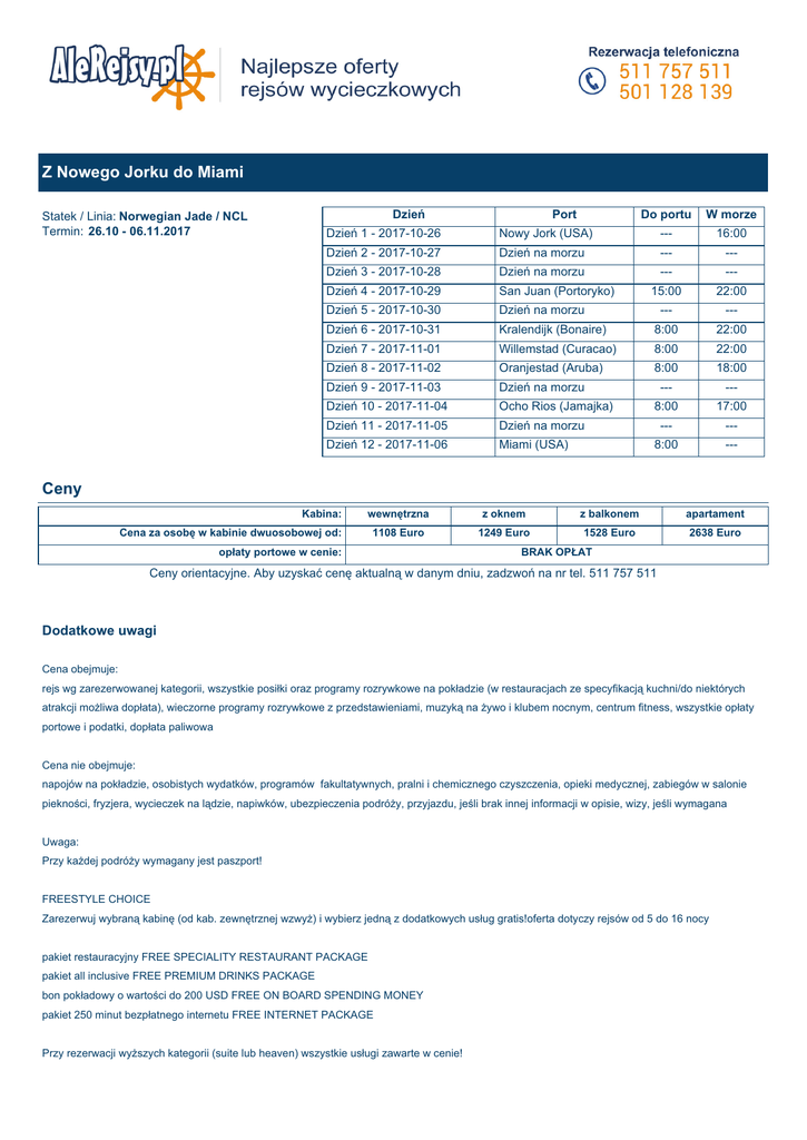 Z Nowego Jorku do Miami Dzień Statek / Linia: Norwegian Jade / NCL Termin: 26.10 - 06.11.2017 Do portu W morze Dzień 1 - 2017-10-26 Nowy Jork (USA) Port --- 16:00 Dzień 2 - 2017-10-27 Dzień na morzu --- --- Dzień 3 - 2017-10-28 Dzień na morzu --- --- Dzień 4 - 2017-10-29 San Juan (Portoryko) 15:00 22:00 Dzień 5 - 2017-10-30 Dzień na morzu --- --- Dzień 6 - 2017-10-31 Kralendijk (Bonaire) 8:00 22:00 Dzień 7 - 2017-11-01 Willemstad (Curacao) 8:00 22:00 Dzień 8 - 2017-11-02 Oranjestad (Aruba) 8:00 18:00 Dzień 9 - 2017-11-03 Dzień na morzu Dzień 10 - 2017-11-04 Ocho Rios (Jamajka) Dzień 11 - 2017-11-05 Dzień na morzu Dzień 12 - 2017-11-06 Miami (USA) --- --- 8:00 17:00 --- --- 8:00 --- Ceny Kabina: wewnętrzna z oknem z balkonem apartament 1108 Euro 1249 Euro 1528 Euro 2638 Euro Cena za osobę w kabinie dwuosobowej od: opłaty portowe w cenie: BRAK OPŁAT Ceny orientacyjne. Aby uzyskać cenę aktualną w danym dniu, zadzwoń na nr tel. 511 757 511 Dodatkowe uwagi Cena obejmuje: rejs wg zarezerwowanej kategorii, wszystkie posiłki oraz programy rozrywkowe na pokładzie (w restauracjach ze specyfikacją kuchni/do niektórych atrakcji możliwa dopłata), wieczorne programy rozrywkowe z przedstawieniami, muzyką na żywo i klubem nocnym, centrum fitness, wszystkie opłaty portowe i podatki, dopłata paliwowa Cena nie obejmuje: napojów na pokładzie, osobistych wydatków, programów fakultatywnych, pralni i chemicznego czyszczenia, opieki medycznej, zabiegów w salonie piekności, fryzjera, wycieczek na lądzie, napiwków, ubezpieczenia podróży, przyjazdu, jeśli brak innej informacji w opisie, wizy, jeśli wymagana Uwaga: Przy każdej podróży wymagany jest paszport! FREESTYLE CHOICE Zarezerwuj wybraną kabinę (od kab. zewnętrznej wzwyż) i wybierz jedną z dodatkowych usług gratis!oferta dotyczy rejsów od 5 do 16 nocy pakiet restauracyjny FREE SPECIALITY RESTAURANT PACKAGE pakiet all inclusive FREE PREMIUM DRINKS PACKAGE bon pokładowy o wartości do 200 USD FREE ON BOARD SPENDING MONEY pakiet 250 minut bezpłatnego internetu FREE INTERNET PACKAGE Przy rezerwacji wyższych kategorii (suite lub heaven) wszystkie usługi zawarte w cenie! Norwegian Jade Norwegian Jade Tonaż: 93.502 ton Rok budowy: 2006 Długość: 295 m Szerokość: 33 m Szybkość: 25 węzłów Pokłady pasażerskie: 12 Załoga: 1.154 Pasażerowie: 2.394 Basen: 2 (4 jacuzzi, basen dla dzieci) Waluta: USD Do dyspozycji: restauracje, bary, kasyno, dyskoteka, sala widowiskowa, salon odnowy biologicznej, fitness center, sauna, jacuzzi, boisko i trasa do joggingu, kort tenisowy oraz do gry w koszykówkę i siatkówkę, salon piękności, pokój zabaw dla dzieci, punkt medyczny, biblioteka, kawiarenka internetowa, 2 symulatory do gry w golfa, sala gier video, butiki, kaplica, muzeum, galeria. Kabiny: łazienka (prysznic, wc, suszarka), klimatyzacja, radio pokładowe, telefon do użytku wewnętrznego, sejf, TV, lodówka. Większość kabin ma 2 pojedyncze łóżka, które na zamówienie można połączyć w 1 podwójne. Opis kabin typu suite i apartamentów na zapytanie.