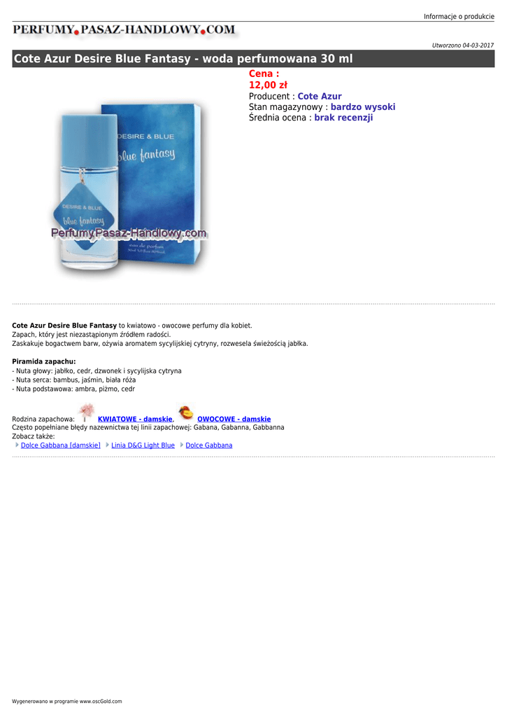 Informacje o produkcie Utworzono 04-03-2017 Cote Azur Desire Blue Fantasy - woda perfumowana 30 ml Cena : 12,00 zł Producent : Cote Azur Stan magazynowy : bardzo wysoki Średnia ocena : brak recenzji Cote Azur Desire Blue Fantasy to kwiatowo - owocowe perfumy dla kobiet. Zapach, który jest niezastąpionym źródłem radości. Zaskakuje bogactwem barw, ożywia aromatem sycylijskiej cytryny, rozwesela świeżością jabłka. Piramida zapachu: - Nuta głowy: jabłko, cedr, dzwonek i sycylijska cytryna - Nuta serca: bambus, jaśmin, biała róża - Nuta podstawowa: ambra, piżmo, cedr Rodzina zapachowa: KWIATOWE - damskie, OWOCOWE - damskie Często popełniane błędy nazewnictwa tej linii zapachowej: Gabana, Gabanna, Gabbanna Zobacz także: Dolce Gabbana [damskie] Linia D&G Light Blue Dolce Gabbana Wygenerowano w programie www.oscGold.com