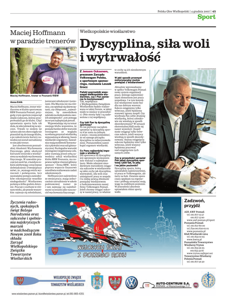 Polska Głos Wielkopolski | 4 grudnia 2007 | 45 Sport Maciej Hoffmann w paradzie trenerów FOT. ARCHIWUM MACIEJA HOFFMANNA. Wielkopolskie wioślarstwo Dyscyplina, siła woli i wytrwałość Z Jensem Ocksenem, prezesem Zarządu Volkswagen Polska, o sportowym sponsoringu, rozmawia Leszek Gracz Maciej Hoffmann, trener w Posnanii/RBW Anna Łbik Maciej Hoffmann, trener wioślarstwa w klubie sportowym RBW Posnania Poznań, przygodę z tym sportem rozpoczął dzięki rodzicom, którzy przyprowadzili go do klubu. Chęć uprawiania sportu była tak duża, że zdecydował się na wyczyn. Trwało to siedem lat i przez cały ten okres nigdy nie przeniósł się do innego klubu, a po zakończeniu kariery zawodniczej został zatrudniony w nim jako trener. Jest absolwentem poznańskiej Akademii Wychowania Fizycznego, gdzie ukończył kierunek trenerski z wioślarstwa na wydziale wychowania fizycznego. W zawodzie pracuje już sześć lat, z każdym rokiem zdobywając coraz lepsze doświadczenie. O swojej pracy mówi, że „wymaga wielu wyrzeczeń i poświęcenia, lecz zauważalny postęp u zawodników rekompensuje wszelkie niedogodności”. Wioślarstwu poświęca kilka godzin dziennie. Pracuje z osobami w różnym wieku, ale przede wszystkim zajmuje się młodzikami, Życzenia radosnych, spokojnych świąt Bożego Narodzenia oraz sukcesów i spełnienia najskrytszych marzeń w nadchodzącym Nowym 2008 Roku składa Zarząd Wielkopolskiego Związku Towarzystw Wioślarskich juniorami młodszymi i juniorami. Dla Macieja nie ma różnicy, czy opiekuje się dziewczętami, czy chłopcami, „najważniejsze, by zawodnikom zależało na doskonaleniu swoich umiejętności”, aon pomaga im w tym najlepiej jak potrafi. Wypowiadając się na temat swojego klubu wspomina, że posiada bardzo dobre warunki treningowe ze względu na własną przystań wioślarską wyposażoną w siłownię, basen wioślarski i ergometry. Zawodnicy mają możliwość korzystania z pływalni oraz sali gimnastycznej. Na dogodne warunki treningowe i wygórowane cele, jakie stawiają przed sobą zawodnicy sekcji wioślarskiej klubu RBW Posnania, ma zapewne wpływ również główny sponsor – firma RBW, który poprzez wsparcie finansowe umożliwia realizowanie zadań szkoleniowych. Hoffmann jest zadowolony ze swojej pracy, mając jednocześnie zatrudnienie w szkole podstawowej numer 36 i tam zajmując się najmłodszymi uczniami jako nauczyciel wychowania fizycznego. Pański poprzednik wspomagał wielkopolskie wioślarstwo, czy i Pan zamierza to kontynuować? Tak, współpraca z Wielkopolskim Związkiem Wioślarskim będzie realizowana w takiej formie, w jakiej miało to miejsce w przeszłości. Obie strony były i są zadowolone z tej współpracy. Czy lubi Pan tę dyscyplinę sportową? Po raz pierwszy zacząłem uprawiać tę dyscyplinę sportu 8 lat temu na jednym z jezior, i muszę powiedzieć, że od samego początku dyscyplina ta zafascynowała mnie. Postanowiłem nawet kupić ergometr wioślarski. Co Panu najbardziej imponuje u wioślarzy? Dla sportowca tej dyscypliny jest ogromnym wyzwaniem móc walczyć o największe laury. Moim zdaniem nieodzownym warunkiem osiągania sukcesów w wioślarstwie są takie cechy jak dyscyplina, wytrwałość, siła woli oraz umiejętność pracy w zespole. I tu widzę pewną zbieżność pomiędzy wioślarstwem a funkcjonowaniem naszej firmy Volkswagen Poznań. Jeżeli chcemy osiągać sukcesy w naszej pracy, to właśnie te cechy są ich nieodzownym warunkiem. FOT. VOLKSWAGEN POZNAŃ W jaki sposób przemysł motoryzacyjny można powiązać z wioślarstwem? Aktualnie wprowadzamy w spółce Volkswagen Poznań nowy system organizacji pracy, którego najistotniejszym elementem jest praca zespołowa. I w tym kontekście wioślarstwo może być dla nas dobrym wzorem. Sukces osiągniemy tylko wówczas, jeżeli będziemy stanowić zgrany zespół. Czy wyobraża Pan sobie drużynę wioślarską, której członkowie nie wiosłują w sposób skoordynowany? W sytuacji ekstremalnej łódź może się nawet wywrócić. Zespół może osiągnąć tylko wówczas sukces, jeżeli wszyscy wiosłują w sposób skoordynowany. Szansę osiągnięcia sukcesu będziemy mieć tylko wówczas, jeżeli wszyscy będziemy pracować nad osiągnięciem tych samych celów. Czy w przeszłości uprawiał Pan jakąś dyscyplinę sportową i jeśli tak, to jaką i na jakim poziomie? Dyscyplinę sportu, którą uprawiałem najintensywniej, to praca w Volkswagenie, ale żarty na bok. Ostatnio sporo czasu spędzam na ergometrze i próbuję utrzymać moją wagę na stabilnym poziomie. W przeszłości aktywnie uprawiałem różne sporty walki. Zadzwoń, przyjdź AZS AWF Poznań tel. 061 877 15 57 061 877 13 90 www.awf.poznan.pl/sport Posnania Poznań tel. 061 827 80 00 tel./fax 061 820 61 01 www.posnania.pl Klub Wioślarski 1904 tel. 061 833 02 93 www.kw04.pl Poznańskie Towarzystwo Wioślarzy Tryton tel. 061 833 36 65 061 833 42 87 www.tryton.najlepsi.net Towarzystwo Wioślarzy Polonia Poznań tel. 061 877 36 30