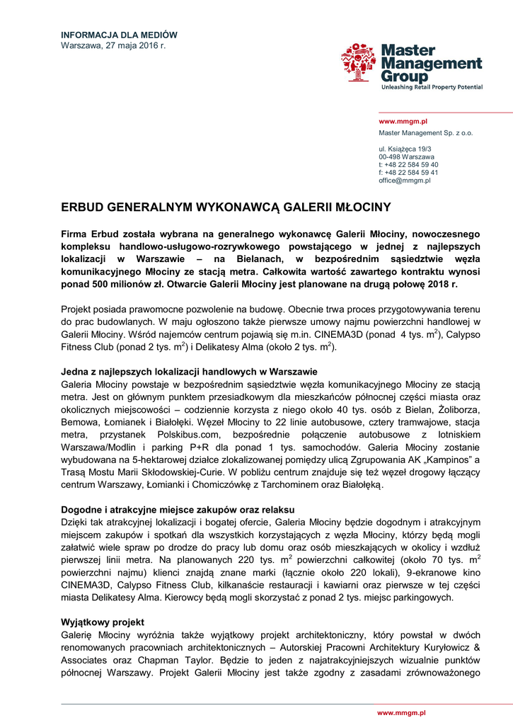 INFORMACJA DLA MEDIÓW Warszawa, 27 maja 2016 r. www.mmgm.pl Master Management Sp. z o.o. ul. Książęca 19/3 00-498 Warszawa t: +48 22 584 59 40 f: +48 22 584 59 41 [email protected] ERBUD GENERALNYM WYKONAWCĄ GALERII MŁOCINY Firma Erbud została wybrana na generalnego wykonawcę Galerii Młociny, nowoczesnego kompleksu handlowo-usługowo-rozrywkowego powstającego w jednej z najlepszych lokalizacji w Warszawie – na Bielanach, w bezpośrednim sąsiedztwie węzła komunikacyjnego Młociny ze stacją metra. Całkowita wartość zawartego kontraktu wynosi ponad 500 milionów zł. Otwarcie Galerii Młociny jest planowane na drugą połowę 2018 r. Projekt posiada prawomocne pozwolenie na budowę. Obecnie trwa proces przygotowywania terenu do prac budowlanych. W maju ogłoszono także pierwsze umowy najmu powierzchni handlowej w Galerii Młociny. Wśród najemców centrum pojawią się m.in. CINEMA3D (ponad 4 tys. m2), Calypso Fitness Club (ponad 2 tys. m2) i Delikatesy Alma (około 2 tys. m2). Jedna z najlepszych lokalizacji handlowych w Warszawie Galeria Młociny powstaje w bezpośrednim sąsiedztwie węzła komunikacyjnego Młociny ze stacją metra. Jest on głównym punktem przesiadkowym dla mieszkańców północnej części miasta oraz okolicznych miejscowości – codziennie korzysta z niego około 40 tys. osób z Bielan, Żoliborza, Bemowa, Łomianek i Białołęki. Węzeł Młociny to 22 linie autobusowe, cztery tramwajowe, stacja metra, przystanek Polskibus.com, bezpośrednie połączenie autobusowe z lotniskiem Warszawa/Modlin i parking P+R dla ponad 1 tys. samochodów. Galeria Młociny zostanie wybudowana na 5-hektarowej działce zlokalizowanej pomiędzy ulicą Zgrupowania AK „Kampinos” a Trasą Mostu Marii Skłodowskiej-Curie. W pobliżu centrum znajduje się też węzeł drogowy łączący centrum Warszawy, Łomianki i Chomiczówkę z Tarchominem oraz Białołęką. Dogodne i atrakcyjne miejsce zakupów oraz relaksu Dzięki tak atrakcyjnej lokalizacji i bogatej ofercie, Galeria Młociny będzie dogodnym i atrakcyjnym miejscem zakupów i spotkań dla wszystkich korzystających z węzła Młociny, którzy będą mogli załatwić wiele spraw po drodze do pracy lub domu oraz osób mieszkających w okolicy i wzdłuż pierwszej linii metra. Na planowanych 220 tys. m2 powierzchni całkowitej (około 70 tys. m2 powierzchni najmu) klienci znajdą znane marki (łącznie około 220 lokali), 9-ekranowe kino CINEMA3D, Calypso Fitness Club, kilkanaście restauracji i kawiarni oraz pierwsze w tej części miasta Delikatesy Alma. Kierowcy będą mogli skorzystać z ponad 2 tys. miejsc parkingowych. Wyjątkowy projekt Galerię Młociny wyróżnia także wyjątkowy projekt architektoniczny, który powstał w dwóch renomowanych pracowniach architektonicznych – Autorskiej Pracowni Architektury Kuryłowicz & Associates oraz Chapman Taylor. Będzie to jeden z najatrakcyjniejszych wizualnie punktów północnej Warszawy. Projekt Galerii Młociny jest także zgodny z zasadami zrównoważonego www.mmgm.pl www.mmgm.pl rozwoju, co potwierdza certyfikat BREEAM. Dwupiętrowy kompleks z czterema kondygnacjami handlowo-usługowymi został zaprojektowany tak, aby korzystać z walorów lokalizacji, w której będzie wybudowany. Dlatego w ramach inwestycji powstanie ogólnodostępna przestrzeń rekreacyjna z widokiem na Las Młociński. Latem będzie to strefa relaksu z ogródkami restauracyjnymi i infrastrukturą zachęcającą do uprawiania sportu (boiska, ścieżki do biegania), a zimą miejsce na pierwsze w Warszawie lodowisko na dachu. Master Management Group (MMG) jest inwestorem, deweloperem, agentem wynajmującym oraz zarządcą nieruchomości handlowych i biurowych zlokalizowanych w całej Polsce. Firma posiada wieloletnie doświadczenie na rynku (w tym roku obchodzi dziesięciolecie działalności) oraz zespół ekspertów, którzy pracowali dla międzynarodowych firm deweloperskich, doradczych oraz zarządzających nieruchomościami, a także funduszy inwestycyjnych. Dzięki temu MMG z powodzeniem samodzielnie realizuje projekty oraz współpracuje z czołowymi deweloperami i inwestorami. Firma jest partnerem na polskim rynku dla największych światowych funduszy oraz innych instytucji inwestujących w nieruchomości, takich jak: Blackstone, Marcol Group, Europa Capital czy CPI. Na zlecenie tych podmiotów, MMG zajmuje się wyszukiwaniem atrakcyjnych możliwości inwestycyjnych na lokalnym rynku nieruchomości handlowych. Oferuje też stałe wsparcie w zakresie zarządzania aktywami oraz nieruchomościami po ich zakupie aż do momentu sprzedaży. 2 Obecnie MMG zarządza ponad 75 tys. m powierzchni handlowej, w tym: Bramą Mazur w Ełku, Galerią Niwa w Oświęcimiu, Galerią Orkana w Lublinie oraz Galerią Sandomierz. Dodatkowo firma odpowiada za wynajem powierzchni w wielofunkcyjnym kompleksie handlowo-biurowym, który powstanie przy ul. Piotrkowskiej 155 w nowym Centrum Przesiadkowym w centralnej części Łodzi. Zarządza także należącym do CPI portfelem nieruchomości biurowych w Polsce (m.in. Central Tower i Prosta 69). Najnowszy projekt MMG to Galeria Młociny – nowoczesny kompleks handlowy o powierzchni 220 tys. m2, który powstaje na warszawskich Bielanach. Więcej informacji na temat firmy pod adresem: www.mmgm.pl Kontakt dla mediów: Master Management Group Karolina Żelazek, [email protected] tel.: +48 22 584 59 40 Questia sp. z o.o. sp.k. Communications Management Consultants Urszula Matej-Bil, [email protected] tel.: +48 535 222 013 Marta Miller, [email protected] tel.: +48 535 222 015 www.mmgm.pl