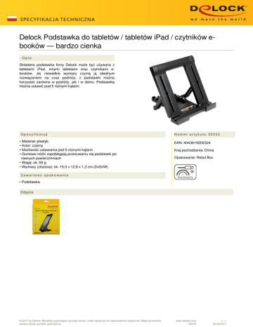 Delock Podstawka do tabletów / tabletów iPad / czytników ebooków — bardzo cienka Opis Składana podstawka firmy Delock może być używana z tabletami iPad, innymi tabletami oraz czytnikami ebooków. Jej niewielkie wymiary czynią ją idealnym rozwiązaniem na czas podróży; z podstawki można korzystać zarówno w podróży, jak i w domu. Podstawkę można ustawić pod 5 różnymi kątami. Specyfikacja • Materiał: plastyk • Kolor: czarny • Możliwość ustawienia pod 5 różnymi kątami • Gumowe nóżki zapobiegają przesuwaniu się podstawki po równych powierzchniach • Waga: ok. 65 g • Wymiary (złożona): ok. 15,0 x 12,8 x 1,2 cm (DxSxW) Numer artykułu 20232 EAN: 4043619202324 Kraj pochodzenia: China Opakowanie: Retail Box Zawartość opakowania • Podstawka Zdjęcia © 2017 by Delock. Wszelkie pojawiające się tutaj nazwy i znaki należą do ich odpowiednich właścicieli. Błędy drukarskie, zmiany & pomyłki zastrzeżone. Powered by TCPDF (www.tcpdf.org) www.delock.com 20232 1/1 04.03.2017