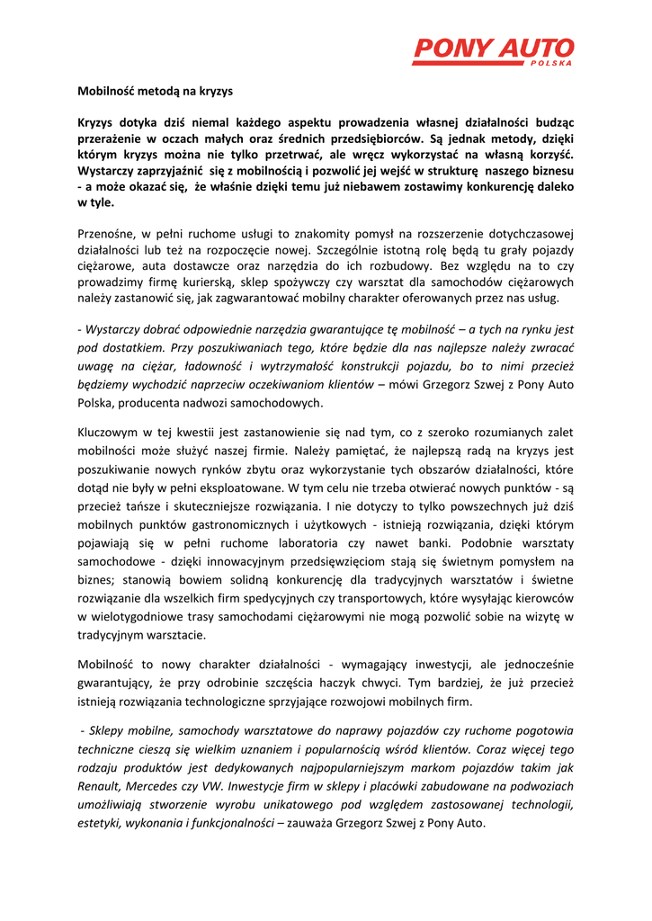 Mobilność metodą na kryzys Kryzys dotyka dziś niemal każdego aspektu prowadzenia własnej działalności budząc przerażenie w oczach małych oraz średnich przedsiębiorców. Są jednak metody, dzięki którym kryzys można nie tylko przetrwać, ale wręcz wykorzystać na własną korzyść. Wystarczy zaprzyjaźnić się z mobilnością i pozwolić jej wejść w strukturę naszego biznesu - a może okazać się, że właśnie dzięki temu już niebawem zostawimy konkurencję daleko w tyle. Przenośne, w pełni ruchome usługi to znakomity pomysł na rozszerzenie dotychczasowej działalności lub też na rozpoczęcie nowej. Szczególnie istotną rolę będą tu grały pojazdy ciężarowe, auta dostawcze oraz narzędzia do ich rozbudowy. Bez względu na to czy prowadzimy firmę kurierską, sklep spożywczy czy warsztat dla samochodów ciężarowych należy zastanowić się, jak zagwarantować mobilny charakter oferowanych przez nas usług. - Wystarczy dobrać odpowiednie narzędzia gwarantujące tę mobilność – a tych na rynku jest pod dostatkiem. Przy poszukiwaniach tego, które będzie dla nas najlepsze należy zwracać uwagę na ciężar, ładowność i wytrzymałość konstrukcji pojazdu, bo to nimi przecież będziemy wychodzić naprzeciw oczekiwaniom klientów – mówi Grzegorz Szwej z Pony Auto Polska, producenta nadwozi samochodowych. Kluczowym w tej kwestii jest zastanowienie się nad tym, co z szeroko rozumianych zalet mobilności może służyć naszej firmie. Należy pamiętać, że najlepszą radą na kryzys jest poszukiwanie nowych rynków zbytu oraz wykorzystanie tych obszarów działalności, które dotąd nie były w pełni eksploatowane. W tym celu nie trzeba otwierać nowych punktów - są przecież tańsze i skuteczniejsze rozwiązania. I nie dotyczy to tylko powszechnych już dziś mobilnych punktów gastronomicznych i użytkowych - istnieją rozwiązania, dzięki którym pojawiają się w pełni ruchome laboratoria czy nawet banki. Podobnie warsztaty samochodowe - dzięki innowacyjnym przedsięwzięciom stają się świetnym pomysłem na biznes; stanowią bowiem solidną konkurencję dla tradycyjnych warsztatów i świetne rozwiązanie dla wszelkich firm spedycyjnych czy transportowych, które wysyłając kierowców w wielotygodniowe trasy samochodami ciężarowymi nie mogą pozwolić sobie na wizytę w tradycyjnym warsztacie. Mobilność to nowy charakter działalności - wymagający inwestycji, ale jednocześnie gwarantujący, że przy odrobinie szczęścia haczyk chwyci. Tym bardziej, że już przecież istnieją rozwiązania technologiczne sprzyjające rozwojowi mobilnych firm. - Sklepy mobilne, samochody warsztatowe do naprawy pojazdów czy ruchome pogotowia techniczne cieszą się wielkim uznaniem i popularnością wśród klientów. Coraz więcej tego rodzaju produktów jest dedykowanych najpopularniejszym markom pojazdów takim jak Renault, Mercedes czy VW. Inwestycje firm w sklepy i placówki zabudowane na podwoziach umożliwiają stworzenie wyrobu unikatowego pod względem zastosowanej technologii, estetyki, wykonania i funkcjonalności – zauważa Grzegorz Szwej z Pony Auto. Ale mobilność to nie tylko gotowe do dowolnego przemieszczania się placówki. To także samo przemieszczanie się – podróże, dostawy oraz związane z nimi trudności czy konsekwencje, w tym prawdziwe zmory kierowców – coraz częstsze fotoradary i kontrole drogowe z ważeniem pojazdów. Rozwiązań problemów przedsiębiorców chcących transportować więcej i taniej jest wcale niemało. Jednym z przykładów dostępnych na rynku są super lekkie kontenery z najlżejszą windą załadunkową. Innowacja ta łączy ze sobą tylną część nadwozia z windą – dając w zamian jedną, praktyczną zabudowę samochodową. Co ważne, dzięki aluminiowym profilom, a także ze względu na umieszczenie windy załadunkowej za tylną osią pojazdu, rozwiązanie to gwarantuje mniejszy od standardowego ciężar nadwozia. To znakomity sposób zoptymalizowanie połączenia lekkości furgonu ze zwiększoną ładownością. Wszystko to idzie w parze z estetyką, wytrzymałością całej konstrukcji i solidną izolacją furgonu. Nie należy przy tym zapominać o komforcie jazdy oraz o bezpieczeństwie samego kierującego pojazdem – producenci coraz częściej oferują także specjalne moduły pełniące jednocześnie trzy funkcje: spoilera dachowego, podwyższenia typu Glob oraz kabiny sypialnej. Co ważne - poszycie ścian tego typu jednostek z laminatu daje do dyspozycji dużą, praktyczną powierzchnię reklamową. Mobilną tak samo, jak cała działalność. - Rozwiązania pokroju kontenera z windą załadowczą czy nowoczesnych furgonów lub kabin sypialnych to nic innego, jak odpowiedź na dzisiejsze potrzeby przedsiębiorców. Producenci coraz częściej stawiają sobie za cel dotrzymanie kroku obecnym trendom. W niektórych aspektach udaje im się te trendy tworzyć i dzięki temu umacniać pozycję na rynku. To ważne z punktu widzenia właściciela firmy – nadmierny załadunek nie tylko naraża na mandaty i konsekwencje prawne, ale także ryzykuje bezpieczeństwo kierowców. Produkty te posiadają certyfikaty jakości ISO 9001 oraz znaki bezpieczeństwa B - oznacza to tyle, że spełniają wszelkie normy techniczne, jakościowe i bezpieczeństwa. Połączenie ich praktycznego wymiaru z innowacyjną ich konstrukcją stanowi świetne rozwiązanie dla tych, którzy chcą przewozić więcej i taniej, zachowując przy tym dbałość o bezpieczeństwo i komfort pracy kierowców – dodaje Grzegorz Szwej z Pony Auto Polska. Pogodzenie niekiedy rygorystycznego prawa oraz podmiotów, które je egzekwują z interesem firmy to dziś jeden z kluczowych czynników warunkujących sukces. Mobilność oraz wynikające z jej zrozumienia innowacyjne rozwiązania dla transportu pozwalają nie tylko podnieść wydajność firmy, ale także stawić czoła kryzysowi w ogóle. - Bo z kryzy