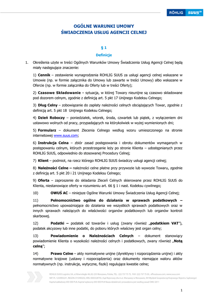 OGÓLNE WARUNKI UMOWY ŚWIADCZENIA USŁUG AGENCJI CELNEJ §1 Definicje 1. Określenia użyte w treści Ogólnych Warunków Umowy Świadczenia Usług Agencji Celnej będą miały następujące znaczenie: 1) Cennik – zestawienie wynagrodzenia ROHLIG SUUS za usługi agencji celnej wskazane w Umowie (np. w formie załącznika do Umowy lub zawarte w treści Umowy) albo wskazane w Ofercie (np. w formie załącznika do Oferty lub w treści Oferty); 2) Czasowe Składowanie - sytuacja, w której Towary nieunijne są czasowo składowane pod dozorem celnym, zgodnie z definicją art. 5 pkt 17 Unijnego Kodeksu Celnego; 3) Dług Celny – zobowiązanie do zapłaty należności celnych obciążających Towar, zgodnie z definicją art. 5 pkt 18 Unijnego Kodeksu Celnego; 4) Dzień Roboczy – poniedziałek, wtorek, środa, czwartek lub piątek, z wyłączeniem dni ustawowo wolnych od pracy, przypadających na którykolwiek w wyżej wymienionych dni; 5) Formularz – dokument Zlecenia Celnego według wzoru umieszczonego na stronie internetowej www.suus.com; 6) Instrukcja Celna – zbiór zasad postępowania i obrotu dokumentów wymaganych w postępowaniu celnym, których przestrzeganie leży po stronie Klienta – udostępnianych przez ROHLIG SUUS, odpowiednio do stosowanej Procedury Celnej; 7) Klient – podmiot, na rzecz którego ROHLIG SUUS świadczy usługi agencji celnej; 8) Należności Celne – należności celne płatne przy przywozie lub wywozie Towaru, zgodnie z definicją art. 5 pkt 20 i 21 Unijnego Kodeksu Celnego; 9) Oferta – zaproszenie do składania Zleceń Celnych skierowane przez ROHLIG SUUS do Klienta, niestanowiące oferty w rozumieniu art. 66 § 1 i nast. Kodeksu cywilnego; 10) OWUŚ AC – niniejsze Ogólne Warunki Umowy Świadczenia Usług Agencji Celnej; 11) Pełnomocnictwo ogólne do działania w sprawach podatkowych – pełnomocnictwo upoważniające do działania we wszystkich sprawach podatkowych oraz w innych sprawach należących do właściwości organów podatkowych lub organów kontroli skarbowej. 12) Podatki – podatek od towarów i usług (zwany również „podatkiem VAT”), podatek akcyzowy lub inne podatki, do poboru których właściwy jest organ celny; 13) Powiadomienie o Należnościach Celnych – dokument stanowiący powiadomienie Klienta o wysokości należności celnych i podatkowych, zwany również „Notą celną”; 14) Prawo Celne – akty normatywne unijne (dyrektywy i rozporządzenia unijne) i akty normatywne krajowe (ustawy i rozporządzenia) oraz dokumenty niemające waloru aktów normatywnych (np. instrukcje, wytyczne, fiszki) regulujące kwestie celne; 1 15) Procedura Celna – jedna z procedur, o których mowa w art. 5 pkt 16 Unijnego Kodeksu Celnego; 16) Procedura Uproszczona – postępowanie, o którym mowa w art. 166 oraz art. 182 Unijnego Kodeksu Celnego; 17) Przepisy Wykonawcze do Unijnego Kodeksu Celnego - wszelkie przepisy unijne i krajowe stanowiące o wykonaniu przepisów Unijnego Kodeksu Celnego, w szczególności Rozporządzenie delegowane Komisji (UE) 2015/2446 z dnia 28 lipca 2015 r. uzupełniające rozporządzenie Parlamentu Europejskiego i Rady (UE) nr 952/2013 w odniesieniu do szczegółowych zasad dotyczących niektórych przepisów unijnego kodeksu celnego, Rozporządzenie wykonawcze Komisji (UE) 2015/2447 z dnia 24 listopada 2015 r. ustanawiające szczegółowe zasady wykonania niektórych przepisów rozporządzenia Parlamentu Europejskiego i Rady (UE) nr 952/2013 ustanawiającego unijny kodeks celny albo stosowne akty prawne zastępujące wyżej przywołane; 18) ROHLIG SUUS –„ROHLIG SUUS Logistics S.A.” z siedzibą w Warszawie (kod pocztowy: 02-235) przy ul. Równoległej 4A, wpisana do rejestru przedsiębiorców Krajowego Rejestru Sądowego pod nr KRS 0000328793, której akta rejestrowe prowadzone są przez Sąd Rejonowy dla m.st. Warszawy, XIII Wydział Gospodarczy, posiadająca NIP 1230993241, o kapitale zakładowym w pełni opłaconym w wysokości 693 000,00 zł; 19) Strona – ROHLIG SUUS albo Klient; 20) Strony – ROHLIG SUUS i Klient; 21) Towar – rzecz ruchoma obejmowana na podstawie Umowy z Klientem określoną Procedurą Celną lub w stosunku do której mają być wykonane inne usługi agencji celnej świadczone przez ROHLIG SUUS; 22) Umowa – zawarta pomiędzy ROHLIG SUUS a Klientem umowa świadczenia usług agencji celnej; 23) Unijny Kodeks Celny – Rozporządzenie Parlamentu Europejskiego i Rady (UE) nr 952/2013 z dnia 9 października 2013 r. ustanawiające unijny kodeks celny (Dz.Urz. L 269 z 10.10.2013 r., str. 1) wraz z późniejszymi zmianami; 24) Upoważnienie bezpośrednie – pełnomocnictwo do reprezentowania Klienta przez ROHLIG SUUS jako przedstawiciel bezpośredni przed organami celnymi; 25) Upoważnienie pośrednie - pełnomocnictwo do reprezentowania Klienta przez ROHLIG SUUS jako przedstawiciel pośredni przed organami celnymi; 26) Ustawa o podatku VAT – ustawa z dnia 11 marca 2004 r. o podatku od towarów i usług (Dz.U. z 2016 r., poz. 710 z późn. zm.); 27) Zgłoszenie Celne – czynność, przez którą w wymaganej formie i w określony sposób wyraża się zamiar objęcia Towaru określoną procedurą celną, zgodnie z definicją art. 5 pkt 12 Unijnego Kodeksu Celnego; 28) Zlecenie Celne – zlecenie Klienta objęcia Towaru określoną Procedurą Celną lub wykonania innych usług agencji celnej świadczonych przez ROHLIG SUUS, złożone w odpowiednim trybie i formie, o których mowa w niniejszych OWUŚ AC. 2 2. Pojęcia występujące w liczbie pojedynczej należy odpowiednio stosować także w liczbie mnogiej, a pojęcia występujące w liczbie mnogiej należy odpowiednio stosować także w liczbie pojedynczej. §2 Przedmiot i zakres OWUŚ AC 1. OWUŚ AC określają zasady i warunki świadczenia przez ROHLIG SUUS na rzecz Klienta usług agencji celnej. 2. OWUŚ AC określają prawa i obowiązki Stron, stanowiąc integralną część Umowy. §3 Umowy 1. 2. 3. 4. 5. 6. 7. 8. Zaw