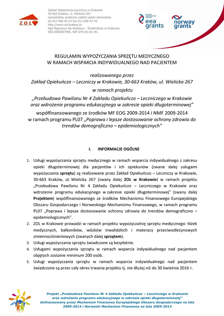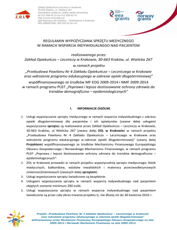 Zakład Opiekuńczo-Leczniczy w Krakowie 30-663 Kraków, ul. Wielicka 267 samodzielny publiczny zakład opieki zdrowotnej tel 012 658-43-24 fax 012 658-43-76 http://www.zol.krakow.pl Sąd Rejonowy dla Krakowa – Śródmieścia w Krakowie KRS 0000057996, NIP 679-20-26-141 REGULAMIN WYPOŻYCZANIA SPRZĘTU MEDYCZNEGO W RAMACH WSPARCIA INDYWIDUALNEGO NAD PACJENTEM realizowanego przez Zakład Opiekuńczo – Leczniczy w Krakowie, 30-663 Kraków, ul. Wielicka 267 w ramach projektu „Przebudowa Pawilonu Nr 4 Zakładu Opiekuńczo – Leczniczego w Krakowie oraz wdrożenie programu edukacyjnego w zakresie opieki długoterminowej” współfinansowanego ze środków MF EOG 2009-2014 i NMF 2009-2014 w ramach programu PL07 „Poprawa i lepsze dostosowanie ochrony zdrowia do trendów demograficzno – epidemiologicznych” I. INFORMACJE OGÓLNE 1. Usługi wypożyczania sprzętu medycznego w ramach wsparcia indywidualnego z zakresu 2. 3. 4. 5. opieki długoterminowej dla pacjentów i ich opiekunów (zwane dalej usługami wypożyczania sprzętu) są realizowane przez Zakład Opiekuńczo – Leczniczy w Krakowie, 30-663 Kraków, ul. Wielicka 267 (zwany dalej ZOL w Krakowie) w ramach projektu „Przebudowa Pawilonu Nr 4 Zakładu Opiekuńczo – Leczniczego w Krakowie oraz wdrożenie programu edukacyjnego w zakresie opieki długoterminowej” (zwany dalej Projektem) współfinansowanego ze środków Mechanizmu Finansowego Europejskiego Obszaru Gospodarczego i Norweskiego Mechanizmu Finansowego, w ramach programu PL07 „Poprawa i lepsze dostosowanie ochrony zdrowia do trendów demograficzno – epidemiologicznych”. ZOL w Krakowie prowadzi w ramach projektu wypożyczalnię sprzętu medycznego: łóżek medycznych, balkoników, wózków inwalidzkich i materacy przeciwodleżynowych zmiennociśnieniowych (zwanych dalej sprzętem). Usługi wypożyczania sprzętu świadczone są bezpłatnie. Usługami wypożyczania sprzętu w ramach wsparcia indywidualnego nad pacjentem objętych zostanie minimum 200 osób. Usługi wypożyczania sprzętu w ramach wsparcia indywidualnego nad pacjentem świadczone są przez cały okres trwania projektu tj. nie dłużej niż do 30 kwietnia 2016 r. Projekt „Przebudowa Pawilonu Nr 4 Zakładu Opiekuńczo – Leczniczego w Krakowie oraz wdrożenie programu edukacyjnego w zakresie opieki długoterminowej” dofinansowany przez Mechanizm Finansowy Europejskiego Obszaru Gospodarczego na lata 2009-2014 i Norweski Mechanizm Finansowy na lata 2009-2014 Zakład Opiekuńczo-Leczniczy w Krakowie 30-663 Kraków, ul. Wielicka 267 samodzielny publiczny zakład opieki zdrowotnej tel 012 658-43-24 fax 012 658-43-76 http://www.zol.krakow.pl Sąd Rejonowy dla Krakowa – Śródmieścia w Krakowie KRS 0000057996, NIP 679-20-26-141 II. CEL WSPARCIA ORAZ ZAKRES USŁUG 1. Głównym celem usług wypożyczania sprzętu dla pacjentów i ich opiekunów jest zapewnienie wsparcia umożliwiającego realizację opieki długoterminowej nad pacjentem w środowisku domowym. Celem stworzenia systemu usług wypożyczania sprzętu medycznego jest także spowodowanie, by osoby starsze, przewlekle chore, niepełnosprawne, czasowo lub trwale niesamodzielne, wymagające fachowej pomocy w związku z przewlekłą niepełnosprawnością jak najdłużej mogły pozostawać w swoim środowisku domowym, w bezpiecznych dla ich zdrowia warunkach. 2. Osoby korzystające z usług wypożyczania sprzętu mogą jednocześnie skorzystać ze wsparcia w postaci doradztwa indywidualnego prowadzonego przez ZOL w Krakowie. Zakres usług ww. doradztwa określa Regulamin usług doradztwa indywidualnego z zakresu opieki długoterminowej dla pacjentów i ich opiekunów. Usługa doradztwa indywidualnego realizowana jest w ramach zadania „rozwój wsparcia indywidualnego nad pacjentem”, projektu „Przebudowa Pawilonu Nr 4 Zakładu Opiekuńczo – Leczniczego w Krakowie oraz wdrożenie programu edukacyjnego w zakresie opieki długoterminowej” współfinansowanego ze środków Mechanizmu Finansowego Europejskiego Obszaru Gospodarczego i Norweskiego Mechanizmu Finansowego, w ramach programu PL07 „Poprawa i lepsze dostosowanie ochrony zdrowia do trendów demograficzno – epidemiologicznych”. Usługa doradztwa świadczona jest bezpłatnie. III. GRUPA DOCELOWA 1. Z usługi wypożyczania sprzętu skorzystać mogą: Pacjenci tj. osoby starsze1 i/lub przewlekle chore i/lub niepełnosprawne, czasowo lub trwale niesamodzielne, wymagające pomocy, Opiekunowie pacjentów (osób starszych i/lub przewlekle chorych i/lub niepełnosprawnych, czasowo lub trwale niesamodzielnych, wymagających pomocy). 2. Przynależność poszczególnych osób do grupy docelowej objętej usługami wypożyczania sprzętu w ramach projektu oceniona zostanie przez ZOL w Krakowie na etapie rekrutacji, według założeń Programu PL07 „Poprawa i lepsze dostosowanie ochrony zdrowia do trendów demograficzno – epidemiologicznych”. 1 osoby powyżej 60 roku życia. Projekt „Przebudowa Pawilonu Nr 4 Zakładu Opiekuńczo – Leczniczego w Krakowie oraz wdrożenie programu edukacyjnego w zakresie opieki długoterminowej” dofinansowany przez Mechanizm Finansowy Europejskiego Obszaru Gospodarczego na lata 2009-2014 i Norweski Mechanizm Finansowy na lata 2009-2014 Zakład Opiekuńczo-Leczniczy w Krakowie 30-663 Kraków, ul. Wielicka 267 samodzielny publiczny zakład opieki zdrowotnej tel 012 658-43-24 fax 012 658-43-76 http://www.zol.krakow.pl Sąd Rejonowy dla Krakowa – Śródmieścia w Krakowie KRS 0000057996, NIP 679-20-26-141 3. W zależności od rodzaju choroby, niepełnosprawności lub zagrożenia zdrowotnego oraz z uwzględnieniem indywidualnych możliwości motorycznych pacjent/opiekun pacjenta otrzymuje odpowiedni sprzęt. 4. Usługi wypożyczania sprzętu w ramach wsparcia indywidualnego nad pacjentem realizowane są na terenie województwa małopolskiego. IV. ZASADY WYPOŻYCZANIA SPRZĘTU 1. Osoba (pacjent i/lub opiekun) ubiegająca się o wypożyczanie sprz