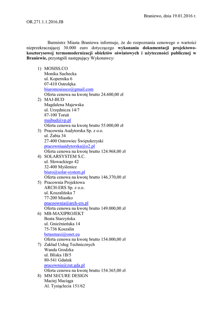 Braniewo, dnia 19.01.2016 r. OR.271.1.1.2016.JB Burmistrz Miasta Braniewa informuje, że do rozpoznania cenowego o wartości nieprzekraczającej 30.000 euro dotyczącego wykonania dokumentacji projektowokosztorysowej termomodernizacji obiektów oświatowych i użyteczności publicznej w Braniewie, przystąpili następujący Wykonawcy: 1) MOSISS.CO Monika Suchecka ul. Kopernika 6 07-410 Ostrołęka [email protected] Oferta cenowa na kwotę brutto 24.600,00 zł 2) MAJ-BUD Magdalena Majewska ul. Urzędnicza 14/7 87-100 Toruń [email protected] Oferta cenowa na kwotę brutto 55.000,00 zł 3) Pracownia Audytorska Sp. z o.o. ul. Żabia 34 27-400 Ostrowiec Świętokrzyski [email protected] Oferta cenowa na kwotę brutto 124.968,00 zł 4) SOLARSYSTEM S.C. ul. Słowackiego 42 32-400 Myślenice [email protected] Oferta cenowa na kwotę brutto 146.370,00 zł 5) Pracownia Projektowa ARCH-ERS Sp. z o.o. ul. Koszalińska 7 77-200 Miastko [email protected] Oferta cenowa na kwotę brutto 149.000,00 zł 6) MB-MAXIPROJEKT Beata Starzyńska ul. Gnieźnieńska 14 75-736 Koszalin [email protected] Oferta cenowa na kwotę brutto 154.000,00 zł 7) Zakład Usług Technicznych Wanda Grodzka ul. Bliska 1B/5 80-541 Gdańsk [email protected] Oferta cenowa na kwotę brutto 154.365,00 zł 8) MM SECURE DESIGN Maciej Maciąga Al. Tysiąclecia 151/62 03-740 Warszawa [email protected] Oferta cenowa na kwotę brutto 166.665,00 zł 9) ATELIER HARMOZA Marika Harmoza ul. Pomorska 20/2 81-314 Gdańsk [email protected] Oferta cenowa na kwotę brutto 209.010,00 zł 10) EURO-PROJEKT Zbigniew Kuśmierz ul. Królewiecka 195a 82-300 Elbląg [email protected] Oferta cenowa na kwotę brutto 212.790,00 zł 11) AKROTERION BIS ul. Tysiąclecia 10/11 87-200 Wąbrzeźno [email protected] Oferta cenowa na kwotę brutto 280.000,00 zł Z uwagi na fakt, iż MOSISS.CO, Monika Suchecka z Ostrołęki zaproponowała najniższą cenę za wykonanie przedmiotu zamówienia, Zamawiający wybiera w/w ofertę jako najkorzystniejszą.