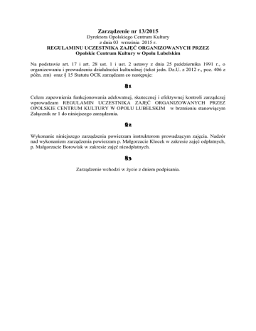 Zarządzenie nr 13/2015 Dyrektora Opolskiego Centrum Kultury z dnia 03 września 2015 r. REGULAMINU UCZESTNIKA ZAJĘĆ ORGANIZOWANYCH PRZEZ Opolskie Centrum Kultury w Opolu Lubelskim Na podstawie art. 17 i art. 28 ust. 1 i ust. 2 ustawy z dnia 25 października 1991 r., o organizowaniu i prowadzeniu działalności kulturalnej (tekst jedn. Dz.U. z 2012 r., poz. 406 z późn. zm) oraz § 15 Statutu OCK zarządzam co następuje: §1 Celem zapewnienia funkcjonowania adekwatnej, skutecznej i efektywnej kontroli zarządczej wprowadzam REGULAMIN UCZESTNIKA ZAJĘĆ ORGANIZOWANYCH PRZEZ OPOLSKIE CENTRUM KULTURY W OPOLU LUBELSKIM w brzmieniu stanowiącym Załącznik nr 1 do niniejszego zarządzenia. §2 Wykonanie niniejszego zarządzenia powierzam instruktorom prowadzącym zajęcia. Nadzór nad wykonaniem zarządzenia powierzam p. Małgorzacie Klocek w zakresie zajęć odpłatnych, p. Małgorzacie Borowiak w zakresie zajęć nieodpłatnych. §3 Zarządzenie wchodzi w życie z dniem podpisania. Załącznik nr 1 do zarządzenia nr 13/2015 Dyrektora OCK z dnia 03 września 2015 r. REGULAMIN UCZESTNIKA ZAJĘĆ ORGANIZOWANYCH PRZEZ OPOLSKIE CENTRUM KULTURY W OPOLU LUBELSKIM Postanowienia ogólne 1. 2. 3. 4. 5. 6. 7. 8. 9. 10. §1 Zgodnie ze Statutem Opolskiego Centrum Kultury w Opolu Lubelskim (dalej OCK) celem działalności OCK jest rozwój aktywności kulturalnej dzieci i młodzieży z udziałem osób dorosłych – wychowanie młodego człowieka do odbioru i tworzenia kultury w poszanowaniu dziedzictwa kulturowego regionu, kraju i innych narodów. Cel ten realizowany jest między innymi poprzez prowadzenie zajęć edukacyjnych w zakresie różnych dziedzin sztuki (muzyka, śpiew, taniec, teatr, plastyka, recytacja, zajęcia ruchowe, i inne), prezentacja i promocja amatorskiego ruchu artystycznego oraz twórczości profesjonalnej (koncerty, spektakle, recitale, konkursy, konfrontacje, turnieje, przeglądy, pokazy, kiermasze, wystawy i inne), działania w zakresie profilaktyki przemocy i uzależnień (warsztaty edukacyjne, prelekcje, konkursy tematyczne, programy artystyczne, i inne). Uczestnikami zajęć organizowanych przez OCK mogą być dzieci, młodzież i dorośli. Zapisy na zajęcia odbywają się w sekretariacie OCK i bezpośrednio u instruktora OCK prowadzącego zajęcia zgodne z zainteresowaniem uczestnika. Uczestnikiem zajęć może być osoba, która: a) wyraża chęć systematycznego uczestnictwa w zajęciach zgodnych ze swoimi zainteresowaniami, b) akceptuje i realizuje regulamin uczestnika zajęć, c) wnosi obowiązujące w danym okresie opłaty miesięczne określone w aktualnie obowiązującym cenniku uczestnictwa w zajęciach OCK W przypadku osób niepełnoletnich wymagane jest pisemne oświadczenie rodziców lub opiekunów prawnych, w którym między innymi wyrażają zgodę na uczestnictwo dziecka w wybranej formie zajęć oraz na przetwarzanie danych osobowych (wzór oświadczenia stanowi Załącznik nr 1 do regulaminu uczestnika zajęć). Osoby pełnoletnie wyrażające wolę uczestniczenia w zajęciach są zobowiązane do złożenia pisemnego oświadczenia według wzoru stanowiącego Załącznik nr 2 do regulaminu uczestnika zajęć. Zajęcia odbywają się zgodnie z przyjętym przez Dyrektora OCK harmonogramem zajęć. W przypadku choroby instruktora bądź innej losowej przyczyny uniemożliwiającej odbycie się zajęć OCK zapewnia zastępstwo. W przypadku niemożności zorganizowania zastępstwa OCK zastrzega sobie prawo odwołania zajęć. Informacja o prowadzonych zajęciach dostępna jest na stronie internetowej OCK, w drukowanych materiałach informacyjnych oraz w siedzibie OCK przy ul. Lubelskiej 30 w Opolu Lubelskim Obecność uczestników zajęć kontrolowana jest przez instruktorów prowadzących zajęcia. Dokumentem potwierdzającym obecność na zajęciach jest prowadzony przez 11. 12. 13. 14. instruktora dziennik zajęć oraz lista obecności uczestnika zajęć według wzoru stanowiącego Załącznik Nr 3 Harmonogram zajęć i indywidualny czas trwania zajęć ustalony jest z Dyrektorem na podstawie grafiku przygotowanego przez instruktora prowadzącego zajęcia. OCK zastrzega sobie prawo do zmian w harmonogramie zajęć, o czym poinformuje uczestników lub rodziców/opiekunów uczestników zajęć (e-mailem, telefonicznie, osobiście) Odwołanie, przeniesienie lub odpracowanie zajęć może nastąpić w terminie ustalonym przez Dyrektora OCK w porozumieniu z instruktorem po wcześniejszym powiadomieniu o tym fakcie uczestników zajęć. Podczas zajęć uczestnik znajduje się pod opieką instruktora. Rodzic/opiekun prawny jest zobowiązany do odebrania dziecka bezpośrednio po zajęciach, lub złożenia pisemnego oświadczenia o samodzielnym powrocie uczestnika do domu, a także podania niezbędnych danych osobowych dziecka oraz telefonów kontaktowych. 15. W razie potrzeby rodzice/opiekunowie, uczestnicy pełnoletni proszeni są o informację dotyczącą przyjmowanych leków, wskazań lub przeciwskazań lekarskich do udziału w zajęciach. 16. Rodzic/opiekun dziecka w wieku przedszkolnym w czasie trwania zajęć powinien przebywać na terenie obiektu, w którym prowadzone są zajęcia OCK. 17. Uczestników zajęć/prób obowiązuje zakaz przenoszenia bez wiedzy instruktora elementów wyposażenia pracowni do innych pomieszczeń OCK. 18. Wynoszenie elementów wyposażenia pracowni lub sali poza budynek OCK przez uczestników zajęć/prób możliwe jest wyłącznie po uzyskaniu zgody na pisemnie złożony wniosek i na zasadach określonych przez Dyrektora OCK. 19. Zasady korzystania z materiałów udostępnianych przez OCK oraz normy materiałowe określa dyrektor OCK. Informację na ten temat oraz szczegółowe zasady odbywania się danych zajęć zobowiązani są przekazywać uczestnikom instruktorzy prowadzący zajęcia. 20. Prace plastyczne powstałe podczas zajęć w pracowni ceramiki są własnością OCK. 21. OCK nie zobowiązuje się do pilnowania i przech
