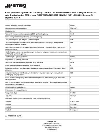 Karta produktu zgodna z ROZPORZĄDZENIEM DELEGOWANYM KOMISJI (UE) NR 65/2014 z dnia 1 października 2013 r. oraz ROZPORZĄDZENIEM KOMISJI (UE) NR 66/2014 z dnia 14 stycznia 2014 r. Nazwa dostawcy lub znak towarowy SMEG Identyfikator modelu dostawcy TR4110IP Liczba komór 3 Wskaźnik efektywności energetycznej EEI - piekarnik główny 104.9 Klasa efektywności energetycznej - piekarnik główny A Zużycie energii na cykl w trybie z termoobiegem 0.95 Zużycie energii przy standardowym obciążeniu w trybie z włączonym wentylatorem (kWh/cykl) - piekarnik główny 0.85 GAZ - Zużycie energii przy standardowym obciążeniu w trybie tradycyjnym (kWh/cykl) piekarnik główny 0 GAZ -Zużycie energii przy standardowym obciążeniu w trybie z włączonym wentylatorem (kWh/cykl) - piekarnik główny 0 Źródło ciepła - główny piekarnik Elektro Pojemność (l) - główny piekarnik 61 Wskaźnik efektywności energetycznej, drugi piekarnik 104.9 Klasa efektywności energetycznej, drugi piekarnik A Zużycie energii przy standardowym obciążeniu w trybie tradycyjnym (kWh/cykl) - drugi piekarnik 0.95 Zużycie energii przy standardowym obciążeniu w trybie z włączonym wentylatorem (kWh/cykl) - drugi piekarnik 0.85 GAZ - Zużycie energii przy standardowym obciążeniu w trybie tradycyjnym (kWh/cykl) drugi piekarnik 0 GAZ -Zużycie energii przy standardowym obciążeniu w trybie z włączonym wentylatorem (kWh/cykl) - drugi piekarnik 0 Źródło ciepła, drugi piekarnik Elektro Pojemność (l) - drugi piekarnik 61 Waga netto (kg) 143.400 Typ płyty Indukcja Iłość stref grzewczych i / lub obszarów i / lub palników gazowych 5 Sterfa 1 Przedni lewy Sterfa 2 Tylny lewy Sterfa 3 Centralny Sterfa 4 Tylny prawy 23 września 2016 Smeg S.p.A. Via Leonardo da Vinci, 4 42016 Guastalla (RE), Italy Tel. 0039 05228211 [email protected] Sterfa 5 Przedni prawy Technologia grzewcza strefa 1 Indukcja - pojedyńcza Technologia grzewcza strefa 2 Indukcja - pojedyńcza Technologia grzewcza strefa 3 Indukcja - pojedyńcza Technologia grzewcza strefa 4 Indukcja - pojedyńcza Technologia grzewcza strefa 5 Indukcja - pojedyńcza Śriednica lub długość / szerokość strefy 1 17.5 Śriednica lub długość / szerokość strefy 2 21.5 Śriednica lub długość / szerokość strefy 3 26.5 Śriednica lub długość / szerokość strefy 4 21.5 Śriednica lub długość / szerokość strefy 5 17.5 Zużycie energii, strefa 1 176.7 Zużycie energii, strefa 2 182.6 Zużycie energii, strefa 3 142 Zużycie energii, strefa 4 182.6 Zużycie energii, strefa 5 176.7 Zużycie energii dla płyty 172.1 23 września 2016 Smeg S.p.A. Via Leonardo da Vinci, 4 42016 Guastalla (RE), Italy Tel. 0039 05228211 [email protected]