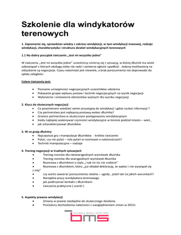 Szkolenie dla windykatorów terenowych 1. Zapoznanie się, sprawdzian wiedzy z zakresu windykacji, w tym windykacji masowej, rodzaje windykacji, charakterystyka i struktura działań windykacyjnych terenowych 1.1 Na dobry początek ćwiczenie „Jest mi wszystko jedno” W ćwiczeniu „Jest mi wszystko jedno” uczestniczy zmierzą się z sytuacją, w której dłużnik ma wiele zobowiązań z których obsługą sobie nie radzi i zamierza ogłosić upadłość . Jedyną możliwością na odzyskanie są negocjacje. Czasu natomiast jest niewiele, a brak porozumienia nie doprowadzi do spłaty zaległości Celem ćwiczenia jest: Poznanie umiejętności negocjacyjnych uczestników szkolenia Pokazanie grupie wpływu postaw i technik negocjacyjnych na wynik negocjacji Wyłonienie i omówienie elementów ważnych dla wyniku negocjacji 2. Klucz do skutecznych negocjacji Co powinienem wiedzieć zanim przystąpię do windykacji i gdzie szukać informacji ? Czy partnerstwo jest najlepszą postawą wobec dłużnika? Granice partnerstwa w skutecznym postępowaniu windykacyjnym kiedy najlepiej wykonywać czynności windykacyjne w terenie podział miasto – wieś , jak zcharakteryzować dłużników 3. W co grają dłużnicy Najczęstsze gry i manipulacje dłużników - krótkie ćwiczenie Pytać, czy nie pytać – rola pytań w rozmowie o należnościach? Techniki manipulacyjne – rodzaje 4. Trening negocjacji w trudnych sytuacjach Trening rozmów dla niewiarygodnych wymówek dłużnika Trening rozmów dla wiarygodnych wymówek dłużnika Rozmowa z dłużnikiem o stylu „i tak mi nic nie zrobicie” Rozmowa z dłużnikiem, który „już składał deklarację, że wpłaci i nie wywiązał się z niej” czy warto zawierać porozumienia ratalne – ugody , jeżeli tak na jakich warunkach? Narzędzia pracy windykatora terenowego jak podtrzymać kontakt z dłużnikiem ćwiczenia praktyczne ( scenki ) 5. Aspekty prawne windykacji Zmiany w prawie niezbędne do skutecznego działania Procedury dochodzenia należności z uwzględnieniem zmian w 2015r. Co nam wolno zrobić, a czego nie w kontekście zachodzących zmian? 6. Skip tracing Gdzie mogę znaleźć informacje dot. dłużnika Jak w praktyce odnaleźć jego majątek 7. Targowanie jako gra Scenki do przećwiczenia Ad. 1 Przewidywany test wiedzy ok . 10 -ciu pytań z zakresu windykacji, by ustalić zakres wiedzy windykatorów: Kiedy w jakich godzinach według Zasad Dobrych Praktyk Widykacyjnych i Procedur KNF możemy wykonywać wizyty bezpośrednie u dłużników? Co się dzieje kiedy dług jest przedawniony, czy możemy go dalej windykować ? Jaką maksymalnie kwotę pieniędzy możemy jednorazowo przyjąć gotówką od dłużnika ? Ile możemy wykonać wizyt bezpośrednich u dłużnika w jednym tygodniu? Jakie narzędzia pracy posiada Windykator Bezpośredni - podaj przynajmniej trzy możliwe. Nie zastając dłużnika w miejscu działania - co możemy pozostawić mu w celu pozyskania kontaktu? Co to Jest Europejski Tytuł Egzekucyjny dla Roszczeń Bezspornych ? Czy możemy prowadzić czynności windykacyjne w sytuacji gdy dłużnik posiada Postanowienie o Umorzeniu Postępowania Egzekucyjnego? Jeżeli tak to dlaczego? Jakie są prawa wierzyciela w myśl przepisów Kodeksu Cywilnego ? Jakie są obowiązki dłużnika w myśl przepisów Kodeksu Cywilnego ? Ad. 1.1 Trzy scenki: negocjacje z dłużnikiem z wynikiem negatywnym negocjacje z dłużnikiem z wynikiem pozytywnym pobór środków pieniężnych negocjacje z dłużnikiem z wynikiem pozytywnym zawarcie porozumienia ratalnego – ugody . Ad.2. Pkt.1 - Metody uzyskania informacji o dłużniku , zadłużeniu, majątku dłużnika. Pkt.2 i 3 - Wspólna dyskusja na przedmiotowy temat. Pkt.4 - Analiza podziału wykonywania czynności windykacyjnych w klasyfikacji wieś - miasto oraz podział ze względu na czas – godziny wykonywania wizyt - tabela wskaźnikowa. Pkt.5 - Opis typów dłużników - wspólne omówienie tematu charakterystyka na zasadzie przypisanych kolorów do poszczególnych typów. Ad. 3 i 4 Scenki do przećwiczenia i omówienia , gdzie jednym z głównych elementów będzie zadawanie pytań dłużnikowi, oraz jak zbijać argumenty dłużnika. Ad. 5 Prawo Upadłościowe Zmiany jakie weszły w życie w 2015r. Kodeks Karny wybrane aspekty na co warto zwrócić uwagę w wykonywaniu czynności windykacyjnych. Ad. 6 Omówienie działania skip tracingu i cyber tracingu jako metod poszukiwania kontaktu z dłużnkiem.