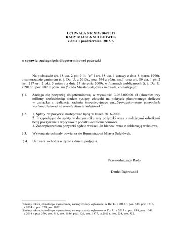 UCHWAŁA NR XIV/104/2015 RADY MIASTA SULEJÓWEK z dnia 1 października 2015 r. w sprawie: zaciągnięcia długoterminowej pożyczki Na podstawie art. 18 ust. 2 pkt 9 lit. "c" i art. 58 ust. 1 ustawy z dnia 8 marca 1990r. o samorządzie gminnym (t. j. Dz. U. z 2013r., poz. 594 z późn. zm.)1 oraz art. 89 ust. 1 pkt 2 iart. 217 ust. 2 pkt. 3 ustawy z dnia 27 sierpnia 2009r. o finansach publicznych (t. j. Dz. U. z 2013r., poz. 885 z późn. zm.)2Rada Miasta Sulejówek uchwala, co następuje: § 1. Zaciąga się pożyczkę długoterminową w wysokości 3.067.000,00 zł (słownie: trzy miliony sześćdziesiąt siedem tysięcy złotych) na pokrycie planowanego deficytu w związku z realizacją zadania inwestycyjnego pn.„Uporządkowanie gospodarki wodno-ściekowej na terenie Miasta Sulejówek”. § 2. 1. Spłaty rat pożyczki następować będą w latach 2016-2020. 2. Przypadające do spłaty w danym roku raty pożyczki wraz z należnymi odsetkami będą pokrywane z wpływów z podatku od nieruchomości. 3. Zabezpieczeniem pożyczki będzie weksel „In blanco” wraz z deklaracją wekslową. § 3. Wykonanie uchwały powierza się Burmistrzowi Miasta Sulejówek. § 4. Uchwała wchodzi w życie z dniem podjęcia. Przewodniczący Rady Daniel Dąbrowski 1 Zmiany tekstu jednolitego wymienionej ustawy zostały ogłoszone w Dz. U. z 2013 r., poz. 645, poz. 1318, z 2014 r., poz. 379,poz. 1072. 2 Zmiany tekstu jednolitego wymienionej ustawy zostały ogłoszone w Dz. U. z 2013 r., poz. 938, poz. 1646, z 2014 r. poz. 379, poz. 911, poz. 1146, poz.1626, poz. 1877, z 2015 r. poz. 238, poz. 532. Uzasadnienie Przedkładam, Radzie Miasta, projekt uchwały w sprawie zaciągnięcia pożyczki, do właściwości której należy podejmowanie uchwał w sprawie zaciągania zobowiązań finansowych długoterminowych. W uchwale budżetowej na 2015 rok zostało wprowadzone zadanie inwestycyjne pn. „Uporządkowanie gospodarki wodno-ściekowej na terenie Miasta Sulejówek”, które finansowane będzie w kwocie 3.067.000,00 zł. z zaciągniętej pożyczki.