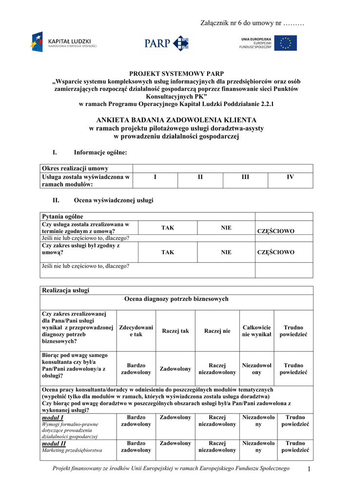 Załącznik nr 6 do umowy nr ……… ZaZa PROJEKT SYSTEMOWY PARP „Wsparcie systemu kompleksowych usług informacyjnych dla przedsiębiorców oraz osób zamierzających rozpocząć działalność gospodarczą poprzez finansowanie sieci Punktów Konsultacyjnych PK” w ramach Programu Operacyjnego Kapitał Ludzki Poddziałanie 2.2.1 ANKIETA BADANIA ZADOWOLENIA KLIENTA w ramach projektu pilotaŜowego usługi doradztwa-asysty w prowadzeniu działalności gospodarczej I. Informacje ogólne: Okres realizacji umowy Usługa została wyświadczona w ramach modułów: II. I II III IV Ocena wyświadczonej usługi Pytania ogólne Czy usługa została zrealizowana w terminie zgodnym z umową? Jeśli nie lub częściowo to, dlaczego? Czy zakres usługi był zgodny z umową? TAK NIE TAK NIE CZĘŚCIOWO CZĘŚCIOWO Jeśli nie lub częściowo to, dlaczego? Realizacja usługi Ocena diagnozy potrzeb biznesowych Czy zakres zrealizowanej dla Pana/Pani usługi wynikał z przeprowadzonej Zdecydowani diagnozy potrzeb e tak biznesowych? Biorąc pod uwagę samego konsultanta czy był/a Pan/Pani zadowolony/a z obsługi? Bardzo zadowolony Raczej tak Zadowolony Całkowicie nie wynikał Trudno powiedzieć Raczej Niezadowol niezadowolony ony Trudno powiedzieć Raczej nie Ocena pracy konsultanta/doradcy w odniesieniu do poszczególnych modułów tematycznych (wypełnić tylko dla modułów w ramach, których wyświadczona została usługa doradztwa) Czy biorąc pod uwagę doradztwo w poszczególnych obszarach usługi był/a Pan/Pani zadowolona z wykonanej usługi? Bardzo Zadowolony Raczej Niezadowolo Trudno moduł I Wymogi formalno-prawne zadowolony niezadowolony ny powiedzieć dotyczące prowadzenia działalności gospodarczej moduł II Marketing przedsiębiorstwa Bardzo zadowolony Zadowolony Raczej niezadowolony Niezadowolo ny Trudno powiedzieć Projekt finansowany ze środków Unii Europejskiej w ramach Europejskiego Funduszu Społecznego 1 Załącznik nr 6 do umowy nr ……… ZaZa moduł III Organizacja przedsiębiorstwa moduł IV Finanse przedsiębiorstwa Bardzo zadowolony Bardzo zadowolony Zadowolony Raczej niezadowolony Niezadowolo ny Trudno powiedzieć Zadowolony Raczej niezadowolony Niezadowolo ny Trudno powiedzieć Ogólna ocena usługi doradczej Na ile, biorąc wszystko pod uwagę był/a Pan/Pani zadowolony/a z tej usługi? Bardzo zadowolony Zadowolony Raczej zadowolony Niezadowolony Trudno powiedzieć Proszę uzasadnić: Przydatność W jakim stopniu wyświadczona usługa była przydatna w aspektach prowadzenia działalności gospodarczej w Pana/Pani przedsiębiorstwie? W jakim stopniu wyświadczona usługa wpłynęła na poprawę funkcjonowania Pana/Pani firmy? Zdecydowani e tak Bardzo waŜna kluczowa Raczej Tak Raczej nie Umiarkowani Mało waŜnae waŜna nieistotna Zdecydowanie nie Trudno powiedzieć Nie waŜna Trudno powiedzieć Zdecydowan ie nie Trudno powiedzieć Opinie klienta Czy uwaŜa Pan/Pani, Ŝe usługi doradcze świadczonej Zdecydowani w formie asysty e tak odpowiadają na potrzeby przedsiębiorcy? Czy byłby Pan/Pani gotów ponownie zapłacić za Zdecydowani moŜliwość skorzystania z e tak podobnej usługi ale np. w innym zakresie? Ile gotów byłby Pan(i) zapłacić z usługę doradztwa 50-100 zł o podobnym zakresie do usługi asysty? Raczej Tak Raczej nie Raczej Tak Raczej nie Zdecydowan ie nie Trudno powiedzieć 100-150 zł 150-200 zł 200-250 zł Pow. 250 zł Jakiego dodatkowego wsparcia w zakresie prowadzenia działalności gospodarczej potrzebowałby/potrzebowałaby Pan/Pani jako przedsiębiorca? Informacje dotyczące przedsiębiorcy Prosimy o podanie kilku danych dotyczących Pana/Pani firmy Wielkość przedsiębiorstwa Samozatrudn ienie Mikro Małe Średnie DuŜe Forma prawna Projekt finansowany ze środków Unii Europejskiej w ramach Europejskiego Funduszu Społecznego 2 Załącznik nr 6 do umowy nr ……… ZaZa prowadzonej działalności Okres prowadzonej działalności Do 6 miesięcy Od 6 do 12 miesięcy Od roku do 5 lat Od 5 do 10 lat Pow. 10 lat Zakres podstawowej działalności Pana/Pani firmy Pana/Pani uwagi dotyczące przeprowadzonej usługi doradczej (o co naleŜy uzupełnić usługę, sugestie dotyczące obsługi przez konsultanta, itp.) .................................................................... miejscowość i data Projekt finansowany ze środków Unii Europejskiej w ramach Europejskiego Funduszu Społecznego 3