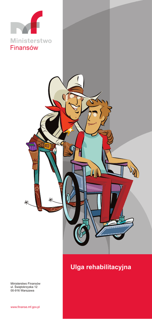 Ulga rehabilitacyjna Ministerstwo Finansów ul. Świętokrzyska 12 00-916 Warszawa www.finanse.mf.gov.pl 1 2 Ministerstwo Finansów Lorem rehabilitacyjna* Ulga ipsum dolor Jeżeli jesteś osobą niepełnosprawną lub masz na utrzymaniu osobę niepełnosprawną, sprawdź, czy poniesione przez Ciebie wydatki na cele rehabilitacyjne oraz wydatki związane z ułatwieniem wykonywania czynności życiowych uprawniają do ulgi w podatku dochodowym od osób fizycznych. Jeśli tak, to możesz je uwzględnić przy obliczaniu podatku. UWAGA! Każda ulga podatkowa to przywilej, z którego możesz skorzystać tylko wtedy, gdy spełnisz wszystkie warunki. Urząd skarbowy ma prawo sprawdzić poprawność dokonanych odliczeń. WYJAŚNIENIE NAJWAŻNIEJSZYCH POJĘĆ Osoba niepełnosprawna – to osoba, która posiada: • orzeczenie o zakwalifikowaniu przez organy orzekające do jednego z trzech stopni niepełnosprawności lub • decyzję przyznającą rentę z tytułu całkowitej lub częściowej niezdolności do pracy, rentę szkoleniową albo rentę socjalną, albo • orzeczenie o niepełnosprawności osoby, która nie ukończyła 16. roku życia, wydane na podstawie odrębnych przepisów, • orzeczenie o niepełnosprawności, wydane przez właściwy organ na podstawie odrębnych przepisów obowiązujących do dnia 31 sierpnia 1997 r. Osoba niepełnosprawna zaliczona do I grupy inwalidzkiej – to osoba, w stosunku do której orzeczono całkowitą niezdolność do pracy oraz niezdolność do samodzielnej egzystencji albo znaczny stopień niepełnosprawności. *Stan prawny obowiązujący w 2013 r. www.finanse.mf.gov.pl 1 Osoba niepełnosprawna zaliczona do II grupy inwalidzkiej – to osoba, w stosunku do której orzeczono całkowitą niezdolność do pracy albo umiarkowany stopień niepełnosprawności. Osoba niepełnosprawna pozostająca na utrzymaniu podatnika – to osoba niepełnosprawna, której roczne dochody nie przekraczają kwoty 9120 zł, będąca dla podatnika: współmałżonkiem, dzieckiem własnym, dzieckiem przysposobionym, dzieckiem obcym przyjętym na wychowanie, pasierbem, rodzicem, rodzicem współmałżonka, rodzeństwem, ojczymem, macochą, zięciem lub synową. WYDATKI UPRAWNIAJĄCE DO ODLICZEŃ Nie każdy wydatek dotyczący osoby niepełnosprawnej uprawnia do odliczeń w ramach ulgi rehabilitacyjnej. Odliczeniu podlegają wyłącznie te wydatki poniesione przez osobę niepełnosprawną lub podatnika mającego na utrzymaniu taką osobę, które zostały wymienione w ustawie o podatku dochodowym od osób fizycznych1, jako wydatki na cele rehabilitacyjne oraz wydatki związane z ułatwieniem wykonywania czynności życiowych. WYDATKI UPRAWNIAJĄCE DO ODLICZEŃ dzielą się na WYDATKI NIELIMITOWANE (odliczeniu podlega cała wydatkowana kwota) WYDATKI LIMITOWANE (kwotę przysługującego odliczenia oblicza się z uwzględnieniem „górnego” lub „dolnego” limitu kwotowego) Wydatki nielimitowane – należą do nich wydatki poniesione na: • adaptację i wyposażenie mieszkań oraz budynków mieszkalnych, stosownie do potrzeb wynikających z niepełnosprawności, 1 Art.26 ust. 7a ustawy o podatku dochodowym od osób fizycznych. 2 Ministerstwo Finansów • przystosowanie pojazdów mechanicznych do potrzeb wynikających z niepełnosprawności, • zakup i naprawę indywidualnego sprzętu, urządzeń i narzędzi technicznych niezbędnych w rehabilitacji oraz ułatwiających wykonywanie czynności życiowych, stosownie do potrzeb wynikających z niepełnosprawności, z wyjątkiem sprzętu gospodarstwa domowego, • zakup wydawnictw i materiałów (pomocy) szkoleniowych, stosownie do potrzeb wynikających z niepełnosprawności, • odpłatny pobyt na turnusie rehabilitacyjnym, • odpłatny pobyt na leczeniu w zakładzie lecznictwa uzdrowiskowego, pobyt w zakładzie rehabilitacji leczniczej, zakładach opiekuńczo-leczniczych i pielęgnacyjno-opiekuńczych oraz odpłatność za zabiegi rehabilitacyjne, • opiekę pielęgniarską w domu nad osobą niepełnosprawną w okresie przewlekłej choroby uniemożliwiającej poruszanie się oraz usługi opiekuńcze świadczone dla osób niepełnosprawnych zaliczonych do I grupy inwalidztwa, • opłacenie tłumacza języka migowego, • kolonie i obozy dla dzieci i młodzieży niepełnosprawnej oraz dzieci osób niepełnosprawnych, które nie ukończyły 25. roku życia, • odpłatny, konieczny przewóz na niezbędne zabiegi leczniczo-rehabilitacyjne: -- osoby niepełnosprawnej - karetką transportu sanitarnego, -- osoby niepełnosprawnej zaliczonej do I lub II grupy inwalidztwa oraz dzieci niepełnosprawnych do lat 16, również innymi niż karetka środkami transportu sanitarnego, • odpłatne przejazdy środkami transportu publicznego związane z pobytem: -- na turnusie rehabilitacyjnym, -- w zakładach lecznictwa uzdrowiskowego, zakładach rehabilitacji leczniczej, zakładach opiekuńczo-leczniczych i pielęgnacyjno-opiekuńczych, -- na koloniach i obozach dla dzieci i młodzieży niepełnosprawnej oraz dzieci osób niepełnosprawnych, które nie ukończyły 25. roku życia. www.finanse.mf.gov.pl 3 Wydatki limitowane – należą do nich wydatki poniesione na: • opłacenie przewodników osób niewidomych zaliczonych do I lub II grupy inwalidztwa oraz osób z niepełnosprawnością narządu ruchu zaliczonych do I grupy inwalidztwa – maksymalna kwota odliczenia w roku podatkowym wynosi 2280 zł, • utrzymanie przez osoby niewidome i niedowidzące zaliczone do I lub II grupy inwalidztwa oraz osoby z niepełnosprawnością narządu ruchu zaliczone do I grupy inwalidztwa psa asystującego, o którym mowa w ustawie o rehabilitacji zawodowej i społecznej oraz zatrudnianiu osób niepełnosprawnych, tj. odpowiednio wyszkolonego i specjalnie oznaczonego psa (np. psa przewodnika), który ułatwia osobie niepełnosprawnej aktywne uczestnictwo w życiu społecznym – maksymalna kwota odliczenia w roku podatkowym wynosi 2280 zł, • używ