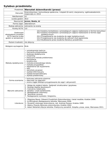 Sylabus przedmiotu Przedmiot: Warsztat dziennikarski (prasa) Dziennikarstwo i komunikacja społeczna, I stopień [6 sem], stacjonarny, ogólnoakademicki, Kierunek: rozpoczęty w: 2014 Rok/Semestr: I/2 Liczba godzin: 30,0 Nauczyciel: Jarosz, Beata, dr Forma zajęć: laboratorium Rodzaj zaliczenia: zaliczenie na ocenę Punkty ECTS: 3,0 10,0 Godziny kontaktowe z prowadzącym zajęcia realizowane w formie konsultacji 30,0 Godziny kontaktowe z prowadzącym zajęcia realizowane w formie zajęć dydaktycznych 20,0 Przygotowanie się studenta do zajęć dydaktycznych 15,0 Przygotowanie się studenta do zaliczeń i/lub egzaminów 15,0 Studiowanie przez studenta literatury przedmiotu Godzinowe ekwiwalenty punktów ECTS (łączna liczba godzin w semestrze): Poziom trudności: nie dotyczy Wstępne wymagania: Brak. • • • • • • • Metody dydaktyczne: • • • • • • • • autoekspresja twórcza ćwiczenia przedmiotowe dyskusja dydaktyczna e-learning klasyczna metoda problemowa konsultacje korekta prac metoda przewodniego tekstu metoda przypadków objaśnienie lub wyjaśnienie opis warsztaty grupowe wykład informacyjny wykład konwersatoryjny wykład problemowy • końcowe zaliczenie pisemne Forma oceniania: • obecność na zajęciach • ocena ciągła (bieżące przygotowanie do zajęć i aktywność) 1. 2. 3. Warunki zaliczenia: 4. 5. 6. 7. 1. 2. Literatura: 3. 4. 5. Wstęp do redakcji tekstu. Spójność strukturalna i językowa. Rodzaje błędów językowych. Ćwiczenia redakcyjne. Korekta i znaki korektorskie. Redagowanie informacji. Tworzenie recenzji. Redagowanie wywiadu i biogramu. Zbigniew Bauer, Edward Chudziński,Dziennikarstwo i świat mediów, Kraków 2000. Jo Billingham,Redagowanie tekstów, Warszawa 2006. Poradnik zielonego dziennikarza, red. Andrzej Żwawa, Kraków 1999 Walery Pisarek,Retoryka dziennikarska, Kraków 2002. Adam Wolański,Edycja tekstów. Praktyczny poradnik. Książka, prasa, www , Warszawa 2011.
