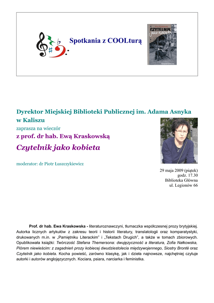 Spotkania z COOLturą Dyrektor Miejskiej Biblioteki Publicznej im. Adama Asnyka w Kaliszu zaprasza na wieczór z prof. dr hab. Ewą Kraskowską Czytelnik jako kobieta moderator: dr Piotr Łuszczykiewicz 29 maja 2009 (piątek) godz. 17.30 Biblioteka Główna ul. Legionów 66 Prof. dr hab. Ewa Kraskowska - literaturoznawczyni, tłumaczka współczesnej prozy brytyjskiej. Autorka licznych artykułów z zakresu teorii i historii literatury, translatologii oraz komparatystyki, drukowanych m.in. w „Pamiętniku Literackim” i „Tekstach Drugich”, a także w tomach zbiorowych. Opublikowała książki: Twórczość Stefana Themersona: dwujęzyczność a literatura, Zofia Nałkowska, Piórem niewieścim: z zagadnień prozy kobiecej dwudziestolecia międzywojennego, Siostry Brontë oraz Czytelnik jako kobieta. Kocha powieść, zarówno klasykę, jak i dzieła najnowsze, najchętniej czytuje autorki i autorów anglojęzycznych. Kociara, psiara, narciarka i feministka. ZAPROSZENIE Miejska Biblioteka Publiczna im. Adama Asnyka w Kaliszu posiada CERTYFIKAT za wybitne osiągnięcia w ochronie dziedzictwa kulturowego Ziemi Kaliskiej Instytucja finansowana z budżetu miasta Kalisza