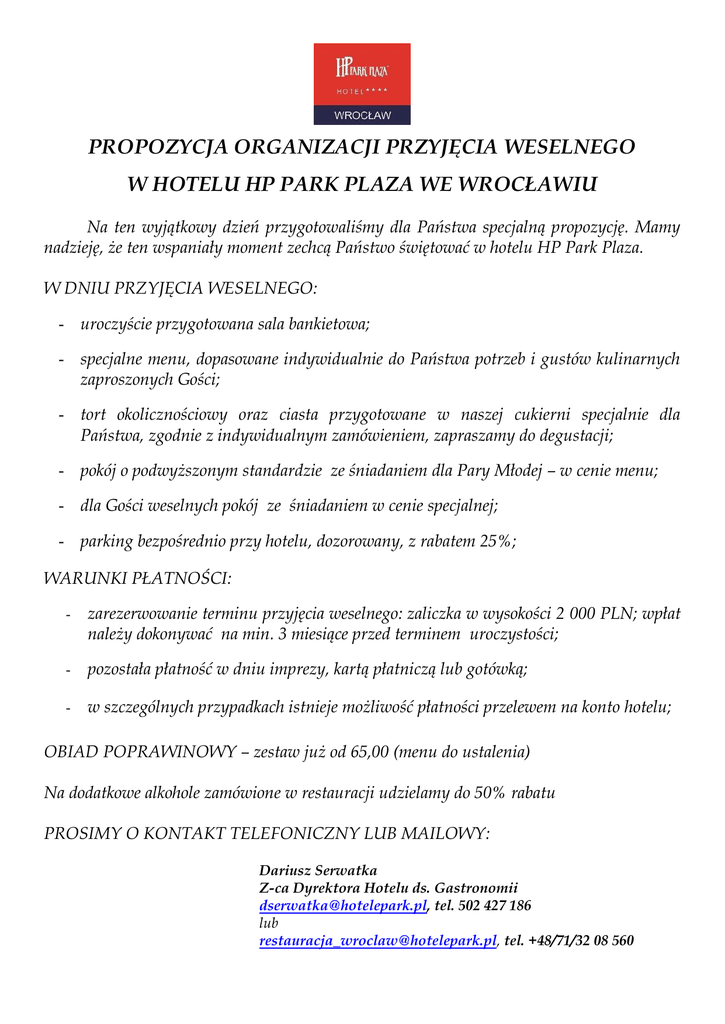 PROPOZYCJA ORGANIZACJI PRZYJĘCIA WESELNEGO W HOTELU HP PARK PLAZA WE WROCŁAWIU Na ten wyjątkowy dzień przygotowaliśmy dla Państwa specjalną propozycję. Mamy nadzieję, że ten wspaniały moment zechcą Państwo świętować w hotelu HP Park Plaza. W DNIU PRZYJĘCIA WESELNEGO: - uroczyście przygotowana sala bankietowa; - specjalne menu, dopasowane indywidualnie do Państwa potrzeb i gustów kulinarnych zaproszonych Gości; - tort okolicznościowy oraz ciasta przygotowane w naszej cukierni specjalnie dla Państwa, zgodnie z indywidualnym zamówieniem, zapraszamy do degustacji; - pokój o podwyższonym standardzie ze śniadaniem dla Pary Młodej – w cenie menu; - dla Gości weselnych pokój ze śniadaniem w cenie specjalnej; - parking bezpośrednio przy hotelu, dozorowany, z rabatem 25%; WARUNKI PŁATNOŚCI: - zarezerwowanie terminu przyjęcia weselnego: zaliczka w wysokości 2 000 PLN; wpłat należy dokonywać na min. 3 miesiące przed terminem uroczystości; - pozostała płatność w dniu imprezy, kartą płatniczą lub gotówką; - w szczególnych przypadkach istnieje możliwość płatności przelewem na konto hotelu; OBIAD POPRAWINOWY – zestaw już od 65,00 (menu do ustalenia) Na dodatkowe alkohole zamówione w restauracji udzielamy do 50% rabatu PROSIMY O KONTAKT TELEFONICZNY LUB MAILOWY: Dariusz Serwatka Z-ca Dyrektora Hotelu ds. Gastronomii [email protected], tel. 502 427 186 lub [email protected], tel. +48/71/32 08 560 PROPOZYCJE MENU (DO WYBORU) zestaw w cenie 250PLN/osoba Powitanie chlebem, solą i winem musującym STARTER Mus z wędzonego pstrąga na sałacie OBIAD Bulion z filetem drobiowym i makaronem Schab pieczony z jabłkami i trawą żubrową Rolada z indyka faszerowana pomidorami suszonymi i bazylią Bitki wołowe w sosie pieczeniowym Krokiety ziemniaczane Ziemniaki gotowane Kluski śląskie Zestaw surówek, warzywa gotowane DESER Patera ciast bankietowych Patera owoców ZAKĄSKI ZIMNE Rostbef z kremem chrzanowym Schab aromatyzowany rozmarynem i grzybami Półmisek wędlin: szynka wędzona, kabanosy, indyk wędzony, salami Łosoś sous vide podawany na sałatce z kopru włoskiego Śledź w kremie jabłkowo - cebulowym Omlet szpinakowy z musem cielęcym Roladka z serem i warzywami Sałatka makaronowa z kurczakiem i suszonymi pomidorami Sałatka z tuńczykiem i jajkiem Warzywa świeże i konserwowe Pieczywo, masło smakowe TORT OKOLICZNOŚCIOWY- SMAK I FORMA DO USTALENIA GORĄCA KOLACJA(serwowana przez kucharza) Mix mięs dolnośląskich z pieczonego warchlaka: szynka, łopatka, boczek, karczek Sos pieczeniowy, ziemniaki w ziołach Barszcz z kulebiakiem NAPOJE (bez ograniczeń) Kawa, herbata, woda, wybór soków NAPOJE ALKOHOLOWE DO USTALENIA zestaw w cenie 270 PLN/osoba Powitanie chlebem, solą i winem musującym STARTER Polędwica wieprzowa aromatyzowana trawą żubrową na sałacie z grzybami OBIAD Consommé z indyka z kluseczkami Kotlety schabowe z grilla z salsą pomidorową Zrazy wołowe zawijane w sosie pieczeniowym Łosoś ze szpinakiem w ziołowym sosie Kluski śląskie, krokiety ziemniaczane, ziemniaki z koperkiem Warzywa gotowane, sałata z ziołowym vinegrette DESER Patera ciast bankietowych Patera owoców ZAKĄSKI ZIMNE Terrina z sandacza i krewetek Parfait z łososia w glonach nori Koreczki śledziowe Pieczony rostbef z karczochami i chrzanem Pierś z indyka faszerowana koprem włoskim i estragonem Pieczeń wieprzowa aromatyzowana gorczycą Półmisek wędlin Pasztet z dzika z orzechami Patera serów z owocami Sałatka z serem feta i pestkami słonecznika Sałatka z indyka wędzonego i ananasa Warzywa świeże i konserwowe TORT OKOLICZNOŚCIOWY - SMAK I FORMA DO USTALENIA GORĄCA KOLACJA(serwowana przez kucharza) Szynka pieczona w pomarańczach, sos grzybowy, ziemniaki pieczone Barszcz z kulebiakiem NAPOJE (bez ograniczeń) Kawa, herbata, woda, wybór soków NAPOJE ALKOHOLOWE DO USTALENIA Menu weselne w cenie 300PLN/osoba Powitanie chlebem, solą i winem musującym STARTER Górka cielęca sous vide na sałatce z rukoli i suszonych pomidorów OBIAD Zupa krem z borowików Comber jagnięcy sous-vide na warzywach Polędwiczki wieprzowe w sosie truflowym Filet z sandacza zapiekany z pomidorem i mozzarellą Knedle z bułki Ziemniaki z koperkiem Warzywa gotowane, sałatka z sosem vinegrette, szparagi w sosie cytrynowym, mus z marchewki DESER Patera ciast bankietowych Patera owoców ZAKĄSKI ZIMNE Sum wędzony na sałacie z selera naciowego Sandacz faszerowany krewetkami Mus z łososia w glonach nori Filet z kaczki sous vide na pikantnej sałatce z gruszki Roladki z polędwiczki wieprzowej z musem drobiowo - truflowym Pieczony rostbef z kremem chrzanowym i szparagami Mus z dzika w omlecie szpinakowym z żurawiną Mini babeczki faszerowane pastą jajeczną i serową z warzywami Mini tortille z pastą serowo - warzywną Sałatka z krewetkami i koprem włoskim Mix sałat z serem kozim i pestkami dyni TORT OKOLICZNOŚCIOWY - SMAK I FORMA DO USTALENIA GORĄCA KOLACJA(serwowana przez kucharza) Pieczony udziec cielęcy aromatyzowany rozmarynem, czosnkiem i suszonymi pomidorami Barszcz z pasztecikiem NAPOJE (bez ograniczeń) Kawa, Herbata, woda, wybór soków, Napoje gazowane (coca-cola, sprite itp.) NAPOJE ALKOHOLOWE DO USTALENIA Menu weselne w cenie 400PLN/osoba Powitanie truskawkami w czekoladzie z winem musującym STARTER Comber z jelenia na sałatce z marynowanymi kurkami i żurawiną OBIAD Krem z krewetek Polędwica wołowa w sosie truflowym Pierś z kaczki sous vide w sosie pomarańczowo - imbirowym Jesiotr sous vide w kremie z kopru włoskiego i raków Kluski francuskie, tymbaliki z sera i kaszy gryczanej z grzybami, ryż z warzywami, szparagi w sosie, mus z marchewki z serem DESER Bufet ciast bankietowych Patera owoców Fontanna czekoladowa BUFET ZIMNY Sushi mix (łosoś, tuńczyk, warzywa) przygotowany przez kucharza na sali Rolada z sandacza i krewetek Parafait z łososia z kwaśną śmietaną Pierś z gęsi na sałatce z pomidorów i awokado Górka 