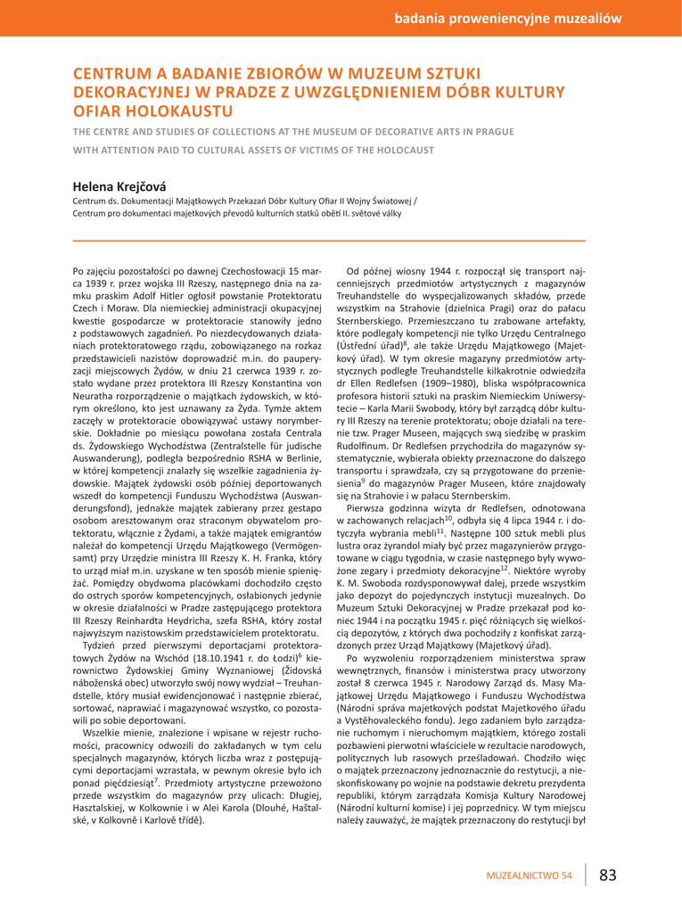 badania proweniencyjne muzealiów CENTRUM A BADANIE ZBIORÓW W MUZEUM SZTUKI DEKORACYJNEJ W PRADZE Z UWZGLĘDNIENIEM DÓBR KULTURY OFIAR HOLOKAUSTU THE CENTRE AND STUDIES OF COLLECTIONS AT THE MUSEUM OF DECORATIVE ARTS IN PRAGUE WITH ATTENTION PAID TO CULTURAL ASSETS OF VICTIMS OF THE HOLOCAUST Helena Krejčová Centrum ds. Dokumentacji Majątkowych Przekazań Dóbr Kultury Ofiar II Wojny Światowej / Centrum pro dokumentaci majetkových převodů kulturních statků obě II. světové války Po zajęciu pozostałości po dawnej Czechosłowacji 15 marca 1939 r. przez wojska III Rzeszy, następnego dnia na zamku praskim Adolf Hitler ogłosił powstanie Protektoratu Czech i Moraw. Dla niemieckiej administracji okupacyjnej kwes e gospodarcze w protektoracie stanowiły jedno z podstawowych zagadnień. Po niezdecydowanych działaniach protektoratowego rządu, zobowiązanego na rozkaz przedstawicieli nazistów doprowadzić m.in. do pauperyzacji miejscowych Żydów, w dniu 21 czerwca 1939 r. zostało wydane przez protektora III Rzeszy Konstan na von Neuratha rozporządzenie o majątkach żydowskich, w którym określono, kto jest uznawany za Żyda. Tymże aktem zaczęły w protektoracie obowiązywać ustawy norymberskie. Dokładnie po miesiącu powołana została Centrala ds. Żydowskiego Wychodźstwa (Zentralstelle für judische Auswanderung), podległa bezpośrednio RSHA w Berlinie, w której kompetencji znalazły się wszelkie zagadnienia żydowskie. Majątek żydowski osób później deportowanych wszedł do kompetencji Funduszu Wychodźstwa (Auswanderungsfond), jednakże majątek zabierany przez gestapo osobom aresztowanym oraz straconym obywatelom protektoratu, włącznie z Żydami, a także majątek emigrantów należał do kompetencji Urzędu Majątkowego (Vermögensamt) przy Urzędzie ministra III Rzeszy K. H. Franka, który to urząd miał m.in. uzyskane w ten sposób mienie spieniężać. Pomiędzy obydwoma placówkami dochodziło często do ostrych sporów kompetencyjnych, osłabionych jedynie w okresie działalności w Pradze zastępującego protektora III Rzeszy Reinhardta Heydricha, szefa RSHA, który został najwyższym nazistowskim przedstawicielem protektoratu. Tydzień przed pierwszymi deportacjami protektoratowych Żydów na Wschód (18.10.1941 r. do Łodzi)6 kierownictwo Żydowskiej Gminy Wyznaniowej (Židovská náboženská obec) utworzyło swój nowy wydział – Treuhandstelle, który musiał ewidencjonować i następnie zbierać, sortować, naprawiać i magazynować wszystko, co pozostawili po sobie deportowani. Wszelkie mienie, znalezione i wpisane w rejestr ruchomości, pracownicy odwozili do zakładanych w tym celu specjalnych magazynów, których liczba wraz z postępującymi deportacjami wzrastała, w pewnym okresie było ich ponad pięćdziesiąt7. Przedmioty artystyczne przewożono przede wszystkim do magazynów przy ulicach: Długiej, Hasztalskiej, w Kolkownie i w Alei Karola (Dlouhé, Haštalské, v Kolkovně i Karlově třídě). Od późnej wiosny 1944 r. rozpoczął się transport najcenniejszych przedmiotów artystycznych z magazynów Treuhandstelle do wyspecjalizowanych składów, przede wszystkim na Strahovie (dzielnica Pragi) oraz do pałacu Sternberskiego. Przemieszczano tu zrabowane artefakty, które podlegały kompetencji nie tylko Urzędu Centralnego (Ústřední úřad)8, ale także Urzędu Majątkowego (Majetkový úřad). W tym okresie magazyny przedmiotów artystycznych podległe Treuhandstelle kilkakrotnie odwiedziła dr Ellen Redlefsen (1909–1980), bliska współpracownica profesora historii sztuki na praskim Niemieckim Uniwersytecie – Karla Marii Swobody, który był zarządcą dóbr kultury III Rzeszy na terenie protektoratu; oboje działali na terenie tzw. Prager Museen, mających swą siedzibę w praskim Rudolfinum. Dr Redlefsen przychodziła do magazynów systematycznie, wybierała obiekty przeznaczone do dalszego transportu i sprawdzała, czy są przygotowane do przeniesienia9 do magazynów Prager Museen, które znajdowały się na Strahovie i w pałacu Sternberskim. Pierwsza godzinna wizyta dr Redlefsen, odnotowana w zachowanych relacjach10, odbyła się 4 lipca 1944 r. i dotyczyła wybrania mebli11. Następne 100 sztuk mebli plus lustra oraz żyrandol miały być przez magazynierów przygotowane w ciągu tygodnia, w czasie następnego były wywożone zegary i przedmioty dekoracyjne12. Niektóre wyroby K. M. Swoboda rozdysponowywał dalej, przede wszystkim jako depozyt do pojedynczych instytucji muzealnych. Do Muzeum Sztuki Dekoracyjnej w Pradze przekazał pod koniec 1944 i na początku 1945 r. pięć różniących się wielkością depozytów, z których dwa pochodziły z konfiskat zarządzonych przez Urząd Majątkowy (Majetkový úřad). Po wyzwoleniu rozporządzeniem ministerstwa spraw wewnętrznych, finansów i ministerstwa pracy utworzony został 8 czerwca 1945 r. Narodowy Zarząd ds. Masy Majątkowej Urzędu Majątkowego i Funduszu Wychodźstwa (Národní správa majetkových podstat Majetkového úřadu a Vystěhovaleckého fondu). Jego zadaniem było zarządzanie ruchomym i nieruchomym majątkiem, którego zostali pozbawieni pierwotni właściciele w rezultacie narodowych, politycznych lub rasowych prześladowań. Chodziło więc o majątek przeznaczony jednoznacznie do restytucji, a nieskonfiskowany po wojnie na podstawie dekretu prezydenta republiki, którym zarządzała Komisja Kultury Narodowej (Národní kulturní komise) i jej poprzednicy. W tym miejscu należy zauważyć, że majątek przeznaczony do restytucji był MUZEALNICTWO 54 83 przez państwo traktowany jako własność prywatna, która przez żadne powojenne ustawowe działania nie stała się majątkiem państwowym i aż do momentu zwrotu pierwotnym właścicielom lub ich pełnoprawnym spadkobiercom była zarządzana właśnie przez tę nowo ustanowioną instytucję. Narodowy Zarząd ds. Masy Majątkowej postanowił, że majątek przekazany do muzeów zostan