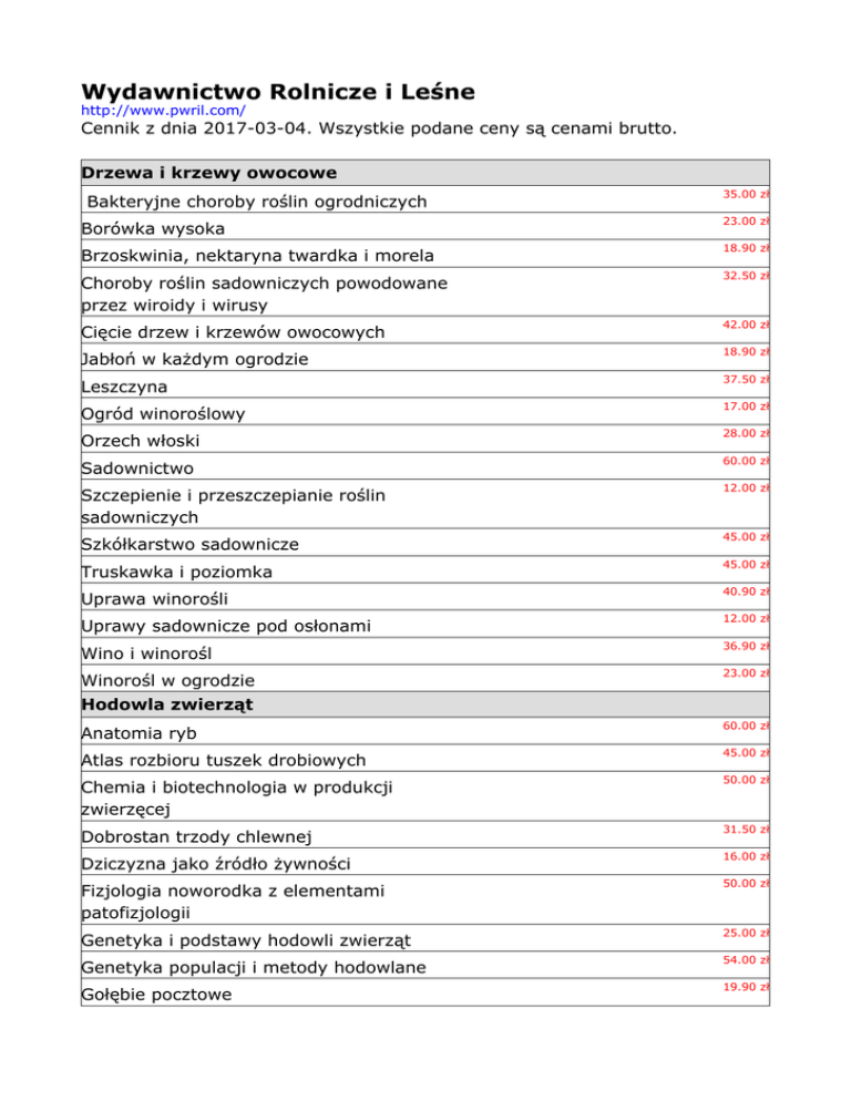 Wydawnictwo Rolnicze i Leśne http://www.pwril.com/ Cennik z dnia 2017-03-04. Wszystkie podane ceny są cenami brutto. Drzewa i krzewy owocowe Bakteryjne choroby roślin ogrodniczych Borówka wysoka Brzoskwinia, nektaryna twardka i morela Choroby roślin sadowniczych powodowane przez wiroidy i wirusy Cięcie drzew i krzewów owocowych Jabłoń w każdym ogrodzie Leszczyna Ogród winoroślowy Orzech włoski Sadownictwo Szczepienie i przeszczepianie roślin sadowniczych Szkółkarstwo sadownicze Truskawka i poziomka Uprawa winorośli Uprawy sadownicze pod osłonami Wino i winorośl Winorośl w ogrodzie 35.00 zł 23.00 zł 18.90 zł 32.50 zł 42.00 zł 18.90 zł 37.50 zł 17.00 zł 28.00 zł 60.00 zł 12.00 zł 45.00 zł 45.00 zł 40.90 zł 12.00 zł 36.90 zł 23.00 zł Hodowla zwierząt Anatomia ryb Atlas rozbioru tuszek drobiowych Chemia i biotechnologia w produkcji zwierzęcej Dobrostan trzody chlewnej Dziczyzna jako źródło żywności Fizjologia noworodka z elementami patofizjologii Genetyka i podstawy hodowli zwierząt Genetyka populacji i metody hodowlane Gołębie pocztowe 60.00 zł 45.00 zł 50.00 zł 31.50 zł 16.00 zł 50.00 zł 25.00 zł 54.00 zł 19.90 zł Gołębie rasowe Gospodarka pasieczna Higiena w pasiece Hodowla i użytkowanie bydła Hodowla i użytkowanie drobiu Hodowla koni R. Prawocheński Hodowla koni. Tom 1 Hodowla koni. Tom 2 Hodowla pszczół Hodowla zwierząt tom 1 Hodowla zwierząt Tom 2 Indyki - hodowla i użytkowanie Jenoty - chów i hodowla Króliki - towarowa produkcja mięsna Króliki. Reksy użytkowanie futerkowe Kury. Chów pozafermowy Ochrona zasobów genetycznych zwierząt gospodarskich i dziko żyjących Pasze i dodatki paszowe Pielęgnacja i podkuwanie kopyt koni Podstawy hodowli lisów i norek Polubić pszczoły Poradnik dla hodowców psów. Genetyka w praktyce Przepiórka japońska Pszczoły, pasieka towarowa Sterowanie rozwojem układu pokarmowego u nowo narodzonych ssaków Surowce zwierzęce - ocena i wykorzystanie Szynszyle. Chów fermowy Towaroznawstwo surowców i produktów zwierzęcych z podstawami przetwórstwa Żywienie koni 61.00 zł 39.00 zł 34.00 zł 66.00 zł 70.50 zł 93.00 zł 89.00 zł 75.00 zł 82.00 zł 35.00 zł 35.00 zł 14.50 zł 27.00 zł 31.50 zł 34.00 zł 12.00 zł 54.00 zł 54.00 zł 36.00 zł 18.90 zł 26.00 zł 42.00 zł 18.00 zł 32.00 zł 54.00 zł 56.00 zł 32.50 zł 70.50 zł 54.00 zł Jeździectwo ABC hipoterapii 47.00 zł ABC jeździectwa Hodowla koni R. Prawocheński Hodowla koni. Tom 1 Hodowla koni. Tom 2 Nauka jazdy konnej Pielęgnacja i podkuwanie kopyt koni Poradnik dla hodowców i miłośników koni Psychologia treningu koni Żywienie koni 30.00 zł 93.00 zł 89.00 zł 75.00 zł 50.50 zł 36.00 zł 40.00 zł 45.00 zł 54.00 zł Meblarstwo Komputerowo zintegrowane wytwarzanie mebli Komputerowy zapis konstrukcji mebli w środowisku TopSolid Meble Naprawa i odnawianie Pokrycia lakierowe na drewnie - parametry i oddziaływania Projektowanie mebli 39.00 zł 80.00 zł 39.00 zł 12.00 zł 92.00 zł Ogród i rośliny ozdobne Byliny Byliny ogrodowe Chryzantemy - odmiany i uprawa Cyklameny Drzewa i krzewy iglaste Krzewy i drzewa liściaste Kwiaty cięte uprawiane pod osłonami Liściaste krzewy ozdobne. Część 1 Liściaste krzewy ozdobne. Część 2. Oczko wodne Pielęgnowanie drzew i krzewów ozdobnych Podstawy projektowania ogrodów Podręcznik Przyrodnicze wykorzystanie odpadów Rośliny cenne, rzadkie, poszukiwane Rośliny okrywowe Rośliny uprawiane na zieleń ciętą 49.00 zł 63.00 zł 34.00 zł 23.00 zł 17.00 zł 26.00 zł 36.00 zł 45.00 zł 45.00 zł 42.00 zł 39.00 zł 79.00 zł 44.00 zł 45.00 zł 30.00 zł 33.50 zł Rozmnażanie wegetatywne roślin ozdobnych Róże Skalniaki Słownik roślin użytkowych polski, łaciński, angielski, francuski, niemiecki, rosyjski Storczyki Trawniki Trawy ozdobne, turzyce i sity Uprawa roślin ozdobnych Wrzosy, wrzośce i inne rośliny wrzosowate Żywopłoty 31.50 zł 36.00 zł 39.00 zł 60.00 zł 52.50 zł 26.50 zł 18.90 zł 72.90 zł 31.50 zł 31.00 zł Poradniki Wino i winorośl 36.90 zł Poradniki / Dla miłośników zwierząt Choroby ryb akwariowych Choroby ryb akwariowych Co dolega mojemu kotu? Corgi cardigan i pembroke Gołąbki i astryldy Gołębie pocztowe Gołębie rasowe Królik miniaturowy Łąkówki i... Nierozłączki Obserwujemy motyle. Jak - gdzie - kiedy? Poradnik dla hodowców psów. Genetyka w praktyce Śladami zwierząt Wędkowanie zimą od listopada do kwietnia Yorkshire terrier Żółw ozdobny 19.00 zł 54.00 zł 22.50 zł 4.50 zł 4.50 zł 19.90 zł 61.00 zł 14.40 zł 4.50 zł 4.50 zł 4.50 zł 42.00 zł 23.50 zł 4.50 zł 23.00 zł 14.40 zł Poradniki / Dom Meble Naprawa i odnawianie Nowoczesne wyposażenie domu. Instalacje elektryczne 39.00 zł 42.00 zł Nowoczesne wyposażenie domu. Instalacje sanitarne i grzewcze Ogrzewanie biomasą 36.00 zł 26.00 zł Poradniki / Kulinaria Grill smacznie i wesoło Grzyby w naszej kuchni Jaja i mleko Jeść i być szczupłym Kuchenka mikrofalowa Miód w kuchni Nalewki i likiery Owoce południowe Szaszłyk to przyjemność Technologia produkcji wina Technologia wędzenia żywności Warzywa źródło witamin Zakąski zimne i gorące 9.00 zł 9.00 zł 9.00 zł 22.50 zł 9.00 zł 9.00 zł 30.00 zł 6.00 zł 9.00 zł 56.90 zł 54.00 zł 9.00 zł 9.00 zł Pozostałe tytuły Biogaz rolniczy odnawialne źródło energii Biopaliwo rzepakowe Elektryfikacja rolnictwa Entomologia. Część 1 – entomologia ogólna Entomologia. Część 2 – entomologia szczegółowa Marketing produktów żywnościowych Metodyka pomiarów w inżynierii przemysłu spożywczego Odnawialne źródła energii Rolnicze surowce energetyczne Ogrzewanie biomasą Pasze i dodatki paszowe Rośliny oleiste Stawy małe zbiorniki wodne Technika ekstruzji w przemyśle rolno-spożywczym 50.50 zł 30.00 zł 18.00 zł 44.00 zł 53.50 zł 13.50 zł 11.00 zł 70.50 zł 26.00 zł 54.00 zł 47.70 zł 31.50 zł 52.00 zł Technologia produkcji mieszanek paszow