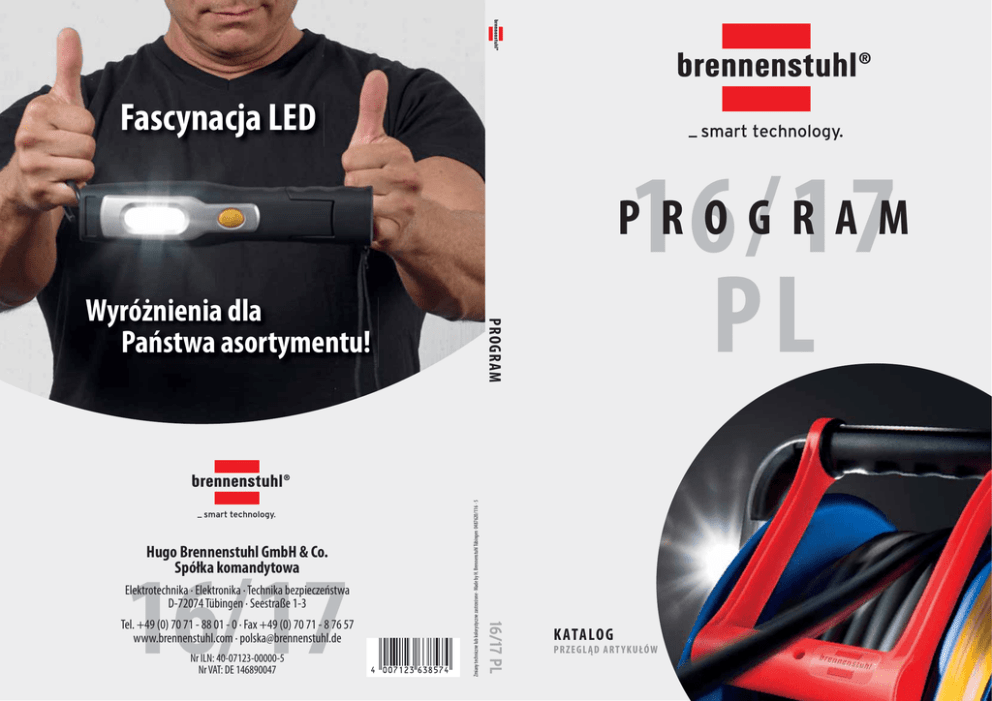 Fascynacja LED 16/17 PL P R O G R A M Tel. +49 (0) 70 71 - 88 01 - 0 · Fax +49 (0) 70 71 - 8 76 57 www.brennenstuhl.com · [email protected] Nr ILN: 40-07123-00000-5 Nr VAT: DE 146890047 16/17 PL 16/17 Elektrotechnika · Elektronika · Technika bezpieczeństwa D-72074 Tübingen · Seestraße 1-3 Zmiany techniczne lub kolorystyczne zastrzeżone · Made by H. Brennenstuhl Tübingen 0487620/116 · 5 Hugo Brennenstuhl GmbH & Co. Spółka komandytowa PROGRAM Wyróżnienia dla Państwa asortymentu! K ATA LOG PRZEGL ĄD ART YKUŁÓW JAKOŚĆ, NIEZAWODNOŚĆ, PRĘDKOŚĆ I JAKOŚĆ DOSTAW są u nas pisane WIELKIMI literami. Jesteśmy dokładnie tam, gdzie nas Państwo potrzebujecie Dlatego też rozszerzamy nasze centrum logistyczne w Tübingen, abyśmy mogli być jeszcze wydajniejsi dla Państwa! Powierzchnia zasadnicza: Pojemność: 2 4.400 m (88 m x 50 m) zapewniając dużą swobodę ruchu! ok. 9.000 szt. miejsc paletowych/pallet spaces abyśmy zawsze mogli dostarczyć! Wysokość: W sumie nasze centrum logistyczne zajmie w przyszłości: ok. 34.500 m2 powierzchni zasadniczej ok. 34.000 szt. miejsc paletowych 16 m ponieważ wciąż chcemy się rozwijać! eni! z r t s e z r p i ji iz w ga Przyszłość wymaadobrą, wspólną przyszłość! Z Wasz przedstawiciel handlowy firmy Brennenstuhl – w całej Polsce do Państwa dyspozycji! Proszę do niego dzwonić! On jest Państwa najlepszym doradcą. On pomoże Państwu w wyborze właściwego dla Państwa potrzeb produktu. On znajdzie także dla Państwa najlepszy sposób sprzedaży naszych wyrobów. brennenstuhl® jest właścicielem certyfikatu AEO, a w związku z tym upoważnionym przedsiębiorcą w związku z wszystkimi celno-prawnymi uproszczeniami na obszarze UE oraz poza jej granicami „Kto zna swój cel, ten znajdzie drogę” Laotse Hugo Brennenstuhl znał swój cel, gdy przed ponad 50 laty położył kamień węgielny swojej firmy. Ciągłe zorientowanie na potrzeby klientów oraz niezmordowane dążenie do perfekcji przyniosło efekty. Historia sukcesu, którą w międzyczasie zapisuje już trzecie pokolenie. Państwo, nasi klienci znajdują się w punkcie centralnym naszego działania. Silny wzrost naszego przedsiębiorstwa wymusił również ekspansję przestrzenną. Czy to w Niemczech, czy na świecie: brennenstuhl® rozrasta się. Do tego potrzebujemy miejsca! Miejsca na wdrażanie i wypracowanie naszych nowych pomysłów. Miejsce na dogłębne i nowoczesne zapewnienie jakości. Miejsce na zapewnienie optymalnych usług dla naszych klientów. Wzrost, który wymusza naszą ekspansję, zawdzięczamy Państwu. Za to chcielibyśmy Państwu serdecznie podziękować! Rozbudowa naszego centrum logistycznego stwarza nowe możliwości i umożliwia osiąganie nowych celów. Wspólnie z Państwem chcemy tworzyć przyszłość i cieszymy się na współpracę. Życzymy wiele radości z naszym nowym katalogiem i naszymi nowościami, które z pewnością również Państwu otworzą nowe możliwości. Hugo Brennenstuhl Dr. Wolfgang Dehler-Brennenstuhl Sebastian Brennenstuhl Managing Director Managing Director Managing Director Miara jakości Ten innowacyjny kabel jest odporny na przetarcia, wysoce elastyczny do -35 °C, oporny na olej i wytrzymały. Kabel posiada certyfikat IP 44 i jest zarejestrowany w VDE. Znakomicie nadaje się do krótkotrwałego stosowania na zewnątrz. Zarejestr owany w VDE Ty lko w firm iee De 5 superieure kwaliteitskenmerken van kabel: Maksymalnie odporny na ścieranie Maksymalnie odporny na zimno do temperatury -35 ºC Maksymalnie odporny na olej Maksymalnie bezzapachowy Maksymalnie mocny, bardzo elastyczny, odporny na działania mechaniczne Materiały reklamowe i ścianki modułowe Kozły Urządzenia do warsztatu, domu i ogrodu Technika domowa i warsztatowa Lampy solarne Oświetlenie i Latarki Rozdział prądu Przedłużacze listwowe & Adaptery, sterowniki Zabezpieczenie przepięciowe WYKAZ ARTYKUŁÓW 6 www.brennenstuhl.com Lampy solarne 157 Technika domowa i warsztatowa 169 Urządzenia do warsztatu, domu i ogrodu 175 Kozły 181 Materiały reklamowe i ścianki modułowe 185 Przedłużacze listwowe & Adaptery, sterowniki 83 Rozdział prądu Oświetlenie i Latarki Oświetlenie i Latarki i Latarki 45 Lampy solarne Rozdział prądu Technika domowa i warsztatowa 19 Urządzenia do warsztatu, domu i ogrodu Przedłużacze listwowe & Adaptery, sterowniki Kozły 9 Materiały reklamowe i ścianki modułowe Zabezpieczenie przepięciowe Zabezpieczenie przepięciowe WYKAZ ARTYKUŁÓW 7 Legenda oznaczeń kablowych Zabezpieczenie przepięciowe Krótki opis rodzajów kabli Właściwy przewód do odpowiednich warunków pracy: Do stałego zastosowania na zewnątrz. 2 3 4 5 6 7 Wyjątkowo odporny na mechaniczne działania i ścieranie. Odporny na zmienne warunki atmosferyczne, mikroby i kwasy. Zastosowanie do -40 °C. Opona z poliuretanu. 8 1 przeznaczenie SPE 1 AL ROB CI T US Przedłużacze listwowe & Adaptery, sterowniki BQ H = przewód zharmonizowany A = inne oznakowanie krajowe 3 osłony izolacyjne Oświetlenie i Latarki V = PVC V3 = PVC, zastosowanie do -35 °C R = kauczuk naturalny i syntetyczny S = kauczuk sylikonowy B = kauczuk syntetyczny Do stałego stosowania na zewnątrz. RN Odporny na olej, osłony izolacyjne żył z elastycznego kauczuku naturalnego lub syntetycznego. Opona z neoprenu. AL ROB CI T US Rozdział prądu 03 = 300 / 300 V 05 = 300 / 500 V 07 = 450 / 750 V SPE 2 napięcie znamionowe Do stałego stosowania na zewnątrz. V3 V3 Odporny na olej. Bardzo odporny na działania mechaniczne. Odporny na zimno do temperatury -35 °C. Opona ze specjalnego, bardzo elastycznego tworzywa sztucznego. 4 Opona Technika domowa i warsztatowa Lampy solarne V = PVC V3 = PVC, Odporny na zimno do temperatury -35 °C R = kauczuk naturalny i syntetyczny N = neopren-kauczuk J = splot włókien szklanych T = splot tekstylny Q = poliuretan Do stosowania w pomieszczeniach zamkniętych i krótkotrwałego na wolnym powietrzu. RR Wykonanie z opon