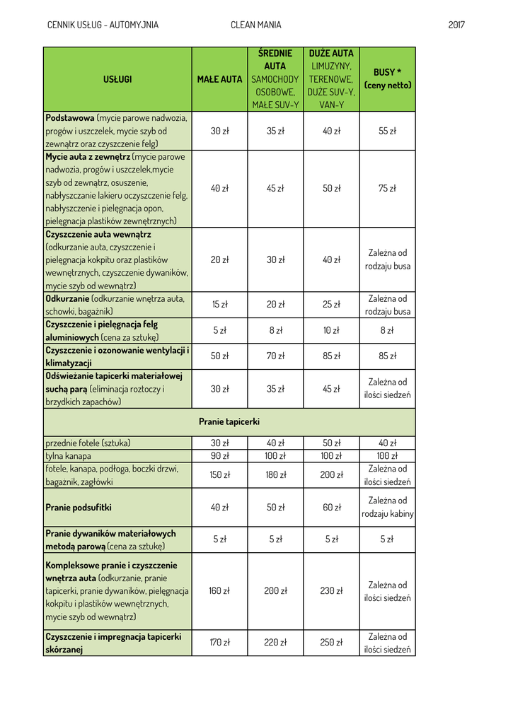 cennik usług - automyjnia clean mania 2017 usługi małe auta