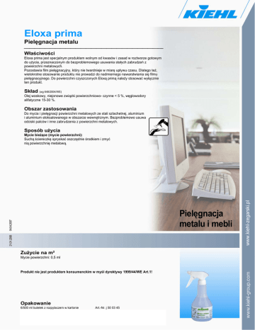 Eloxa prima Pielęgnacja metalu ⎯⎯⎯⎯⎯⎯⎯⎯⎯⎯⎯⎯⎯⎯⎯⎯⎯⎯⎯⎯⎯⎯⎯⎯⎯⎯⎯ Właściwości Eloxa prima jest specjalnym produktem wolnym od kwasów i zasad w roztworze gotowym do użycia, przeznaczonym do bezproblemowego usuwania stałych zabrudzeń z powierzchni metalowych. Pozostawia film pielęgnacyjny, który nie twardnieje w miarę upływu czasu. Dlatego też, wielokrotne stosowanie produktu nie prowadzi do nadmiernego nawarstwiania się filmu pielęgnacyjnego. Do powierzchni czyszczonych Eloxą primą należy stosować wyłącznie ten produkt. Skład (wg 648/2004/WE) Olej woskowy, niejonowe związki powierzchniowo- czynne < 5 %, węglowodory alifatyczne 15-30 %. Obszar zastosowania Do mycia i pielęgnacji powierzchni metalowych ze stali szlachetnej, aluminium i aluminium eloksalowanego w obszarze wewnętrznym. Bezproblemowo usuwa odciski palców i inne zabrudzenia z powierzchni metalowych. Sposób użycia 21.01.2006 04.04.2007 Pielęgnacja metalu i mebli Zużycie na m² Mycie powierzchni: 0,5 ml Produkt nie jest produktem konsumenckim w myśl dyrektywy 1999/44/WE Art.1! Opakowanie 6/500 ml butelek z rozpylaczem w kartonie Art.-Nr. j 50 03 45 www.kiehl-zegarski.pl Mycie bieżące (mycie powierzchni): Suchą ściereczkę spryskać oszczędnie środkiem i zmyć nią powierzchnię metalową.