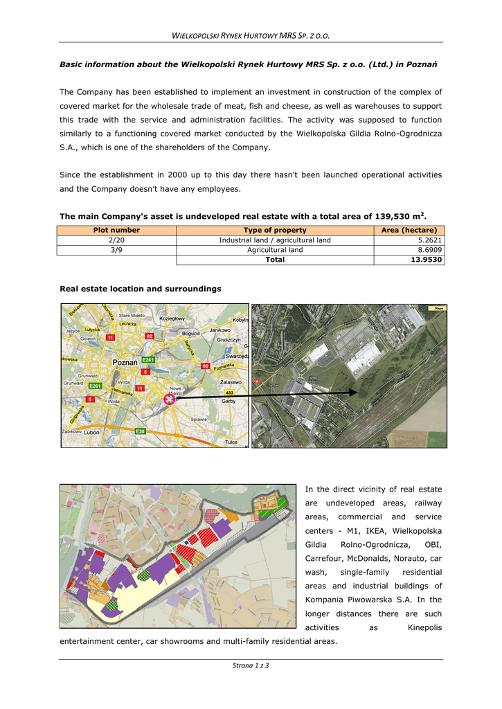WIELKOPOLSKI RYNEK HURTOWY MRS SP. Z O.O. Basic information about the Wielkopolski Rynek Hurtowy MRS Sp. z o.o. (Ltd.) in Poznań The Company has been established to implement an investment in construction of the complex of covered market for the wholesale trade of meat, fish and cheese, as well as warehouses to support this trade with the service and administration facilities. The activity was supposed to function similarly to a functioning covered market conducted by the Wielkopolska Gildia Rolno-Ogrodnicza S.A., which is one of the shareholders of the Company. Since the establishment in 2000 up to this day there hasn’t been launched operational activities and the Company doesn’t have any employees. The main Company's asset is undeveloped real estate with a total area of 139,530 m2. Plot number 2/20 3/9 Type of property Industrial land / agricultural land Agricultural land Total Area (hectare) 5.2621 8.6909 13.9530 Real estate location and surroundings In the direct vicinity of real estate are undeveloped areas, areas, railway and service commercial centers - M1, IKEA, Wielkopolska Gildia Rolno-Ogrodnicza, OBI, Carrefour, McDonalds, Norauto, car wash, single-family residential areas and industrial buildings of Kompania Piwowarska S.A. In the longer distances there are such activities entertainment center, car showrooms and multi-family residential areas. Strona 1 z 3 as Kinepolis WIELKOPOLSKI RYNEK HURTOWY MRS SP. Z O.O. Property is located near the Szwedzka street (section of the projected III ring Road of Poznań) and about 3.5 km from the junction road of the A-2 highway (Krzesiny). At present access to the property is through Franowo street (in its extension, on land owned by the City of Poznan, along the northern boundary of plot No. 2/20 there’s been laid an asphalted surface). In the immediate vicinity of Real estate there is currently built tram line and a new MPK tram depot. The following picture shows the approximate location of the property (blue arrows). The complex of parcels has a regular shape, with the plot No 2/20 not having a regular shape - this doesn’t restrict investment opportunities using complex of plots. Plots are characterized by gentle lay of the land. dz. nr 2/20 dz. nr 3/9 Strona 2 z 3 WIELKOPOLSKI RYNEK HURTOWY MRS SP. Z O.O. There are basic media and infrastructure in the close vicinity of the real estate which allow to build commercial and industrial facilities. It is allowed to build a medium-high building with a services function and medium-high buildings like: industrial plants (including high technology), bases, depots, warehouses and other economic activities as well as recycling facilities and technical bases on the Company’s property according to drawing of zoning plan of the city of Poznan. The property is located in the area for which it is obligatory to prepare a detailed zoning plan, with the possibility of location of retail facilities of over 2,000 m2. The Company doesn’t conduct any operational activities, but in 2010 it acquired net profit for obtaining compensation from the Governor of Wielkopolska in the implementation of the EURO 2012 project which involved the construction of the tram route Lecha-Franowo housing estates. For this reason, the Company had to return part of owned land and received a compensation in the amount of net 2,533,026.00 PLN. In 2011 company paid a dividend to shareholders. City of Poznan received 538,876.71 PLN, and WGRO SA received 100,231.07 PLN. The amount of the dividend was paid after allocation of profit to cover losses from previous years. The rest of compensation was located on deposit of which the Company received the interest. It enabled to make a profit in 2011. In the end of 2011 the Company has accumulated over 1.7 mio PLN on bank deposits. For more information about the Company and the procedure of sale of its shares please visit page bip.um.poznan.pl (Current Information / Other messages) or contact with Eksi Consulting Sp. z o.o. (advisors in process of sale shares of company Wielkopolski Rynek Hurtowy MRS Sp. z o.o. in Poznań): Marek Machnicki, tel.: +48 61 640 37 73 GSM: +48 601 808 824 e-mail: [email protected] Piotr Jankowski tel.: +48 61 640 37 75 GSM: +48 606 958 968 e-mail: [email protected] ul. Kraszewskiego 2/1, 60-518 Poznań fax: +48 61 662 80 07 Strona 3 z 3