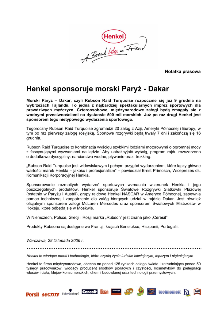 Notatka prasowa Henkel sponsoruje morski Paryż - Dakar Morski Paryż – Dakar, czyli Rubson Raid Turquoise rozpocznie się już 9 grudnia na wybrzeżach Tajlandii. To jedna z najbardziej spektakularnych imprez sportowych dla prawdziwych mężczyzn. Czteroosobowe, międzynarodowe załogi będą zmagały się z wodnymi przeciwnościami na dystansie 500 mil morskich. Już po raz drugi Henkel jest sponsorem tego nietypowego wydarzenia sportowego. Tegoroczny Rubson Raid Turquoise zgromadzi 20 załóg z Azji, Ameryki Północnej i Europy, w tym po raz pierwszy załogę rosyjską. Sportowe rozgrywki będą trwały 7 dni i zakończą się 16 grudnia. Rubson Raid Turquoise to kombinacja wyścigu szybkimi łodziami motorowymi o ogromnej mocy z fascynującymi wyzwaniami na lądzie. Aby uatrakcyjnić wyścig, program rajdu rozszerzono o dodatkowe dyscypliny: narciarstwo wodne, pływanie oraz trekking. „Rubson Raid Turquoise jest widowiskowym i pełnym przygód wydarzeniem, które łączy główne wartości marek Henkla – jakość i profesjonalizm” – powiedział Ernst Primosch, Wiceprezes ds. Komunikacji Korporacyjnej Henkla. Sponsorowanie rozmaitych wydarzeń sportowych wzmacnia wizerunek Henkla i jego poszczególnych produktów. Henkel sponsoruje Światowe Rozgrywki Siatkówki Plażowej (ostatnio w Paryżu i Austrii), grupy rajdowe Henkel NASCAR w Ameryce Północnej, zapewnia pomoc techniczną i zaopatrzenie dla załóg biorących udział w rajdzie Dakar. Jest również oficjalnym sponsorem załogi McLaren Mercedes oraz sponsorem Światowych Mistrzostw w Hokeju, które odbędą się w Moskwie. W Niemczech, Polsce, Grecji i Rosji marka „Rubson” jest znana jako „Ceresit”. Produkty Rubsona są dostępne we Francji, krajach Beneluksu, Hiszpanii, Portugalii. Warszawa, 28 listopada 2006 r. Henkel to wiodące marki i technologie, które czynią życie ludzkie łatwiejszym, lepszym i piękniejszym Henkel to firma międzynarodowa, obecna na ponad 125 rynkach całego świata i zatrudniająca ponad 50 tysięcy pracowników, wiodący producent środków piorących i czystości, kosmetyków do pielęgnacji włosów i ciała, klejów konsumenckich, chemii budowlanej oraz technologii przemysłowych. W Polsce Henkel działa od 16 lat. Uruchomił 6 ośrodków produkcyjnych: w Raciborzu, Stąporkowie, Wrzącej, Dzierżoniowie, Ciechanowie i Bielsku-Białej, produkujących zarówno na potrzeby rynku polskiego, jak i na eksport. Zatrudnia w Polsce ponad 1100 pracowników. Kontakt: Dorota Strosznajder PR Manager, Henkel Polska Sp. z o.o. [email protected] tel: (+22) 565 66 65 Magda Gieorgica Mmd Poland - Corporate, Public Affairs & Public Relations Consultants [email protected] tel: (+22) 536 04 63 Materiały graficzne: www.press.henkel.com