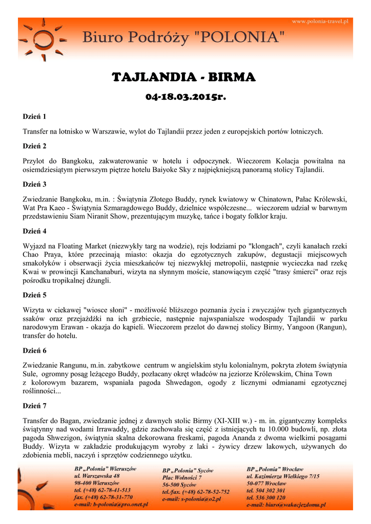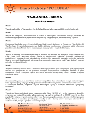 TAJLANDIA - BIRMA 04-18.03.2015r. Dzień 1 Transfer na lotnisko w Warszawie, wylot do Tajlandii przez jeden z europejskich portów lotniczych. Dzień 2 Przylot do Bangkoku, zakwaterowanie w hotelu i odpoczynek. Wieczorem Kolacja powitalna na osiemdziesiątym pierwszym piętrze hotelu Baiyoke Sky z najpiękniejszą panoramą stolicy Tajlandii. Dzień 3 Zwiedzanie Bangkoku, m.in. : Świątynia Złotego Buddy, rynek kwiatowy w Chinatown, Pałac Królewski, Wat Pra Kaeo - Świątynia Szmaragdowego Buddy, dzielnice współczesne... wieczorem udział w barwnym przedstawieniu Siam Niranit Show, prezentującym muzykę, tańce i bogaty folklor kraju. Dzień 4 Wyjazd na Floating Market (niezwykły targ na wodzie), rejs łodziami po "klongach", czyli kanałach rzeki Chao Praya, które przecinają miasto: okazja do egzotycznych zakupów, degustacji miejscowych smakołyków i obserwacji życia mieszkańców tej niezwykłej metropolii, następnie wycieczka nad rzekę Kwai w prowincji Kanchanaburi, wizyta na słynnym moście, stanowiącym część "trasy śmierci" oraz rejs pośrodku tropikalnej dżungli. Dzień 5 Wizyta w ciekawej "wiosce słoni" - możliwość bliższego poznania życia i zwyczajów tych gigantycznych ssaków oraz przejażdżki na ich grzbiecie, następnie najwspanialsze wodospady Tajlandii w parku narodowym Erawan - okazja do kąpieli. Wieczorem przelot do dawnej stolicy Birmy, Yangoon (Rangun), transfer do hotelu. Dzień 6 Zwiedzanie Rangunu, m.in. zabytkowe centrum w angielskim stylu kolonialnym, pokryta złotem świątynia Sule, ogromny posąg leżącego Buddy, pozłacany okręt władców na jeziorze Królewskim, China Town z kolorowym bazarem, wspaniała pagoda Shwedagon, ogody z licznymi odmianami egzotycznej roślinności... Dzień 7 Transfer do Bagan, zwiedzanie jednej z dawnych stolic Birmy (XI-XIII w.) - m. in. gigantyczny kompleks świątynny nad wodami Irrawaddy, gdzie zachowała się część z istniejących tu 10.000 budowli, np. złota pagoda Shwezigon, świątynia skalna dekorowana freskami, pagoda Ananda z dwoma wielkimi posągami Buddy. Wizyta w zakładzie produkującym wyroby z laki - żywicy drzew lakowych, używanych do zdobienia mebli, naczyń i sprzętów codziennego użytku. Dzień 8 Przelot do Mandalay, zwiedzanie XIX-wiecznej stolicy królestwa Birmy, m. in. świątynia Mahamuni z posągiem Buddy, na którym pielgrzymi wciąż przyklejają płatki złota, najdłuższy na świecie most z drewna tekowego - U Bein - liczący ponad dwieście lat, klasztor Shwenandaw, pełen cennych drewnianych figur, pagoda Kuthodaw z największą książką świata; podziwianie zachodu słońca na wzgórzu Mandalay. Dzień 9 Wycieczka nad malownicze jezioro Inle, położone pośród gór na wysokości 900 m. n.p.m. Rejs połączony ze zwiedzaniem zabytkowych świątyń (wizerunki Buddy sprzed ośmiu wieków), postoje przy manufakturach jedwabiu, warsztatach, gdzie powstają birmańskie cygara, tradycyjne łodzie, czy wyroby z bawełny i srebra. Na trasie rejsu niezwykłe pływające ogrody pełne hiacyntów i plantacje warzyw. Doskonała okazja, by podziwiać piękne krajobrazy oraz niezwykłe obyczaje miejscowych plemion. Dzień 10 Transfer do Yangoon, następnie przelot do Tajlandii i przejazd do Pattaya (ew. Krabi), pobyt wypoczynkowy nad morzem, z możliwością interesujących wycieczek lokalnych (dzień 10 - dzień 13) Dzień 14 Transfer na lotnisko, wylot do Europy. Dzień 15 Powrót do Polski Cena: 3750zł + 1800$ obejmuje: • przeloty wg programu, • transfery na lotniska i na opisanych trasach, klimatyzowane mikrobusy lub autobusy • noclegi w hotelach 3***, pokoje 2-os. z łazienkami • śniadania w miejscach noclegów, podczas lotów do i z Tajlandii posiłki zapewniają linie lotnicze • ubezpieczenie KL i NNW • opiekę polskojęzycznego pilota Dodatkowo płatne: • pozostałe posiłki - ceny wyżywienia niższe niż w Polsce (6-10 $ dziennie) • wiza birmańska • bilety do atrakcji turystycznych, razem ok. 60 USD