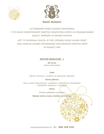 JUŻ NIEBAWEM ŚWIĘTA BOŻEGO NARODZENIA. Z TEJ OKAZJI PRZEDSTAWIAMY PAŃSTWU ŚWIĄTECZNĄ OFERTĘ NA ZORGANIZOWANIE WIGILII FIRMOWEJ W DWORZE KOLESIN. JEST TO WSPANIAŁA OKAZJA, BY PRZY DŹWIĘKU KOLĘD, BLASKU ŚWIEC ORAZ ZAPACHU CHOINKI PODZIĘKOWAĆ PRACOWNIKOM PAŃSTWA FIRMY ZA MIJAJĄCY ROK. ZESTAW WIGILIJNY I 59 zł os. (dania serwowane) Zupa Barszcz czerwony z uszkami na naturalnym zakwasie Danie główne Karp z sosem pieczarkowym podawany z gotowanymi ziemniakami i szpinakiem duszonym z czosnkiem Deser Piernik przekładany powidłami Napoje zimne, kawa, herbata do wyboru [email protected], tel.: 506 199 518 ZESTAW WIGILIJNY II 59 zł/os. (dania serwowane) Zupa Grzybowa z kluseczkami Danie główne Filet z dorsza w sosie cytrynowym na fasolce zielonej z czosnkiem, podawany z ryżem Deser Ciasto piernikowo-jabłkowe z bitą śmietaną Napoje zimne, kawa, herbata do wyboru ZESTAW WIGILIJNY III 59 zł/os. (dania serwowane) Zupa Zupa rybna z grzaneczkami i pietruszką Danie główne Pstrąg w migdałach podawany z pieczonymi ziemniakami z rozmarynem i kapustą kwaszoną zasmażaną z grzybami Deser Sernik królewski Napoje zimne, kawa, herbata do wyboru ZESTAW WIGILIJNY IV 80 zł/os. Zupa Barszcz czerwony na naturalnym zakwasie z uszkami Danie główne Dorsz pieczony w szarym sosie z ziemniakami puree i bukietem warzyw gotowanych Domowe pierogi z kapustą i grzybami oraz ruskie (na półmiskach) Deser Ciasto drożdżowe – krańce makowe Zakąski podawane do stołu lub w formie bufetu szwedzkiego : Karp po żydowsku w galarecie Ryba w zalewie pomidorowej Łosoś wędzony na zimno na bułeczce z twarożkiem chrzanowym i koperkiem Śledzik w zalewie octowej z cebulką i grzybkami Śledzik z jabłkiem, cebulka i ogórkiem w śmietanie (trzy pozycje do wyboru) Sałatka warstwowa ze świeżych warzyw z sosikiem jogurtowo-pomidorowym Sałatka z krabowa z jajkiem, awokado z sosikiem czosnkowym Sałatka jarzynowa (jedna sałatka do wyboru) Pieczywo mieszane Napoje zimne, napoje ciepłe [email protected], tel.: 506 199 518 ZESTAW WIGILIJNY V 80 zł/os. (serwowane na półmiskach ) Przystawki Tradycyjna sałatka jarzynowa z majonezem Pstrąg w galarecie Pieczywo Zupa Barszcz czerwony z uszkami Danie główne (1,5 porcji/os.) Domowe pierogi z kapustą i grzybami Karp pieczony w cebuli w szarym sosie Kapusta z grochem Sałata z sosem vinegrette Ziemniaki pieczone Deser Piernik Sernik Napoje zimne, napoje ciepłe ZESTAW WIGILIJNY VI 100 zł/os Przystawki Sałatka ze śledzia i warzyw w aromatycznej oliwie Ryba po grecku Sałatka ziemniaczana z boczkiem i kiszonym ogórkiem Zupa Zupa grzybowa z łazankami Danie główne (1,5 porcji/os.) Filet z dorsza w sosie śmietanowym Schab pieczony w ziołach z sosem i warzywami Pierogi z kapustą i grzybami Puree ziemniaczane Kapusta z grzybami Warzywa gotowane na parze (na półmiskach) Deser Piernik Makowiec Napoje zimne, napoje ciepłe [email protected], tel.: 506 199 518 ZESTAW WIGILIJNY VII 120 zł/os. Zupa Rybna z grzaneczkami Barszcz z uszkami Krem pieczarkowy (jedna zupa do wyboru) Danie Główne (podawane na paterach 1,5 szt./os.) Karp pieczony Filety rybne w sosie piernikowym lub grzybowym Ziemniaki pieczone ziemniaki z wody kopytka szpinakowe ryż (do wyboru dwie pozycje) kapusta zasmażana z grzybami, surówki Domowe pierogi z kapustą i grzybami , ze szpinakiem , z kaszą i serem (do wyboru dwa rodzaje) Krokieciki z kapustą i grzybami lub gołąbki jarskie (serwowane na półmiskach 1,5 szt./os.) Zakąski podawane do stołu lub w formie bufetu szwedzkiego : Rolada szpinakowa z łososiem Karp w galarecie Śledzik w oliwie Śledzie z salsą pomidorowo-paprykową na ostro Ryba w zalewie octowej Ryba w zalewie pomidorowej z papryka i ogórkiem (do wyboru trzy pozycje) Sałatka z wędzonego pstrąga z jabłkiem Sałatka dworska (mix sałat, seler naciowy, winogrona) sosem curry (jedna do wyboru) Pieczywo mieszane Deser (szwedzki stół) Sernik królewski z brzoskwiniami piernik orzechowiec (jeden rodzaj do wyboru) ciasteczka świąteczne Bufet kawowy bez ograniczeń Napoje zimne: woda, sok owocowy, kompot z suszu [email protected], tel.: 506 199 518 Zamówienia dodatkowe: Ciasta świąteczne (sernik, piernik, makowiec, orzechowiec, ciastka świąteczne, ciasta drożdżowe) Kawa, herbata 25 zł/os. ------------------------------Zamówienia specjalne (do uzgodnienia) Decha ryb wędzonych Udziec peklowany podawany w całości z kapustą zasmażaną i ziemniakami w ziołach - wizyta św. Mikołaja - upominki świąteczne (paczki) - kulig z ogniskiem i grzańcem - oprawa muzyczna ZAPRASZAMY!