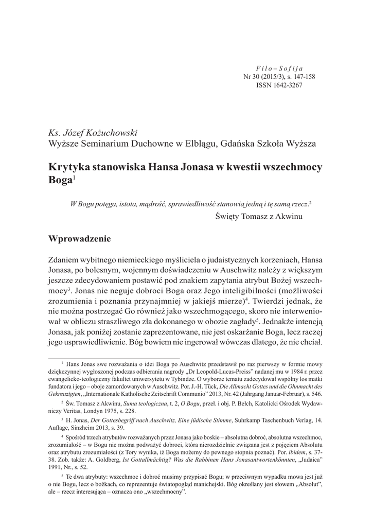 Filo– Sofija Nr 30 (2015/3), s. 147-158 ISSN 1642-3267 Ks. Józef Kożuchowski Wyższe Seminarium Duchowne w Elblągu, Gdańska Szkoła Wyższa Krytyka stanowiska Hansa Jonasa w kwestii wszechmocy Boga1 W Bogu potęga, istota, mądrość, sprawiedliwość stanowią jedną i tę samą rzecz.2 Święty Tomasz z Akwinu Wprowadzenie Zdaniem wybitnego niemieckiego myśliciela o judaistycznych korzeniach, Hansa Jonasa, po bolesnym, wojennym doświadczeniu w Auschwitz należy z większym jeszcze zdecydowaniem postawić pod znakiem zapytania atrybut Bożej wszechmocy3. Jonas nie neguje dobroci Boga oraz Jego inteligibilności (możliwości zrozumienia i poznania przynajmniej w jakiejś mierze)4. Twierdzi jednak, że nie można postrzegać Go również jako wszechmogącego, skoro nie interweniował w obliczu straszliwego zła dokonanego w obozie zagłady5. Jednakże intencją Jonasa, jak poniżej zostanie zaprezentowane, nie jest oskarżanie Boga, lecz raczej jego usprawiedliwienie. Bóg bowiem nie ingerował wówczas dlatego, że nie chciał. 1 Hans Jonas swe rozważania o idei Boga po Auschwitz przedstawił po raz pierwszy w formie mowy dziękczynnej wygłoszonej podczas odbierania nagrody „Dr Leopold-Lucas-Preiss” nadanej mu w 1984 r. przez ewangelicko-teologiczny fakultet uniwersytetu w Tybindze. O wyborze tematu zadecydował wspólny los matki fundatora i jego – oboje zamordowanych w Auschwitz. Por. J.-H. Tück, Die Allmacht Gottes und die Ohnmacht des Gekreuzigten, „Internationale Katholische Zeitschrift Communio” 2013, Nr. 42 (Jahrgang Januar-Februar), s. 546. 2 Św. Tomasz z Akwinu, Suma teologiczna, t. 2, O Bogu, przeł. i obj. P. Bełch, Katolicki Ośrodek Wydawniczy Veritas, Londyn 1975, s. 228. 3 H. Jonas, Der Gottesbegriff nach Auschwitz, Eine jüdische Stimme, Suhrkamp Taschenbuch Verlag, 14. Auflage, Sinzheim 2013, s. 39. 4 Spośród trzech atrybutów rozważanych przez Jonasa jako boskie – absolutna dobroć, absolutna wszechmoc, zrozumiałość – w Bogu nie można podważyć dobroci, która nierozdzielnie związana jest z pojęciem Absolutu oraz atrybutu zrozumiałości (z Tory wynika, iż Boga możemy do pewnego stopnia poznać). Por. ibidem, s. 3738. Zob. także: A. Goldberg, Ist Gottallmächtig? Was die Rabbinen Hans Jonasantwortenkönnten, „Judaica” 1991, Nr., s. 52. Te dwa atrybuty: wszechmoc i dobroć musimy przypisać Bogu; w przeciwnym wypadku mowa jest już o nie Bogu, lecz o bożkach, co reprezentuje światopogląd manichejski. Bóg określany jest słowem „Absolut”, ale – rzecz interesująca – oznacza ono „wszechmocny”. 5 148 Józef Kożuchowski Nie mógł inaczej zareagować. Fundamentalnym Jego przymiotem jest niemoc, co oznacza jednocześnie, że nie może być Panem historii – podkreśla Jonas6. Już zresztą sama analiza pojęcia mocy uzasadnia, według filozofa, zakwestionowanie boskiej omnipotencji (Schon aus unserer Erörtung von Macht überhaupt folgte ja die Verneinung göttlicher Omnipotenz)7. W niniejszym artykule zostanie zaprezentowana krytyka Jonasowej wizji, jakiej dokonują dwaj uznani współcześni filozofowie: Robert Spaemann i Friedrich Hermanni. Wprawdzie podejmuje się jej także wielu współczesnych teologów niemieckich, między innymi Jan Bauke-Ruegg, Hans Hermann Henrix, Jan-Heiner Tück, Erhard Kunz, Arnold Goldberg8, jednak na szczególną uwagę zasługują krytyczne ujęcia właśnie dwóch pierwszych, jako że wyróżniają się one wyjątkową trafnością i wnikliwością9. Ponadto tworzą pewną całość, są wzajemnie komplementarne. (Dla przykładu, Hermanni poddaje analizie zarzut rzekomej, wewnętrznej sprzeczności pojęcia wszechmocy Bożej, a Spaemann wykazuje m.in., dlaczego tragedia w Auschwitz nie jest argumentem przeciw prawdzie o wszechmocy i związanemu z nią przekonaniu, że Bóg jest Panem historii)10. Niniejszy artykuł objaśni, na jakiej podstawie Spaemann i Hermanni słusznie uznają koncepcję Jonasa za problematyczną, co więcej – błędną, zawierającą sprzeczności i wiodącą do absurdu. Wizję tę poddają krytyce w aspekcie metafizycznym, logicznym (przede wszystkim Hermanni), a także z punktu widzenia teodycei, filozofii dziejów oraz teologii (Spaemann). Kwestionują założenia kosmogeniczne, które przyjmuje w swych rozważaniach autor głośnej książki Der Gottesbegriff nach Auschwitz11. Należy zatem postawić pytanie o to, jakie jest stanowisko samego Jonasa, z jakich czerpie źródeł oraz poznać powody negacji wszechmocy Boga. Stanowisko Jonasa na temat wszechmocy Boga Czy po tragedii w Auschwitz i dramatycznym doświadczeniu Shoah „Naród Wybrany” jest nadal w stanie pozostawać przy obrazie Boga wszechmocnego, 6 H. Jonas, op. cit., s. 41. 7 Ibidem, s. 43. J. Bauke-Ruegg, Die Allmacht Gottes. Systematisch-theologische Erwägungen zwischen Metaphysik, Postmoderne und Poesie, Walter de Gruyter, New York 1998; J.-H. Tück, op. cit.; E. Kunz, Ist das Sprechen von Gottes Allmacht noch zeitgemäß, „Geist und Leben”, Januar/Februar 1995; A. Goldberg, op. cit. 8 9 Autor artykułu uwzględnia przede wszystkim analizy R. Spaemanna i F. Hermanniego (profesora filozofii na uniwersytecie w Tybindze) z uwagi na ich wnikliwość i trafność. Przeprowadził również w sierpniu 2014 r. w Stuttgarcie długą rozmowę z R. Spaemannem na temat Jonasowej wizji. Tekst tej rozmowy oraz jej zapis magnetofonowy znajduje się w zbiorach autora. 10 W artykule znajdujemy także odwołania do kilku innych profesorów filozofii i teologii, np. A. Goldberga, E. Kunza, J.-H. Tücka. 11 R. Spaemann, Das unsterbliche Gerücht, Klett-Cotta, Stuttgart 2007, s. 21, J. Bauke-Ruegg, op. cit., s. 482-483. Krytyka stanowiska Hansa Jonasa w kwestii wszechmocy Boga 149 dobrego i Pana historii? Jonas jest świadomy tego, iż każda próba wyjaśnienia tego dramatycznego doświadczenia zderzy się z pytaniem: Dlaczego Bóg zezwolił na nie, zgodził się na śmierć niewinnych ludzi? Inac