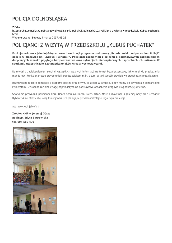 POLICJA DOLNOŚLĄSKA Źródło: http://arch2.dolnoslaska.policja.gov.pl/wr/dzialania-policji/aktualnosci/2103,Policjanci-z-wizyta-w-przedszkolu-Kubus-Puchatek. html Wygenerowano: Sobota, 4 marca 2017, 03:22 POLICJANCI Z WIZYTĄ W PRZEDSZKOLU „KUBUŚ PUCHATEK” Funkcjonariusze z Jeleniej Góry w ramach realizacji programu pod nazwą „Przedszkolak pod parasolem Policji” gościli w placówce pn. „Kubuś Puchatek”. Policjanci rozmawiali z dziećmi o podstawowych zagadnieniach dotyczących szeroko pojętego bezpieczeństwa oraz sytuacjach niebezpiecznych i sposobach ich unikania. W spotkaniu uczestniczyło 120 przedszkolaków wraz z wychowawcami. Najmłodsi z zaciekawieniem słuchali wszystkich ważnych informacji na temat bezpieczeństwa, jakie mieli do przekazania mundurowi. Funkcjonariusze przypomnieli przedszkolakom m.in. o tym, w jaki sposób prawidłowo przechodzić przez jezdnię. Rozmawiano także o kontakcie z osobami obcymi oraz o tym, co zrobić w sytuacji, kiedy mamy do czynienia z bezpańskimi zwierzętami. Zwrócono również uwagę najmłodszych na podstawowe oznaczenia drogowe i sygnalizację świetlną. Spotkanie prowadzili policjanci sierż. Beata Sosulska-Baran, sierż. sztab. Marcin Okowiński z Jeleniej Góry oraz Grzegorz Rybarczyk ze Straży Miejskiej. Funkcjonariusze planują w przyszłości kolejne tego typu prelekcje. asp. Wojciech Jabłoński Źródło: KMP w Jeleniej Górze podinsp. Edyta Bagrowiska tel. 604-580-490 Ocena: 0/5 (0) Tweetnij