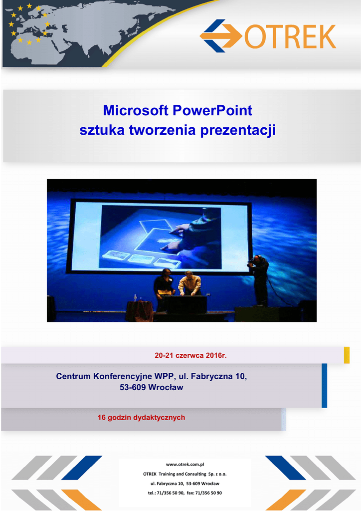 Microsoft PowerPoint sztuka tworzenia prezentacji 20-21 czerwca 2016r. Centrum Konferencyjne WPP, ul. Fabryczna 10, 53-609 Wrocław 16 godzin dydaktycznych www.otrek.com.pl OTREK Training and Consulting Sp. z o.o. ul. Fabryczna 10, 53-609 Wrocław tel.: 71/356 50 90, fax: 71/356 50 90 Cel szkolenia: Celem szkolenia jest podniesienie kwalifikacji zawodowych poprzez poznanie najważniejszych funkcji i narzędzi programu MS PowerPoint oraz ogólnych zasad tworzenia i prowadzenia prezentacji w sposób, który zainteresuje słuchacza. Wszystko w myśl zasady, o której mówił Winston Churchill, aby mówca wyczerpał temat a nie słuchaczy. Wykładowca Certyfikowany trener Microsoft (certyfikaty MOS na poziomie Specialist i Expert, tytuł MCP). Posiada przeszło czteroletnie doświadczenie w prowadzeniu szkoleń oraz czteroletnie w prowadzeniu zajęć na uczelni. Znaczna większość szkoleń, które prowadzi, to program MS Excel na różnych poziomach zaawansowania (od podstaw po VBA i analizę biznesową – dodatki PowerPivot, PowerQuery i PowerView). Pozostałe szkolenia to inne programy pakietu MS Office (każda wersja – od 2003 do 2016). Prowadzi szkolenia zarówno po polsku jak i po angielsku. Doświadczenie obejmuje ponad 4000 godzin szkoleniowych oraz ponad 5000 przeszkolonych osób. W swoich szkoleniach największy nacisk kładzie na najważniejsze i najciekawsze opcje i narzędzia. Pokazuje jak w najlepszy sposób korzystać z danego mechanizmu i skupia się bardziej na elementach, które mogą być faktycznie wykorzystane przez uczestników. Dużą wagę przykłada do stworzenia dobrej atmosfery na zajęciach sprzyjającej przyswajaniu wiedzy. Miejsce i czas szkolenia: Centrum Konferencyjne ul. Fabryczna 10, 53-609 w godzinach 9:00 – 16:00 WPP Wrocław, Zgłoszenia: Zgłoszenie udziału w warsztatach należy przesłać faksem na nr 71/356 50 90, najpóźniej na 5 dni przed terminem rozpoczęcia zajęć. Formularz zgłoszenia w załączeniu lub do pobrania z naszej strony, www.otrek.com.pl Kontakt: Dodatkowych informacji udziela: Halina Skórska, Tel. 71/ 356 50 90, email: [email protected] Cena: Opłata za szkolenie wynosi 940, 00 PLN + 23% VAT i obejmuje udział w warsztatach, materiały dydaktyczne piśmiennicze, przerwy kawowe oraz zaświadczenie. Przy oświadczeniu, iż szkolenie finansowane jest ze środków publicznych, cena bez podatku VAT Należność za udział w szkoleniu, prosimy przekazać przelewem, po otrzymaniu potwierdzenia o rozpoczęciu szkolenia, na konto: Program ramowy: 1. 2. Najważniejsze informacje o prowadzeniu prezentacji. Tworzenie prezentacji w sposób, który ułatwi dokonywanie późniejszych zmian – wzorzec slajdów. 3. Motywy prezentacji – szybka zmiana oprawy graficznej wszystkich slajdów. 4. Wszystko o animacjach: • animacje przejść między slajdami, • niestandardowe animacje obiektów na slajdach, • zaawansowane opcje animacji, np. chronometraż, animacje wykresów. 5. Grafika w prezentacji: • pozyskiwanie ilustracji, • usuwanie tła obrazów, • korekty i zaawansowane efekty obrazów, • infografiki na przykładzie grafik Smart Art (schemat organizacyjny przedsiębiorstwa, przepływy procesów, relacje) 6. Multimedia – dźwięk i wideo w prezentacji – jak z nich dobrze korzystać? 7. Komunikacja z innymi programami pakietu Office na przykładzie wykresów z MS Excel. 8. Zaawansowane opcje pokazu slajdów: • tryb kiosk, • przydatne skróty klawiszowe, • niestandardowy pokaz slajdów, • automatyczny pokaz slajdów (automatyczna zmiana slajdów oraz nagranie narracji). 9. Widok prezentera. 10. Prezentacja przenośna. 11. Drukowanie prezentacji (drukowanie slajdów oraz materiałów informacyjnych dla słuchaczy). Szczegółowy program szkolenie na www.otrek.com.pl BZ WBK I/O Wrocław, Nr: 85 1090 2398 0000 0001 1426 1336