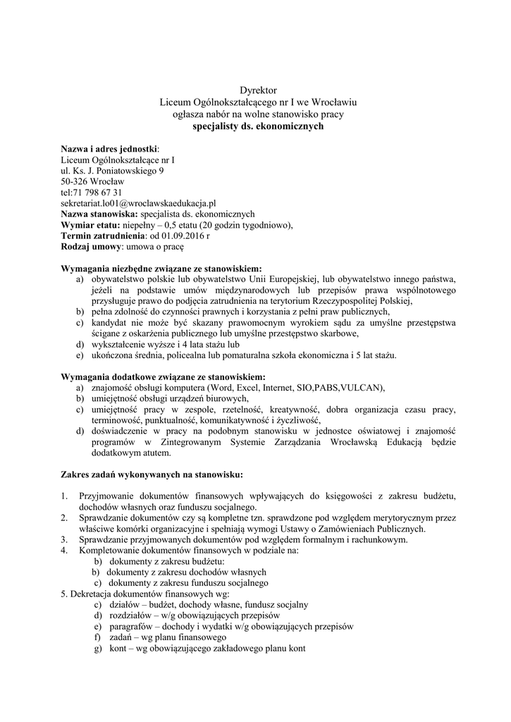 Dyrektor Liceum Ogólnokształcącego nr I we Wrocławiu ogłasza nabór na wolne stanowisko pracy specjalisty ds. ekonomicznych Nazwa i adres jednostki: Liceum Ogólnokształcące nr I ul. Ks. J. Poniatowskiego 9 50-326 Wrocław tel:71 798 67 31 [email protected] Nazwa stanowiska: specjalista ds. ekonomicznych Wymiar etatu: niepełny – 0,5 etatu (20 godzin tygodniowo), Termin zatrudnienia: od 01.09.2016 r Rodzaj umowy: umowa o pracę Wymagania niezbędne związane ze stanowiskiem: a) obywatelstwo polskie lub obywatelstwo Unii Europejskiej, lub obywatelstwo innego państwa, jeżeli na podstawie umów międzynarodowych lub przepisów prawa wspólnotowego przysługuje prawo do podjęcia zatrudnienia na terytorium Rzeczypospolitej Polskiej, b) pełna zdolność do czynności prawnych i korzystania z pełni praw publicznych, c) kandydat nie może być skazany prawomocnym wyrokiem sądu za umyślne przestępstwa ścigane z oskarżenia publicznego lub umyślne przestępstwo skarbowe, d) wykształcenie wyższe i 4 lata stażu lub e) ukończona średnia, policealna lub pomaturalna szkoła ekonomiczna i 5 lat stażu. Wymagania dodatkowe związane ze stanowiskiem: a) znajomość obsługi komputera (Word, Excel, Internet, SIO,PABS,VULCAN), b) umiejętność obsługi urządzeń biurowych, c) umiejętność pracy w zespole, rzetelność, kreatywność, dobra organizacja czasu pracy, terminowość, punktualność, komunikatywność i życzliwość, d) doświadczenie w pracy na podobnym stanowisku w jednostce oświatowej i znajomość programów w Zintegrowanym Systemie Zarządzania Wrocławską Edukacją będzie dodatkowym atutem. Zakres zadań wykonywanych na stanowisku: Przyjmowanie dokumentów finansowych wpływających do księgowości z zakresu budżetu, dochodów własnych oraz funduszu socjalnego. 2. Sprawdzanie dokumentów czy są kompletne tzn. sprawdzone pod względem merytorycznym przez właściwe komórki organizacyjne i spełniają wymogi Ustawy o Zamówieniach Publicznych. 3. Sprawdzanie przyjmowanych dokumentów pod względem formalnym i rachunkowym. 4. Kompletowanie dokumentów finansowych w podziale na: b) dokumenty z zakresu budżetu: b) dokumenty z zakresu dochodów własnych c) dokumenty z zakresu funduszu socjalnego 5. Dekretacja dokumentów finansowych wg: c) działów – budżet, dochody własne, fundusz socjalny d) rozdziałów – w/g obowiązujących przepisów e) paragrafów – dochody i wydatki w/g obowiązujących przepisów f) zadań – wg planu finansowego g) kont – wg obowiązującego zakładowego planu kont 1. 6. Przekazywanie kompletu sprawdzonych i zadekretowanych dokumentów księgowo – finansowych dotyczących działalności jednostki do akceptacji (podpisu) głównemu księgowemu i dyrektorowi jednostki. 7. Prowadzenie rejestru kopii umów w zakresie „mediów”, ochrony mienia, itp. niezbędnych do działalności jednostki. 8. Prowadzenie rejestru kopii umów dotyczących wynajmu sal lekcyjnych, sal wychowania fizycznego i innych pomieszczeń osobom fizycznym i prawnym. 9. Sprawdzanie poprawności wystawienia faktur VAT dotyczących wynajmu, monitorowanie terminowości wpłat należności przez kontrahentów, a także odprowadzania naliczonego podatku VAT do Urzędu Skarbowego w terminie określonym w przepisach o podatku VAT. 10. Uzgadnianie miesięczne dotacji finansowych otrzymanych z jednostki nadrzędnej . 11. Sporządzanie comiesięcznych not księgowych z zakresu płac i pochodnych w rozbiciu na rozdziały, paragrafy i zadania na podstawie zbiorczych zestawień list plac, 12. Współpraca z kierownikiem gospodarczym w zakresie organizacji i gospodarowania zasobami pieniężnymi i majątkiem znajdującym się na terenie jednostki. 13. Współpraca z głównym księgowym przy pracach finansowych , w tym przy opracowywaniu budżetu jednostki oraz sporządzaniu bilansu i niezbędnych sprawozdań. 14. Przygotowywanie, kontrolowanie i wykonywanie dyspozycji bankowych w celu realizacji płatności budżetowych i innych. Załatwianie czynności związanych z wypłatą wynagrodzeń i innymi płatnościami, tj. wykonywanie elektronicznych dyspozycji bankowych w programie usług bankowych, obowiązującym w szkole. 15. Sporządzanie i wysyłka drogą e-mailową zapotrzebowania środków na bieżące faktury. 16. Księgowanie planu, dokumentów księgowych w programie Księgowość Optivum z zakresu RDSJO. Sporządzanie sprawozdania Rb-34S w systemie Vulcan oraz sprawozdania opisowego z wykonania planu RDSJO. 17. Archiwizowanie dokumentacji. 18. Wykonywanie innych prac zleconych przez dyrektora szkoły związanych z prawidłowym, bieżącym funkcjonowaniem jednostki. Warunki pracy na stanowisku: Praca przy komputerze. Wskaźnik zatrudnienia osób niepełnosprawnych w jednostce: w lipcu 2016 wskaźnik zatrudnienia osób niepełnosprawnych w Liceum Ogólnokształcącym nr I we Wrocławiu , w rozumieniu przepisów o rehabilitacji zawodowej i społecznej oraz zatrudnienia osób niepełnosprawnych, wynosił mniej niż 4 %. Wymagane dokumenty: a) CV z przebiegiem nauki i pracy zawodowej; b) List motywacyjny; c) Kopie dokumentów potwierdzających wymagane wykształcenie; d) Kopie dokumentów potwierdzających wymagane doświadczenie zawodowe (dodatkowo w przypadku pozostawania w stosunku pracy zaświadczenie o zatrudnieniu, zawierające okres zatrudnienia); e) Oświadczenie o posiadanym obywatelstwie; f) Kopia dokumentu potwierdzająca znajomość języka polskiego (dot. osób nieposiadających obywatelstwa polskiego); g) Oświadczenie o pełnej zdolności do czynności prawnych oraz korzystaniu z pełni praw publicznych; h) Oświadczenie, że kandydat nie był skazany prawomocnym wyrokiem sądu za umyślne przestępstwo ścigane z oskarżenia publicznego lub umyślne przestępstwo skarbowe; i) Dokumenty aplikacyjne: list motywacyjny, CV powinny być opatrzone klauzulą: „Wyrażam zgodę na przetwarzanie moich danych osobowych zawartych w ofercie pracy dla potr