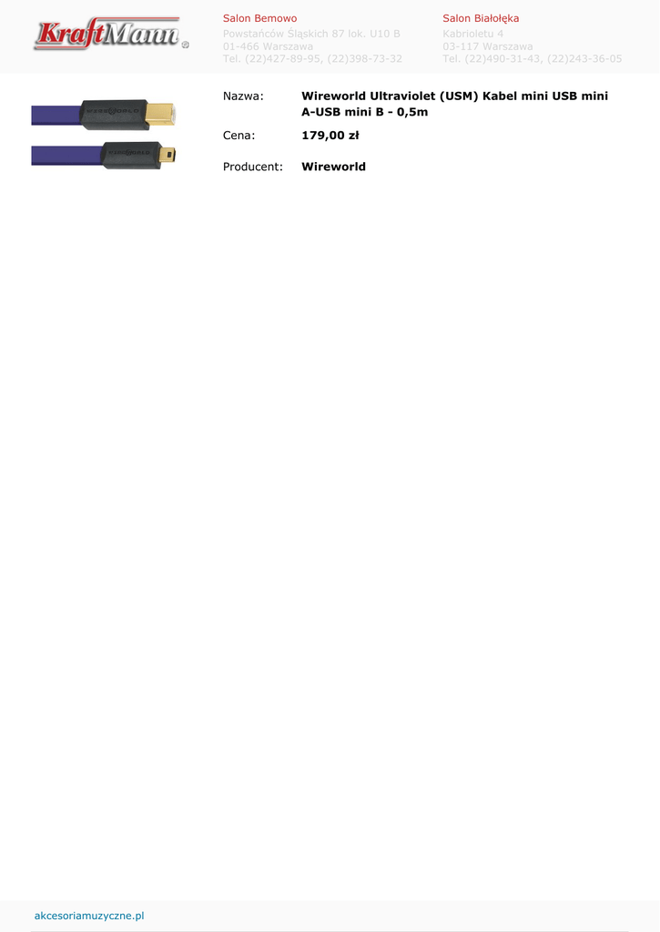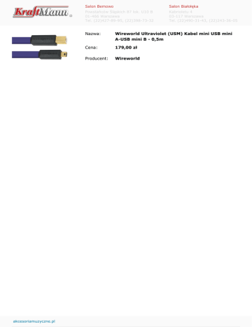 akcesoriamuzyczne.pl Salon Bemowo Salon Białołęka Powstańców Śląskich 87 lok. U10 B 01-466 Warszawa Tel. (22)427-89-95, (22)398-73-32 Kabrioletu 4 03-117 Warszawa Tel. (22)490-31-43, (22)243-36-05 Nazwa: Wireworld Ultraviolet (USM) Kabel mini USB mini A-USB mini B - 0,5m Cena: 179,00 zł Producent: Wireworld