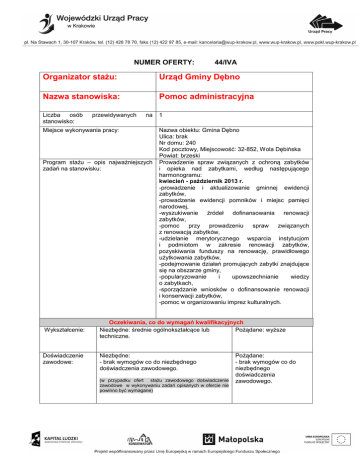 NUMER OFERTY: 44/IVA Organizator stażu: Urząd Gminy Dębno Nazwa stanowiska: Pomoc administracyjna Liczba osób stanowisko: przewidywanych na Miejsce wykonywania pracy: Program stażu – opis najważniejszych zadań na stanowisku: Wykształcenie: Doświadczenie zawodowe: 1 Nazwa obiektu: Gmina Dębno Ulica: brak Nr domu: 240 Kod pocztowy, Miejscowość: 32-852, Wola Dębińska Powiat: brzeski Prowadzenie spraw związanych z ochroną zabytków i opieka nad zabytkami, według następującego harmonogramu: kwiecień - październik 2013 r. -prowadzenie i aktualizowanie gminnej ewidencji zabytków, -prowadzenie ewidencji pomników i miejsc pamięci narodowej, -wyszukiwanie źródeł dofinansowania renowacji zabytków, -pomoc przy prowadzeniu spraw związanych z renowacją zabytków, -udzielanie merytorycznego wsparcia instytucjom i podmiotom w zakresie renowacji zabytków, pozyskiwania funduszy na renowację, prawidłowego użytkowania zabytków, -podejmowanie działań promujących zabytki znajdujące się na obszarze gminy, -popularyzowanie i upowszechnianie wiedzy o zabytkach, -sporządzanie wniosków o dofinansowanie renowacji i konserwacji zabytków, -pomoc w organizowaniu imprez kulturalnych. Oczekiwania, co do wymagań kwalifikacyjnych Niezbędne: średnie ogólnokształcące lub Pożądane: wyższe techniczne. Niezbędne: - brak wymogów co do niezbędnego doświadczenia zawodowego. (w przypadku ofert stażu zawodowego doświadczenie zawodowe w wykonywaniu zadań opisanych w ofercie nie powinno być wymagane) Pożądane: - brak wymogów co do niezbędnego doświadczenia zawodowego. Umiejętności: Niezbędne: - podstawowa znajomość obsługi komputera i programów komputerowych (MS Word, Power point). Pożądane: - dobra znajomość obsługi komputera i programów komputerowych (MS Word, Power point), - umiejętność samodzielnej pracy. Cechy osobowe: Niezbędne: - odpowiedzialność, - komunikatywność, - pracowitość. Pożądane: - dokładność, - zdyscyplinowanie. Oferta jest kierowana również do osób z niepełnosprawnością - Nie Umiejętności, które osoba nabędzie na stanowisku: - umiejętność tworzenia elektronicznych baz danych, - umiejętność organizacji czasu pracy, - umiejętność samodzielnej pracy, - umiejętność obsługi aparatu fotograficznego, - umiejętności sporządzania wniosków o pozyskiwanie funduszy europejskich, - umiejętność obsługiwania programów komputerowych (MS Word, Power point). Sposób organizacji pracy – czas pracy; np. Czy stanowisko wymaga dyspozycyjności w soboty/ niedzielę/ święta? Praca od poniedziałku do piątku w godzinach pracy urzędu (poniedziałek od 8.00-16.00, wtorek – piątek od 7.30 do15.30). Stanowisko nie wymaga dyspozycyjności w soboty, niedziele, święta. Czy istnieje możliwość zatrudnienia uczestnika/ów projektu przez Wnioskodawcę po zakończeniu ich udziału w projekcie? Wymagania odnośnie warunków zatrudnienia: • minimalny czas zatrudnienia: 4 miesiące; • zatrudnienie najpóźniej od stycznia 2014r; • umowa o pracę/ umowa zlecenie (brak wymogów odnośnie wymiaru etatu) - Tak, deklarowana liczba osób: 1 osoba, zatrudnienie na 5 miesięcy, umowa o pracę na pół etatu, zawarcie umowy bezpośrednio po zakończeniu zatrudnienia w ramach projektu.
