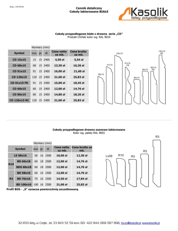 Kęty, 1.04.2016r. Cennik detaliczny Cokoły lakierowane BIAŁE Cokoły przypodłogowe białe z drewna seria „CD” Produkt Chiński kolor wg. RAL 9010 Wymiary (mm) Symbol CD 15x15 CD 68x15 CD 91x15 CD 120x15 wys. gr. 15 68 91 dł. 15 2400 15 2400 15 2400 Cena netto za mb. Cena brutto za mb. 4,50 zł 5,54 zł 13,30 zł 16,00 zł 120x15 91x15 FR 91x15 16,36 zł 80x15 21,60 zł 120 15 2400 21,00 zł 25,83 zł CD 91x15 FR 91 15 2400 15,00 zł 18,45 zł CD 60x15 60 15 2400 12,00 zł 14,76 zł CD 80x15 80 15 2400 14,80 zł 18,20 zł 120 15 2400 21,00 zł 25,83 zł CD 120x15 RC 120x15 RC 80x15 RC 68x15 60x15 Cokoły przypodłogowe drewno sosnowe lakierowane Kolor wg. palety RAL 9003 R3 Wymiary (mm) Symbol LS 58x16 R10 R3 wys. gr. dł. Cena netto Cena brutto za za mb. mb. 58 16 2500 10,00 zł 12,30 zł BD 60x18 60 18 2500 12,00 zł 14,76 zł BDS 60x18 60 18 2500 12,00 zł 14,76 zł BD 58x16 60 16 2500 12,00 zł 14,76 zł BD 70x16 70 16 2500 14,50 zł 17,84 zł BD 100x16 100 16 2500 21,00 zł 25,83 zł R3 Ls58 R10 R3 Profil BDS - „S” oznacza powierzchnię szczotkowaną 32-650 Kety ul. Czajki , tel. 33 843 52 59 kom. 601 422 844, 669 587 896, [email protected] www.kasolik.pl Kęty, 1.04.2016r. Cokoły przypodłogowe białe z MDF'u W standardzie tył listwy zabezpieczony przed wilgocią. Wymiary (mm) Symbol R3 KOLOR STANDARD RAL 9003 Cena netto za mb. wys. gr. dł. 70x12 70 12 2600 10,50 zł 80x12 80 12 2600 11,00 zł 100x12 100 12 2600 11,50 zł 60x16 60 16 2600 10,50 zł 80x16 80 16 2600 11,30 zł 100x16 100 16 2600 12,50 zł 60x18 60 18 2600 11,00 zł R10 80x18 80 18 2600 11,50 zł 100x18 100 18 2600 14,00 zł R25 80x16 80 16 2600 12,40 zł RS 80x16 80 16 2600 12,50 zł RF 80x18 80 18 2600 14,00 zł 80x16 80 16 2600 12,50 zł 100x16 100 16 2600 13,80 zł 80 16 2600 12,50 zł 100x16 100 16 2600 13,80 zł 80 18 2600 15,00 zł 100x18 100 18 2600 16,00 zł 120x18 120 18 2600 18,50 zł F1 F2 F3 F4 80x16 80x18 Cena za kolor RAL lub NCS zależna od wielkości zamówienia 2,6-20,8 mb. + 200zł netto 23,4-52 mb. Powyżej 106,6 54,6-104 mb. mb. +6 zł/mb. +5 zł/mb. +4 zł/mb. +8 zł/mb. +7 zł/mb. +5 zł/mb. +6 zł/mb. +5 zł/mb. +4 zł/mb. +8 zł/mb. +7 zł/mb. +5 zł/mb. +6 zł/mb. +5 zł/mb. +4 zł/mb. +8 zł/mb. +7 zł/mb. +5 zł/mb. +6 zł/mb. +5 zł/mb. +4 zł/mb. +10 zł/mb. +8 zł/mb. +6 zł/mb. (koszt wykonania zamówienia bez względu na ilość mb.) Termin realizacji listwy w kolorach RAL i NCS od 7-15 dni roboczych. Wymagana zaliczka 40% wartości zamówienia. F4 F3 R10 R25 RS RF F1 F2 R3 32-650 Kety ul. Czajki , tel. 33 843 52 59 kom. 601 422 844, 669 587 896, [email protected] www.kasolik.pl