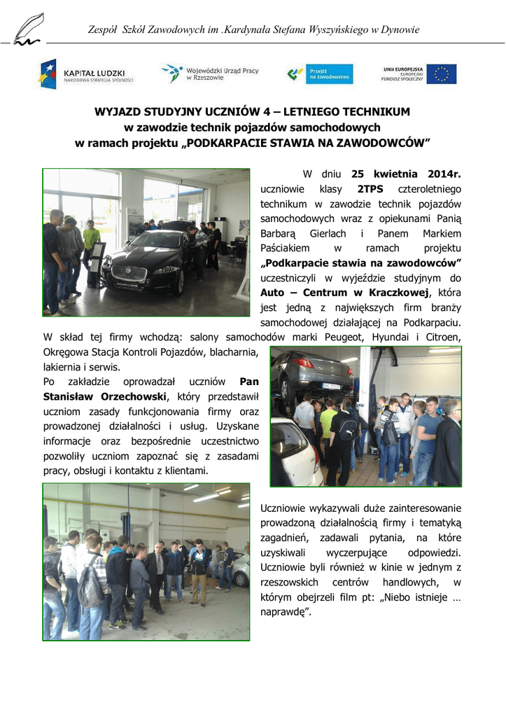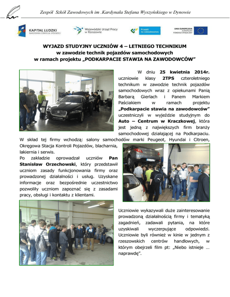 Zespół Szkół Zawodowych im .Kardynała Stefana Wyszyńskiego w Dynowie WYJAZD STUDYJNY UCZNIÓW 4 – LETNIEGO TECHNIKUM w zawodzie technik pojazdów samochodowych w ramach projektu „PODKARPACIE STAWIA NA ZAWODOWCÓW” W dniu 25 kwietnia 2014r. uczniowie klasy 2TPS czteroletniego technikum w zawodzie technik pojazdów samochodowych wraz z opiekunami Panią Barbarą Gierlach i Panem Markiem Paściakiem w ramach projektu „Podkarpacie stawia na zawodowców” uczestniczyli w wyjeździe studyjnym do Auto – Centrum w Kraczkowej, która jest jedną z największych firm branży samochodowej działającej na Podkarpaciu. W skład tej firmy wchodzą: salony samochodów marki Peugeot, Hyundai i Citroen, Okręgowa Stacja Kontroli Pojazdów, blacharnia, lakiernia i serwis. Po zakładzie oprowadzał uczniów Pan Stanisław Orzechowski, który przedstawił uczniom zasady funkcjonowania firmy oraz prowadzonej działalności i usług. Uzyskane informacje oraz bezpośrednie uczestnictwo pozwoliły uczniom zapoznać się z zasadami pracy, obsługi i kontaktu z klientami. Uczniowie wykazywali duże zainteresowanie prowadzoną działalnością firmy i tematyką zagadnień, zadawali pytania, na które uzyskiwali wyczerpujące odpowiedzi. Uczniowie byli również w kinie w jednym z rzeszowskich centrów handlowych, w którym obejrzeli film pt: „Niebo istnieje … naprawdę”.