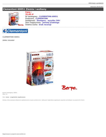Informacje o produkcie Utworzono 04-03-2017 Clementoni 60051 Ziemia i wulkany Cena : 32,00 zł Nr katalogowy : CLEMENTONI.60051 Producent : CLEMENTONI Dostępność : Dostępny - wysyłka 24h! Stan magazynowy : poniżej średniego Średnia ocena : brak recenzji CLEMENTONI 60051 ZIEMIA I WULKANY Numer katalogowy: 60051 Wiek: 8+ Stan: nowe - oryginalnie zapakowane Zestaw, który pozwala odtwarzać spektakularne erupcje wulkaniczne i odkrywać najbardziej sugestywne zjawiska zachodzące na powierzchni Ziemi. Wygenerowano w programie www.oscGold.com Dostępność w salonach: Ilość sztuk: Sklep - Złotniki: 2 Sklep - zlikwidowany: 0 Sklep - Szczepankowo: 1 Dostępne opcje Clementoni 60051 Ziemia i wulkany » Wiek: 8 - 11 lat, 12 lat i więcej.