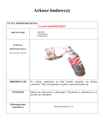 Arkusz badawczy TYTUŁ DOŚWIADCZENIA: CocaCola&MLEKO? ODCZYNNIKI - MLEKO - COCACOLA - ŁYŻECZKA SCHEMAT DOŚWIADCZENIA /uproszczony rysunek/ OBSERWACJE Po sześciu godzinach na dnie butelki pojawiły się drobne „okruszki”. Przy wstrząśnięciu szybko rozprzestrzeniały się. WNIOSEK Mleko ma właściwości „odkażające”. Rozdziela w substancji to, co jest dla nas szkodliwe. Doświadczenie wykonał/-a: Kaja Miedzińska kl. 1e Arkusz badawczy TYTUŁ DOŚWIADCZENIA: „Ciecz nienewtonowska” SZKŁO LABORATORYJNE ODCZYNNIKI półmisek miska łyżka szklanki -skrobia (MĄKA) ziemniaczana -woda -moneta -zabawka SCHEMAT DOŚWIADCZENIA /uproszczony rysunek/ OBSERWACJE Ciecz nie zachowuje się jak typowa ciecz np.woda. Uderzając w nią pięścią, nasza dłoń się odbije od niej. Kiedy jednak delikatnie włożymy rękę w ciecz nienewtonowską, ta zostanie zalana przez płyn. WNIOSEK Dodatkowym czynnikiem, wpływającym na lepkość cieczy jest CIŚNIENIE. Doświadczenie wykonał/-a: Emilia Bazylińska,kl.1e Arkusz badawczy TYTUŁ DOŚWIADCZENIA: Musujące produkty do kąpieli SZKŁO LABORATORYJNE ODCZYNNIKI miska lub garnek łyżka foremki do lodu i babeczek szklanka kwas cytrynowy soda oczyszczona oliwka kosmetyczna barwnik spożywcz aromat cukier waniliowy SCHEMAT DOŚWIADCZENIA /uproszczony rysunek/ OBSERWACJE WNIOSEK Doświadczenie wykonał/-a: Kiedy wlaliśmy oliwkę produkty nie zaczęły się pienić. Po wymieszaniu składników masa przypomina mokry piasek. Podczas kąpieli, kiedy wrzucimy kosmetyk do wody zaczyna on musować i się rozpuszczać. Soda + kwas cytrynowy podczas styczności z wodą mają właściwości musujące. Oliwka kosmetyczna dobrze nawilża ciało. Wiktoria Jazienicka, kl.1e Arkusz badawczy TYTUŁ DOŚWIADCZENIA: Gaszenie świeczki za pomocą CO2 SZKŁO LABORATORYJNE I ODCZYNNIKI SCHEMAT - Miska lub inne naczynie - Świeczka - Ocet - Soda - Chochelka 1. Do miski wsypujemy sodę. DOŚWIADCZENIA 2. Dolewamy ocet. /uproszczony rysunek/ 3. Między sodą, a octem zachodzi reakcja chemiczna, której wynikiem jest otrzymanie piany i CO2 4. Chochelką nabieramy gaz powstały w misce i "wylewamy go na świeczkę" OBSERWACJE WNIOSEK Doświadczenie wykonał/-a: Świeczka zgasła. Dwutlenek węgla odcina dopływ tlenu potrzebnego w czasie spalania, przez co świeczka gaśnie Hubert Barcikowski 1e Arkusz badawczy TYTUŁ DOŚWIADCZENIA: Zegar jodowy SZKŁO LABORATORYJNE I ODCZYNNIKI ODCZYNNIKI - 3 zlewki - łyżeczka - mieszadełko - jodyna - napój witaminowy - woda utleniona - skrobia SCHEMAT DOŚWIADCZENIA /uproszczony rysunek/ OBSERWACJE Pomarańczowy płyn w połączeniu z przezroczystym staje się czarny WNIOSEK Jodyna reaguje ze skrobią barwiąc roztwór na kolor czarny. Doświadczenie wykonał/-a: Kacper Targoni, kl.Ie Arkusz badawczy TYTUŁ DOŚWIADCZENIA: Szalona piana SZKŁO LABORATORYJNE I ODCZYNNIKI ODCZYNNIKI - Szklanka, - wysokie naczynie, - plastikowy kubeczek, - lejek, - łyżki,łyżeczki. -Woda utleniona(szklanka),płyn do mycia naczyń,suszone drożdze,barwnik. SCHEMAT DOŚWIADCZENIA /uproszczony rysunek/ Woda utleniona ,oraz barwnik z wodą ,płynem do mycia naczyń z drożdzami. OBSERWACJE Po wymieszaniu wszystkie składniki zmieszają się i wypłyną w postaci piany. Wymieszane składniki w postaci piany. WNIOSEK Doświadczenie wykonał/-a: Po wymieszaniu wszystkich składników zaczynają one rosnąć oraz wypływają ze szkła w postaci piany. Wiktoria Sypień, kl.Ie