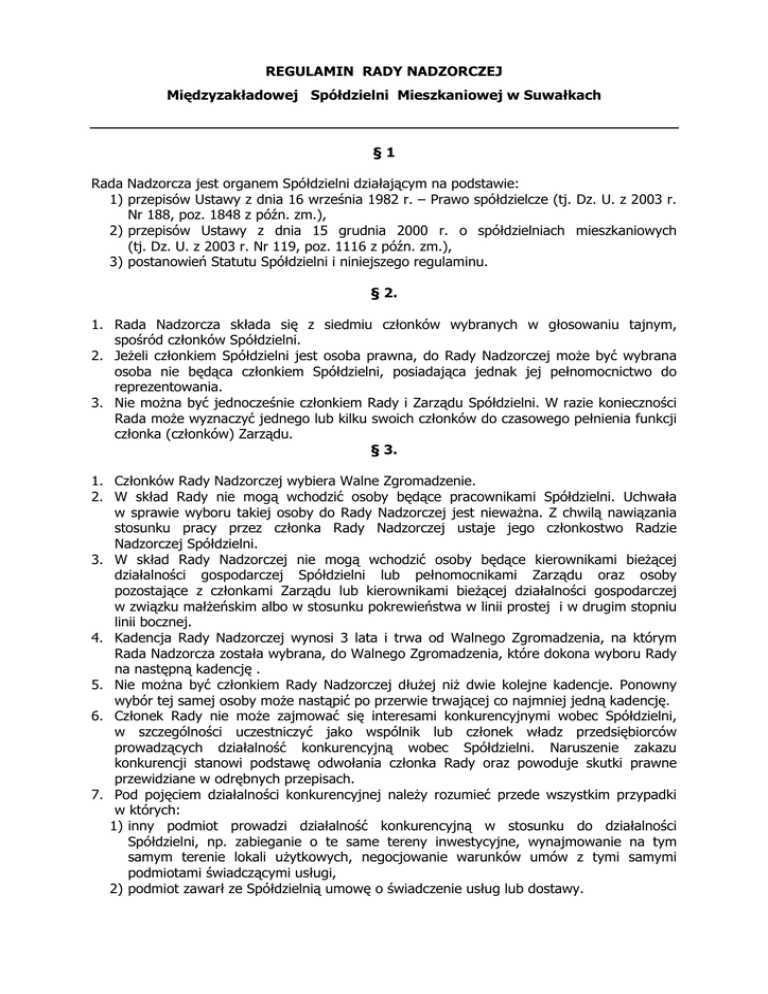 REGULAMIN RADY NADZORCZEJ Międzyzakładowej Spółdzielni Mieszkaniowej w Suwałkach §1 Rada Nadzorcza jest organem Spółdzielni działającym na podstawie: 1) przepisów Ustawy z dnia 16 września 1982 r. – Prawo spółdzielcze (tj. Dz. U. z 2003 r. Nr 188, poz. 1848 z późn. zm.), 2) przepisów Ustawy z dnia 15 grudnia 2000 r. o spółdzielniach mieszkaniowych (tj. Dz. U. z 2003 r. Nr 119, poz. 1116 z późn. zm.), 3) postanowień Statutu Spółdzielni i niniejszego regulaminu. § 2. 1. Rada Nadzorcza składa się z siedmiu członków wybranych w głosowaniu tajnym, spośród członków Spółdzielni. 2. JeŜeli członkiem Spółdzielni jest osoba prawna, do Rady Nadzorczej moŜe być wybrana osoba nie będąca członkiem Spółdzielni, posiadająca jednak jej pełnomocnictwo do reprezentowania. 3. Nie moŜna być jednocześnie członkiem Rady i Zarządu Spółdzielni. W razie konieczności Rada moŜe wyznaczyć jednego lub kilku swoich członków do czasowego pełnienia funkcji członka (członków) Zarządu. § 3. 1. Członków Rady Nadzorczej wybiera Walne Zgromadzenie. 2. W skład Rady nie mogą wchodzić osoby będące pracownikami Spółdzielni. Uchwała w sprawie wyboru takiej osoby do Rady Nadzorczej jest niewaŜna. Z chwilą nawiązania stosunku pracy przez członka Rady Nadzorczej ustaje jego członkostwo Radzie Nadzorczej Spółdzielni. 3. W skład Rady Nadzorczej nie mogą wchodzić osoby będące kierownikami bieŜącej działalności gospodarczej Spółdzielni lub pełnomocnikami Zarządu oraz osoby pozostające z członkami Zarządu lub kierownikami bieŜącej działalności gospodarczej w związku małŜeńskim albo w stosunku pokrewieństwa w linii prostej i w drugim stopniu linii bocznej. 4. Kadencja Rady Nadzorczej wynosi 3 lata i trwa od Walnego Zgromadzenia, na którym Rada Nadzorcza została wybrana, do Walnego Zgromadzenia, które dokona wyboru Rady na następną kadencję . 5. Nie moŜna być członkiem Rady Nadzorczej dłuŜej niŜ dwie kolejne kadencje. Ponowny wybór tej samej osoby moŜe nastąpić po przerwie trwającej co najmniej jedną kadencję. 6. Członek Rady nie moŜe zajmować się interesami konkurencyjnymi wobec Spółdzielni, w szczególności uczestniczyć jako wspólnik lub członek władz przedsiębiorców prowadzących działalność konkurencyjną wobec Spółdzielni. Naruszenie zakazu konkurencji stanowi podstawę odwołania członka Rady oraz powoduje skutki prawne przewidziane w odrębnych przepisach. 7. Pod pojęciem działalności konkurencyjnej naleŜy rozumieć przede wszystkim przypadki w których: 1) inny podmiot prowadzi działalność konkurencyjną w stosunku do działalności Spółdzielni, np. zabieganie o te same tereny inwestycyjne, wynajmowanie na tym samym terenie lokali uŜytkowych, negocjowanie warunków umów z tymi samymi podmiotami świadczącymi usługi, 2) podmiot zawarł ze Spółdzielnią umowę o świadczenie usług lub dostawy. 8. W wypadku naruszenia przez członka Rady Nadzorczej zakazu konkurencji określonego w ust. 6 – Rada moŜe podjąć uchwałę o zawieszeniu członka Rady w pełnieniu czynności. 9. Zarząd w terminie czterech tygodni od podjęcia uchwały, o której mowa w ust. 8 zwołuje posiedzenie Walnego Zgromadzenia w celu rozstrzygnięcia o uchyleniu zawieszenia bądź odwołaniu zawieszonego członka Rady Nadzorczej. 10. Członek Rady odpowiada wobec Spółdzielni za szkodę wyrządzoną działaniem lub zaniedbaniem sprzecznym z prawem lub postanowieniami Statutu Spółdzielni, chyba, Ŝe nie ponosi winy. 11. Do odpowiedzialności członków Rady Nadzorczej mają odpowiednie zastosowanie przepisy karne zawarte w części II A ustawy Prawo spółdzielcze. § 4. 1. Mandat członka Rady Nadzorczej wygasa z upływem kadencji, na którą został wybrany. 2. Utrata mandatu przed upływem kadencji następuje w przypadku: 1) odwołania większością 2/3 głosów członków biorących udział w głosowaniu Walnego Zgromadzenia, 2) zrzeczenia się mandatu, 3) ustania członkostwa w Spółdzielni. 3. Na miejsce członka Rady Nadzorczej, który utracił mandat, do Rady wchodzi kandydat, który uzyskał w wyborach kolejno największą ilość głosów, a w razie braku takich osób dokonuje się wyboru nowego członka do końca kadencji Rady, na najbliŜszym Walnym Zgromadzeniu. 4. Zmniejszenie składu Rady Nadzorczej nie powoduje automatycznie utraty przez Radę Nadzorczą zdolności do pełnienia funkcji, o ile skład Rady Nadzorczej nie będzie liczył mniej niŜ czterech członków Rady. § 5. 1. Rada Nadzorcza sprawuje nadzór i kontrolę nad działalnością Spółdzielni. 2. Do zakresu działań Rady Nadzorczej naleŜy: 1) uchwalanie planów gospodarczych i programów działalności społeczno – kulturalnej oraz zasad gospodarki finansowej Spółdzielni, 2) nadzór i kontrola działalności Spółdzielni, a w szczególności : a) badanie okresowych sprawozdań oraz sprawozdań finansowych, b) dokonywanie okresowych ocen wykonania przez Spółdzielnię jej zadań gospodarczych, ze specjalnym uwzględnieniem przestrzegania przez Spółdzielnię praw jej członków, c) przeprowadzanie kontroli nad sposobem załatwiania przez Zarząd wniosków organów Spółdzielni i poszczególnych jej członków, 3) podejmowanie uchwał w sprawie nabycia nieruchomości oraz zakładu lub innej jednostki organizacyjnej, 4) podejmowanie uchwał w sprawie przystąpienia do innych organizacji społecznych oraz występowania z nich, 5) zatwierdzanie struktury organizacyjnej Spółdzielni, 6) rozpatrywanie skarg na działalność Zarządu, 7) składanie Walnemu Zgromadzeniu sprawozdań zawierających w szczególności wyniki kontroli i ocenę sprawozdań finansowych, 8) podejmowanie uchwał w sprawach czynności prawnych dokonywanych pomiędzy Spółdzielnią lub dokonywanych przez Spółdzielnię w interesie członka Zarządu oraz reprezentowanie Spółdzielni przy tych czynnościach; do reprezentowania Spółdziel