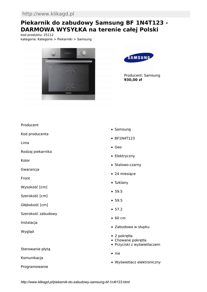 http://www.klikagd.pl Piekarnik do zabudowy Samsung BF 1N4T123 DARMOWA WYSYŁKA na terenie całej Polski kod produktu: 25112 kategoria: Kategorie > Piekarniki > Samsung Producent: Samsung 930,00 zł Producent Samsung Kod producenta BF1N4T123 Linia Geo Rodzaj piekarnika Elektryczny Kolor Stalowo-czarny Gwarancja 24 miesiące Front Szklany Wysokość [cm] 59.5 Szerokość [cm] 59.5 Głębokość [cm] 57.2 Szerokość zabudowy 60 cm Instalacja Zabudowa w słupku Wygląd 2 pokrętła Chowane pokrętła Przyciski z wyświetlaczem Sterowanie płytą nie Komunikacja Wyświetlacz elektroniczny Programowanie http://www.klikagd.pl/piekarnik-do-zabudowy-samsung-bf-1n4t123.html Minutnik Termoregulator [st. C] Od 40 do 270 Sterowanie Sterowanie elektroniczne Grill tak Wymuszony obieg powietrza tak Rodzaje funkcji Funkcja Pizza Grill elektryczny Ogrzewanie górne i dolne Termoobieg Termoobieg + grzejnik górny Rożen obrotowy nie Termosonda nie Inne 2 x termoobieg + 2 grzałki grilla + górny i dolny opiekacz Klasa energetyczna A Pojemność piekarnika 65 l Ilość szyb w drzwiach 3 Czyszczenie piekarnika Kataliza Oświetlenie wnętrza Tak Zabezpieczenia Przed dziećmi Zalecany model płyty Nie dotyczy Zastosowane technologie Wkłady katalityczne Załączone wyposażenie 2 tace Ruszt http://www.klikagd.pl/piekarnik-do-zabudowy-samsung-bf-1n4t123.html
