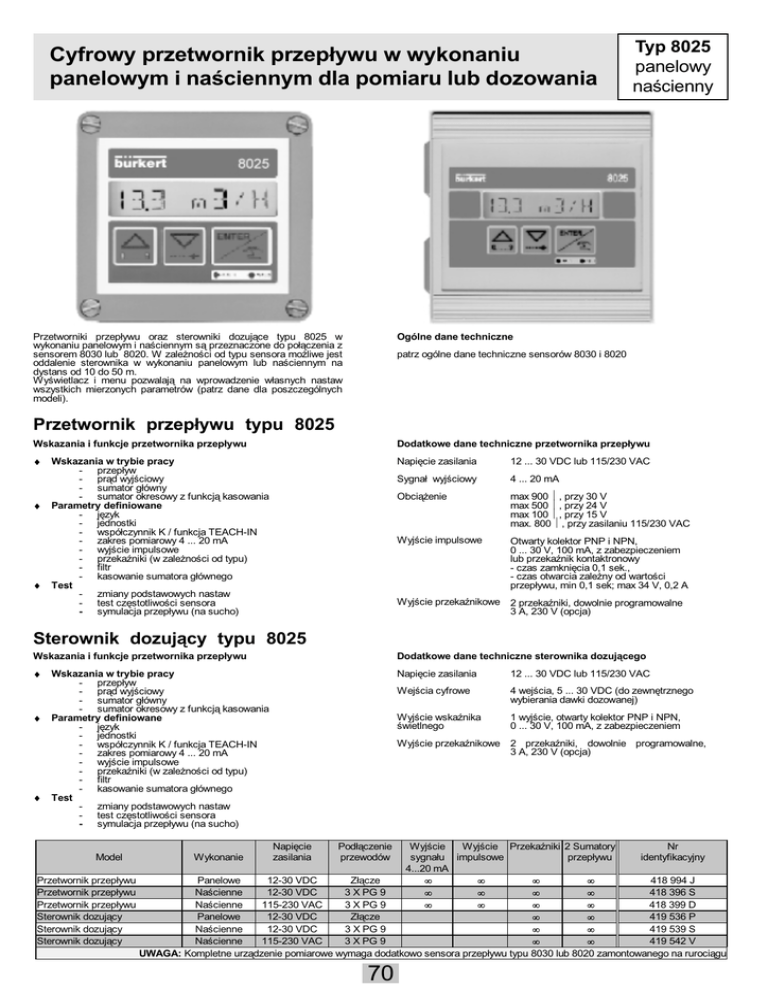 Cyfrowy przetwornik przep³ywu w wykonaniu panelowym i naciennym dla pomiaru lub dozowania Przetworniki przep³ywu oraz sterowniki dozuj¹ce typu 8025 w wykonaniu panelowym i naciennym s¹ przeznaczone do po³¹czenia z sensorem 8030 lub 8020. W zale¿noci od typu sensora mo¿liwe jest oddalenie sterownika w wykonaniu panelowym lub naciennym na dystans od 10 do 50 m. Wywietlacz i menu pozwalaj¹ na wprowadzenie w³asnych nastaw wszystkich mierzonych parametrów (patrz dane dla poszczególnych modeli). Typ 8025 panelowy nacienny Ogólne dane techniczne patrz ogólne dane techniczne sensorów 8030 i 8020 Przetwornik przep³ywu typu 8025 Wskazania i funkcje przetwornika przep³ywu Dodatkowe dane techniczne przetwornika przep³ywu ♦ Napiêcie zasilania 12 ... 30 VDC lub 115/230 VAC Sygna³ wyjciowy 4 ... 20 mA Obci¹¿enie max 900 Ω, przy 30 V max 500 Ω, przy 24 V max 100 Ω, przy 15 V max. 800 Ω, przy zasilaniu 115/230 VAC Wyjcie impulsowe Otwarty kolektor PNP i NPN, 0 ... 30 V, 100 mA, z zabezpieczeniem lub przekanik kontaktronowy - czas zamkniêcia 0,1 sek., - czas otwarcia zale¿ny od wartoci przep³ywu, min 0,1 sek; max 34 V, 0,2 A ♦ ♦ Wskazania w trybie pracy przep³yw pr¹d wyjciowy sumator g³ówny sumator okresowy z funkcj¹ kasowania Parametry definiowane jêzyk jednostki wspó³czynnik K / funkcja TEACH-IN zakres pomiarowy 4 ... 20 mA wyjcie impulsowe przekaniki (w zale¿noci od typu) filtr kasowanie sumatora g³ównego Test zmiany podstawowych nastaw test czêstotliwoci sensora symulacja przep³ywu (na sucho) Wyjcie przekanikowe 2 przekaniki, dowolnie programowalne 3 A, 230 V (opcja) Sterownik dozuj¹cy typu 8025 Wskazania i funkcje przetwornika przep³ywu Dodatkowe dane techniczne sterownika dozuj¹cego ♦ Napiêcie zasilania 12 ... 30 VDC lub 115/230 VAC Wejcia cyfrowe 4 wejcia, 5 ... 30 VDC (do zewnêtrznego wybierania dawki dozowanej) Wyjcie wskanika wietlnego 1 wyjcie, otwarty kolektor PNP i NPN, 0 ... 30 V, 100 mA, z zabezpieczeniem ♦ ♦ Wskazania w trybie pracy przep³yw pr¹d wyjciowy sumator g³ówny sumator okresowy z funkcj¹ kasowania Parametry definiowane jêzyk jednostki wspó³czynnik K / funkcja TEACH-IN zakres pomiarowy 4 ... 20 mA wyjcie impulsowe przekaniki (w zale¿noci od typu) filtr kasowanie sumatora g³ównego Test zmiany podstawowych nastaw test czêstotliwoci sensora symulacja przep³ywu (na sucho) Wyjcie przekanikowe 2 przekaniki, dowolnie programowalne, 3 A, 230 V (opcja) Wyjcie Wyjcie Przekaniki 2 Sumatory Nr sygna³u impulsowe przep³ywu identyfikacyjny 4...20 mA Przetwornik przep³ywu Panelowe 12-30 VDC Z³¹cze 418 994 J • • • • Przetwornik przep³ywu Nacienne 12-30 VDC 3 X PG 9 418 396 S • • • • Przetwornik przep³ywu Nacienne 115-230 VAC 3 X PG 9 418 399 D • • • • Sterownik dozuj¹cy Panelowe 12-30 VDC Z³¹cze 419 536 P • • Sterownik dozuj¹cy Nacienne 12-30 VDC 3 X PG 9 419 539 S • • Sterownik dozuj¹cy Nacienne 115-230 VAC 3 X PG 9 419 542 V • • UWAGA: Kompletne urz¹dzenie pomiarowe wymaga dodatkowo sensora przep³ywu typu 8030 lub 8020 zamontowanego na ruroci¹gu Model Wykonanie Napiêcie zasilania Pod³¹czenie przewodów 70
