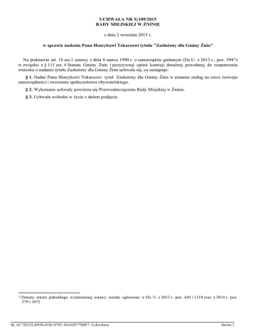 UCHWAŁA NR X/109/2015 RADY MIEJSKIEJ W ŻNINIE z dnia 2 września 2015 r. w sprawie nadania Panu Henrykowi Tokarzowi tytułu "Zasłużony dla Gminy Żnin" Na podstawie art. 18 ust.1 ustawy z dnia 8 marca 1990 r. o samorządzie gminnym (Dz.U. z 2013 r., poz. 5941)) w związku z § 111 ust. 4 Statutu Gminy Żnin i pozytywnej opinii komisji doraźnej powołanej do rozpatrzenia wniosku o nadanie tytułu Zasłużony dla Gminy Żnin uchwala się, co następuje: § 1. Nadać Panu Henrykowi Tokarzowi tytuł Zasłużony dla Gminy Żnin w uznaniu zasług na rzecz rozwoju samorządności i tworzenia społeczeństwa obywatelskiego. § 2. Wykonanie uchwały powierza się Przewodniczącemu Rady Miejskiej w Żninie. § 3. Uchwała wchodzi w życie z dniem podjęcia. 1) Zmiany tekstu jednolitego wymienionej ustawy zostały ogłoszone w Dz. U. z 2013 r. poz. 645 i 1318 oraz z 2014 r. poz. 379 i 1072 Id: AC73E232-D930-435E-87FC-824AFF77D0F7. Uchwalony Strona 1 UZASADNIENIE Pan Henryk Tokarz urodził się 18 kwietnia 1949 roku w Chełmży. Posiada wykształcenie wyższe ekonomiczne, w 2002 roku ukończył studia doktoranckie na Akademii Ekonomicznej w Poznaniu. Po wprowadzeniu stanu wojennego jako wolontariusz współpracujący z Prymasowskim Komitetem Pomocy Osobom Pozbawionym Wolności i ich Rodzinom mającym oddziałową siedzibę w Bazylice św. Wincentego a Paulo w Bydgoszczy aktywnie włączył się w kolportaż wydawnictw bezdebitowych zakazanych w PRL, bezcennych dla kultury i historii Polski, takich autorów jak Józef Mackiewicz, Sergiusz Piasecki, Melchior Wańkowicz, Czesław Miłosz, Leszek Kołakowski i wielu innych. Współorganizował również w ramach Tygodnika Kultury Chrześcijańskiej w owym czasie spotkania z ludźmi kultury w Żninie w tym z prof. Markiem Drozdowskim, prof. Tadeuszem Jasudowiczem, Stefanią Woytowicz czy Capellą Bydgostiensis. Wspierał również artystów, którzy odmówili po wprowadzeniu stanu wojennego publicznego wystąpienia w oficjalnych mediach, koncertując na zaproszenie w kościołach a byli to m.in. Piotr Szczepanik w Kościele św. Mikołaja w Gąsawie w roku 1986 z prezentacją w tymże kościele zakazanych filmów takich jak „Przesłuchanie” Ryszarda Bugajskiego czy włoska wersja filmu „Quo Vadis”. Po zmianach ustrojowych w Polsce w 1990 roku Pan Henryk Tokarz ratuje przed zamknięciem w Żninie, mieście 15 – tysięcznym księgarni Domu Książki przejmując jej zasoby księgarskie i powołując do życia Księgarnię Pałucką, która do dzisiaj pełni na Pałukach funkcję instytucji kultury, oprócz sprzedaży książek, podręczników, audiobooków, e – booków księgarnia prowadzi szeroką działalność kulturalną ze spotkaniami autorskimi włącznie. Z czytelnikami spotkało się wielu sławnych pisarzy czy poetów począwszy od Jerzego Sulimy – Kamińskiego, czy ostatnio z księdzem Adamem Bonieckim. W księgarni istnieje także stoisko promujące poetów regionalnych takich jak Stefan Pastuszewski, Jadwiga Stróżykiewicz, Jerzy Utkin, Jolanta Baziak, odbywają się także spotkania poetyckie w księgarni czy w miejscowych szkołach. Wspiera również miesięcznik literacki AKANT wydawany przez Instytut Wydawniczy „Świadectwo” w Bydgoszczy, który promuje regionalną literaturę i to dość ambitną. Będąc w latach 1990 – 1994 Radnym Rady Miejskiej w Żninie, Wiceprzewodniczącym Rady przyczynił się do powołania w Żninie instytucji kultury pn. Muzeum Ziemi Pałuckiej w Żninie, które kultywuje i tradycje i zwyczaje Pałuk w tym coroczną imprezę „Jesień na Pałukach” z przeglądem zespołów folklorystycznych z Pałuk i Krajny. Następnie będąc Radnym Rady Powiatu w Żninie w latach 1998 – 2010, Wiceprzewodniczącym Rady I kadencji aktywnie uczestniczył w powołaniu na bazie Biblioteki Miejskiej w Żninie Biblioteki o zasięgu powiatowym, aby każdy zakątek Powiatu Żnińskiego miał dostęp do dóbr kultury w postaci słowa pisanego, również będąc radnym powiatowym wspierał działania instytucji kultury pod nazwą „Pałac Lubostroń” w Lubostroniu, aby spod skrzydeł słabych możliwości finansowych powiatu przekazać Pałac we władanie Marszałka Województwa Kujawsko – Pomorskiego, co zakończyło się powodzeniem. W 2010 roku zostaje wybrany Prezesem Izby Księgarstwa Polskiego z siedzibą w Warszawie, którą Id: AC73E232-D930-435E-87FC-824AFF77D0F7. Uchwalony Strona 1 to funkcję pełni do dziś. W ramach działalności organizacyjnej i statutowej aktywnie uczestniczy w promocji czytelnictwa m.in. w „Światowym Dniu Książki i Praw Autorskich”, Targach Książki w Warszawie i Krakowie czy księgarskich akcjach promujących czytelnictwo z pomocą środków z Ministerstwa Kultury i Dziedzictwa Narodowego. Wspiera również Towarzystwo Inicjatyw Kulturalnych z Bydgoszczy zajmujące się inicjowaniem i organizowaniem przedsięwzięć kulturalnych, popularyzacją dzieł sztuki i artystów, edukacją kulturalną i propagowaniem literatury polskiej. Poza tym pełni funkcję członka Rady Fundacji „Dar Serca”, jest przewodniczącym komisji rewizyjnej Bractwa Strzeleckiego w Żninie. Solidarności Pan Henryk Tokarz został odznaczony przez Prezydenta RP złotym i brązowym krzyżem zasługi. Przez Ministra Kultury i Dziedzictwa Narodowego RP wyróżniony odznaką zasłużony działacz dla kultury polskiej, przez Urząd do Spraw Kombatantów i Osób Represjonowanych wyróżniony medalem „Pro Memoria”, przez Wojewodę Kujawsko – Pomorskiego został wyróżniony medalem wojewody kujawsko – pomorskiego, przez Marszałka Województwa Kujawsko – Pomorskiego wyróżniony medalem „Unitas Durat Palatinatus Cuiaviano – Pomeraniensis”, natomiast przez NSZZ „Solidarność” w Bydgoszczy wyróżniony medalem zasłużony dla regionu bydgoskiego. W związku z powyższym mieszkańcy Gminy Żnin w uznaniu zasług na rzecz rozwoju samorządności i tworzenia społeczeństwa obywa