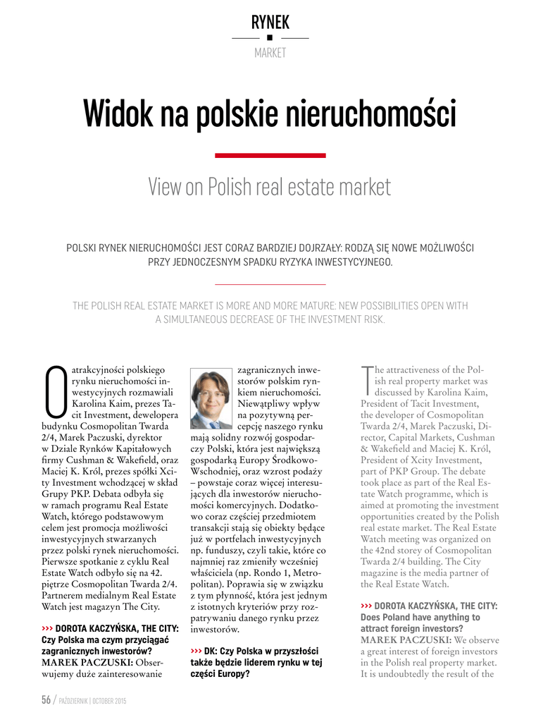 RYNEK MARKET Widok na polskie nieruchomości View on Polish real estate market POLSKI RYNEK NIERUCHOMOŚCI JEST CORAZ BARDZIEJ DOJRZAŁY: RODZĄ SIĘ NOWE MOŻLIWOŚCI PRZY JEDNOCZESNYM SPADKU RYZYKA INWESTYCYJNEGO. THE POLISH REAL ESTATE MARKET IS MORE AND MORE MATURE: NEW POSSIBILITIES OPEN WITH A SIMULTANEOUS DECREASE OF THE INVESTMENT RISK. O atrakcyjności polskiego rynku nieruchomości inwestycyjnych rozmawiali Karolina Kaim, prezes Tacit Investment, dewelopera budynku Cosmopolitan Twarda 2/4, Marek Paczuski, dyrektor w Dziale Rynków Kapitałowych firmy Cushman & Wakefield, oraz Maciej K. Król, prezes spółki Xcity Investment wchodzącej w skład Grupy PKP. Debata odbyła się w ramach programu Real Estate Watch, którego podstawowym celem jest promocja możliwości inwestycyjnych stwarzanych przez polski rynek nieruchomości. Pierwsze spotkanie z cyklu Real Estate Watch odbyło się na 42. piętrze Cosmopolitan Twarda 2/4. Partnerem medialnym Real Estate Watch jest magazyn The City. ››› DOROTA KACZYŃSKA, THE CITY: Czy Polska ma czym przyciągać zagranicznych inwestorów? Marek Paczuski: Obserwujemy duże zainteresowanie 56 / PAŹDZIERNIK | OCTOBER 2015 zagranicznych inwestorów polskim rynkiem nieruchomości. Niewątpliwy wpływ na pozytywną percepcję naszego rynku mają solidny rozwój gospodarczy Polski, która jest największą gospodarką Europy ŚrodkowoWschodniej, oraz wzrost podaży – powstaje coraz więcej interesujących dla inwestorów nieruchomości komercyjnych. Dodatkowo coraz częściej przedmiotem transakcji stają się obiekty będące już w portfelach inwestycyjnych np. funduszy, czyli takie, które co najmniej raz zmieniły wcześniej właściciela (np. Rondo 1, Metropolitan). Poprawia się w związku z tym płynność, która jest jednym z istotnych kryteriów przy rozpatrywaniu danego rynku przez inwestorów. ››› DK: Czy Polska w przyszłości także będzie liderem rynku w tej części Europy? T he attractiveness of the Polish real property market was discussed by Karolina Kaim, President of Tacit Investment, the developer of Cosmopolitan Twarda 2/4, Marek Paczuski, Director, Capital Markets, Cushman & Wakefield and Maciej K. Król, President of Xcity Investment, part of PKP Group. The debate took place as part of the Real Estate Watch programme, which is aimed at promoting the investment opportunities created by the Polish real estate market. The Real Estate Watch meeting was organized on the 42nd storey of Cosmopolitan Twarda 2/4 building. The City magazine is the media partner of the Real Estate Watch. ››› DOROTA KACZYŃSKA, THE CITY: Does Poland have anything to a(ract foreign investors? Marek Paczuski: We observe a great interest of foreign investors in the Polish real property market. It is undoubtedly the result of the RYNEK MARKET MP: Polska ma bardzo dużo atutów, które pozwolą nam zachować pozycję lidera w Europie Środkowo-Wschodniej. Przede wszystkim wielkość naszej gospodarki oraz strategiczna lokalizacja pomiędzy Europą Zachodnią a Wschodnią wpływają na znaczenie naszego kraju. Liczba mieszkańców, których siła nabywcza rośnie, pozytywnie wpływa na zapotrzebowanie na powierzchnie handlowe ze strony międzynarodowych i rodzimych sieci handlowych. Dysponujemy dobrze wykształconymi i konkurencyjnymi cenowo w porównaniu z Europą Zachodnią kadrami oraz dobrą dostępnością nowoczesnej powierzchni biurowej. Polska posiada silne fundamenty i duży potencjał wzrostu, aby na długo pozostać liderem regionu i stanowić atrakcyjną destynację dla inwestorów zainteresowanych lokowaniem kapitału na rynku nieruchomości. ››› DK: W kontekście rynku powierzchni handlowych, czy w Warszawie jest jeszcze miejsce na nowe projekty z tego sektora, czy też inwestorzy ze względu na duże nasycenie stołecznego rynku powierzchniami handlowymi będą upatrywać swoich szans na innych polskich rynkach? MP: Jeżeli spojrzymy na wskaźniki nasycenia powierzchniami handlowymi warszawskiego rynku oraz siłę nabywczą, to okazuje się, że Warszawa ma jeszcze sporo do zaoferowania, co znajduje potwierdzenie w projektach, które w najbliższym czasie będą w Warszawie realizowane, oraz w zainteresowaniu tymi projektami najemców i inwestorów. Niewątpliwie deweloperzy i inwestorzy dostrzegają potrzebę różnicowania produktów, a więc nie chcą tylko powielać już funkcjonujących formatów z bardzo zbliżoną do siebie ofertą najemców. Przykładem takiego projektu jest Hala Koszyki, która ma na siebie zupełnie inny pomysł. Uważam więc, że jeżeli na rynek trafią kolejne warszawskie nieruchomości handlowe, będą się one cieszyły dużym zainteresowaniem ze strony inwestorów. ››› DK: A co z rynkiem nieruchomości biurowych? Czy mamy szansę powtórzyć wynik z ubiegłego roku? MP: W ubiegłym roku wysoki wolumen sprzedaży (ok. 1,7 mld euro i 54-procentowy udział w łącznej wartości transakcji) wynikał z faktu pojawienia się na rynku dużych projektów biurowych, które zmieniły właściciela, takich jak Rondo 1, Metropolitan czy Plac Unii. W tym roku, jeżeli chodzi o Warszawę, wolumen może nie być tak imponujący, ze względu na fakt, iż część większych transakcji zainicjowanych w 2015 roku może zostać sfinalizowana w przyszłym. Ciekawie zapowiadają się kolejne dwa-trzy lata, kiedy to zostaną ukończone aktualnie powstające projekty biurowe, np. Warsaw Spire, Q22 czy Cedet, które szybko mogą trafić na rynek. Duża aktywność inwestorów jest obserwowana w miastach regionalnych: we Wrocławiu, w Krakowie, Poznaniu, Trójmieście. ››› DK: Czy polski rynek luksusowych nieruchomości mieszkaniowych cieszy się popularnością wśród zagranicznych inwestorów? karolina kaiM: Obserwujemy zainteresowanie ze strony inwestorów z zagranicy, jednak ze względu na małe zinstytucjonalizowanie rynku nieruchomości mieszkaniowych są to pojedyncze transakcje realizo- s