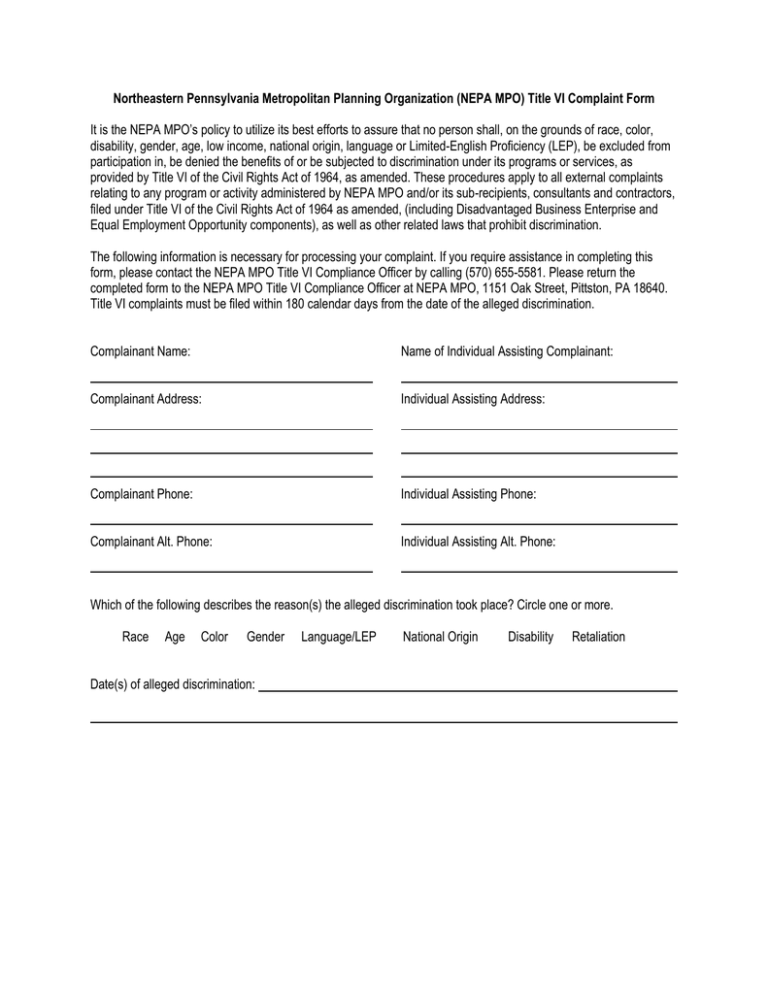 Northeastern Pennsylvania Metropolitan Planning Organization (NEPA MPO) Title VI Complaint Form It is the NEPA MPO’s policy to utilize its best efforts to assure that no person shall, on the grounds of race, color, disability, gender, age, low income, national origin, language or Limited-English Proficiency (LEP), be excluded from participation in, be denied the benefits of or be subjected to discrimination under its programs or services, as provided by Title VI of the Civil Rights Act of 1964, as amended. These procedures apply to all external complaints relating to any program or activity administered by NEPA MPO and/or its sub-recipients, consultants and contractors, filed under Title VI of the Civil Rights Act of 1964 as amended, (including Disadvantaged Business Enterprise and Equal Employment Opportunity components), as well as other related laws that prohibit discrimination. The following information is necessary for processing your complaint. If you require assistance in completing this form, please contact the NEPA MPO Title VI Compliance Officer by calling (570) 655-5581. Please return the completed form to the NEPA MPO Title VI Compliance Officer at NEPA MPO, 1151 Oak Street, Pittston, PA 18640. Title VI complaints must be filed within 180 calendar days from the date of the alleged discrimination. Complainant Name: Name of Individual Assisting Complainant: Complainant Address: Individual Assisting Address: Complainant Phone: Individual Assisting Phone: Complainant Alt. Phone: Individual Assisting Alt. Phone: Which of the following describes the reason(s) the alleged discrimination took place? Circle one or more. Race Age Color Gender Date(s) of alleged discrimination: Language/LEP National Origin Disability Retaliation Please provide a detailed description of the circumstances of the incident(s), including any additional information supporting your complaint (please use additional pages as necessary). Please provide the name(s), title and address (if known) of the person who discriminated against the Complainant. Please provide, if applicable, names and contact information of people who may have knowledge of the alleged incident(s) or are perceived as parties in the complained-of-incident(s): Please list any other agency where complaint has been filed: I affirm that I have read the above complaint and that it is true to the best of my knowledge, information and belief. Complainant’s Signature Assisting Individual Complainant’s Signature Print Name of Complainant Print Assisting Individual Name Date Received: _______________________________ Date Date Received By: ___________________________ Title VI Form Procedure The NEPA MPO will acknowledge receipt of the complaint by notifying the Complainant within 15 calendar days of the “Date Received”. If the Complainant is unsatisfied with the response from the NEPA MPO Compliance Officer, the NEPA MPO will transmit the complaint to the proper state or federal agency—Federal Highway Administration (FHWA), Federal Transit Administration (FTA), and the Pennsylvania Department of Transportation (PennDOT) for investigation and disposition pursuant to that agency’s Title VI complaint procedures. 1. Complete and return Title VI Complaint Form to the NEPA MPO Title VI Compliance Officer at NEPA MPO, 1151 Oak Street, Pittston, PA 18640, within 180 calendar days from the date of the alleged incident. 2. The complaint will be reviewed and investigated by the NEPA MPO Title VI Compliance Officer. 3. The NEPA MPO Title VI Compliance Officer will determine the merit of the claim and (within 15 calendar days) provide the Complainant, and/or the individual assisting complainant, a written acknowledgement that the NEPA MPO has either accepted or rejected the complaint. 4. If the Complainant is unsatisfied with the response, the complaint may be presented to the NEPA MPO Policy Board Chairman within 10 calendar days from receiving the response. 5. The NEPA MPO Policy Board Chairman will respond to the Complainant, and/or the Individual Assisting Complainant, within 15 calendar days. 6. If the Complainant is unsatisfied with the response, the investigative report and findings will be reviewed by the NEPA MPO Policy Board and the NEPA MPO counsel. 7. A copy of the complaint and the NEPA MPO’s investigative report/findings and remedial action plan, if appropriate, will be issued to the proper federal or state agency (e.g.: FHWA, FTA, and PennDOT) within 120 calendar days of receipt of the complaint. 8. A summary of the complaint and its resolution will be included as part of the Title VI updates to the proper federal or state agency (e.g.: FHWA, FTA, and PennDOT). 9. Records will be available for compliance review audits. NORTHEASTERN PENNSYLVANIA ORGANIZACIÓN DE PLANIFICACIÓN METROPOLITANA (NEPA MPO) Procedimiento de Queja del Título VI NEPA MPO está comprometido con asegurar que ninguna persona, por motivos de raza, color, discapacidad, edad, bajos ingresos financieros, nacionalidad, idioma, o abilidad limitada de hablar ingles, sea excluida de participar o sea negada los beneficios de sus servicios, o ser sujeto a discriminación en sus programas o servicios, según lo previsto en el Título VI de la Ley de Derechos Civiles de 1964, según enmendada. Estos procedimientos se aplican a todas las quejas externas relacionadas con cualquier programa o actividad administrada por NEPA MPO y / o sus subreceptores, consultores y contratistas, presentada bajo el Título VI de la Ley de Derechos Civiles de 1964 según enmendada, (incluyendo Empresas en Desventaja e Igualdad componentes de Oportunidad de Empleo), así como otras leyes conexas que prohíben la discriminación. La siguiente información es necesaria para el procesamiento de su queja. Si necesita ayuda para completar este formulario, por favor póngase en contacto con el MPO título VI Oficial de Cumplimiento NEPA llamando al (570) 6555581. Por favor devuelva el formulario complet