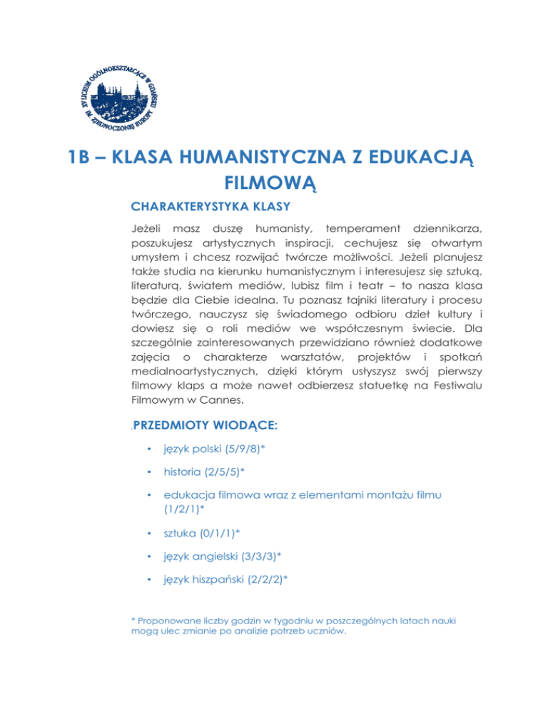1B – KLASA HUMANISTYCZNA Z EDUKACJĄ FILMOWĄ CHARAKTERYSTYKA KLASY Jeżeli masz duszę humanisty, temperament dziennikarza, poszukujesz artystycznych inspiracji, cechujesz się otwartym umysłem i chcesz rozwijać twórcze możliwości. Jeżeli planujesz także studia na kierunku humanistycznym i interesujesz się sztuką, literaturą, światem mediów, lubisz film i teatr – to nasza klasa będzie dla Ciebie idealna. Tu poznasz tajniki literatury i procesu twórczego, nauczysz się świadomego odbioru dzieł kultury i dowiesz się o roli mediów we współczesnym świecie. Dla szczególnie zainteresowanych przewidziano również dodatkowe zajęcia o charakterze warsztatów, projektów i spotkań medialnoartystycznych, dzięki którym usłyszysz swój pierwszy filmowy klaps a może nawet odbierzesz statuetkę na Festiwalu Filmowym w Cannes. .PRZEDMIOTY WIODĄCE: • język polski (5/9/8)* • historia (2/5/5)* • edukacja filmowa wraz z elementami montażu filmu (1/2/1)* • sztuka (0/1/1)* • język angielski (3/3/3)* • język hiszpański (2/2/2)* * Proponowane liczby godzin w tygodniu w poszczególnych latach nauki mogą ulec zmianie po analizie potrzeb uczniów.