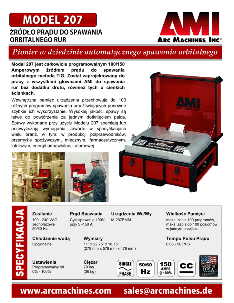 Ź Ł Ą Pionier w dziedzinie automatycznego spawania orbitalnego Model 207 jest całkowicie programowalnym 100/150 Amperowym źródłem prądu do spawania orbitalnego metodą TIG. Został zaprojektowany do pracy z wszystkimi głowicami AMI do spawania rur bez dodatku drutu, również tych o cienkich ściankach. Wewnętrzna pamięć urządzenia przechowuje do 100 różnych programów spawania umożliwiających ponowne szybkie ich wykorzystanie. Wysokiej jakości spawy są łatwe do powtórzenia za jednym dotknięciem palca. Spawy wykonane przy użyciu Modelu 207 spełniają lub przewyższają wymagania zawarte w specyfikacjach wielu branż, w tym: w produkcji półprzewodników, przemyśle spożywczym, mlecznym, farmaceutycznym, lotniczym, energii odnawialnej i atomowej. Zasilanie Prąd Spawania Urządzenia We/Wy Wielkość Pamięci 100 - 240 VAC Jednofazowe 50/60 Hz Cykl spawania 100% przy 5 -150 A M-207EMM maks. zapis 100 programów, maks. zapis do 100 poziomów w jednym przejściu Chłodzenie wodą Wymiary Tempo Pulsu Prądu Opcjonalne 11” x 22.75” x 18.75” (279 mm x 578 mm x 476 mm) 0.05 - 50 PPS Ustawienia Ciężar Programowalny od 0% - 100% 79 lbs. (36 kg) STANDARDOWE FUNKCJE Kontrolowane mikroprocesorem, z pamięcią wewnętrzną przechowującą do 100 programów spawania i do 100 poziomów w jednym przejściu. Wodoszczelna płyta kontrolna wyposażona w membranowe przyciski sterujące / programujące, idealna dla tzw. czystych pomieszczeń (clean-roomów). Górny wyświetlacz informujący o aktualnych parametrach procesu spawania. Dolny wyświetlacz informujący o danych programu, statusie systemu, podstawowej diagnostyce systemu. Wbudowana drukarka do drukowania zapisanych programów spawania. Wejście przyłącza pamięci zewnętrznej. Trójpozycyjny zamek funkcji PROGRAMOWANIE, SYSTEM ZAMKNIĘTY, SPAWANIE. AKCESORIA 1. Pilot zdalnego sterowania. 2. Pamięć zewnętrzna. 3. Chłodziarka wodna. 1. 4. Zestaw palnika do spawania ręcznego. 5. Kontener transportowy. 6. Kabel rejestratora zewnętrznego. 7. Przedłużacz do zdalnego sterowania. 8. Przedłużacz do głowicy. 9. Programowanie offline. 3. 2. 4. 5. Liderzy i Innowatorzy w Dziedzinie Automatycznego Spawania Orbitalnego Więcej informacji znajdą Państwo na naszej stronie www lub dzwoniąc do naszego biura w Niemczech SIEDZIBA FIRMY Arc Machines, Inc. ODDZIAŁ W EUROPIE Arc Machines, Inc. BIURO W NIEMCZECH Arc Machines GmbH 10500 Orbital Way Pacoima, CA 91331 U.S.A. Tel: +1 / 818 / 896 / 9556 Fax: +1 / 818 / 890 / 3724 [email protected] Chemin du Lavasson 2, CH-1196 Gland, Szwajcaria Tel: +41 / 22 / 995 / 0051 Fax: +41 / 22 / 995 / 0059 [email protected] Markelsbach 2 D-53804 Much, Niemcy Tel: +49 / 2245 / 91680 Fax: +49 / 2245 / 916868 [email protected] MKT 207 PS / September, 2012 / PL BIURO W ANGLII Arc Machines UK Limited Unit 2 Lamport Court Heartlands Business Park Daventry, NN11 8UF, UK Tel: +44 / 1327 / 312787 Fax: +44 / 1327 / 315034 [email protected]