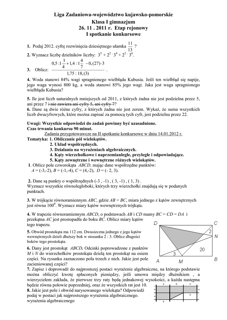 Liga Zadaniowa-województwo kujawsko-pomorskie Klasa I gimnazjum 26. 11 . 2011 r. Etap rejonowy I spotkanie konkursowe 11 ? 13 2. Wyznacz liczbę dzielników liczby: 35 + 22 . 34 + 22 . 36. 1 4 0,5 :1 1,4 : 1 0, (27) 3 4 7 3. Oblicz: . 1,75 : 18, (3) 4. Woda stanowi 84% wagi spragnionego wielbłąda Kubusia. Jeśli ten wielbłąd się napije, jego waga wynosi 800 kg, a woda stanowi 85% jego wagi. Jaka jest waga spragnionego wielbłąda Kubusia? 1. Podaj 2012. cyfrę rozwinięcia dziesiętnego ułamka 5. Ile jest liczb naturalnych mniejszych od 2011, z których żadna nie jest podzielna przez 5, ani przez 7 i nie zawiera ani cyfry 5, ani cyfry 7? 6. Dane są dwie różne cyfry, z których żadna nie jest zerem. Wykaż, że suma wszystkich liczb dwucyfrowych, które można zapisać za pomocą tych cyfr, jest podzielna przez 22. Uwagi: Wszystkie odpowiedzi do zadań powinny być uzasadnione. Czas trwania konkursu 90 minut. Zadania przygotowawcze na II spotkanie konkursowe w dniu 14.01.2012 r. Tematyka: 1. Obliczanie pól wielokątów. 2. Układ współrzędnych. 3. Działania na wyrażeniach algebraicznych. 4. Kąty wierzchołkowe i naprzemianległe, przyległe i odpowiadające. 5. Kąty zewnętrzne i wewnętrzne różnych wielokątów. 1. Oblicz pole czworokąta ABCD, mając dane współrzędne punktów: A = (-3,-2), B = (-1,-4), C = (4,-2), D = (- 2, 3). 2. Dane są punkty o współrzędnych (-3 , -1) , ( 3, -1) , ( 1, 3) . Wyznacz wszystkie równoległoboki, których trzy wierzchołki znajdują się w podanych punktach. 3. W trójkącie równoramiennym ABC, gdzie AB = BC, miara jednego z kątów zewnętrznych jest równa 1000. Wyznacz miary kątów wewnętrznych trójkąta. 4. W trapezie równoramiennym ABCD, o podstawach AB i CD mamy BC = CD = DA i przekątna AC jest prostopadła do boku BC. Oblicz miary kątów tego trapezu. 5. Obwód prostokąta ma 112 cm. Dwusieczna jednego z jego kątów wewnętrznych dzieli dłuższy bok w stosunku 2 : 3. Oblicz długości boków tego prostokąta. 6. Dany jest prostokąt ABCD. Odcinki poprowadzone z punktów M i N do wierzchołków prostokąta dzielą ten prostokąt na osiem części. Na rysunku zaznaczono pola trzech z nich. Jakie jest pole zacieniowanej części? 7. Zapisz i doprowadź do najprostszej postaci wyrażenie algebraiczne, na którego podstawie można obliczyć kwotę spłaconych pieniędzy, jeśli umowa między dłużnikiem , a wierzycielem zakłada, że pierwsze trzy raty będą jednakowej wysokości, a każda następna będzie równa połowie poprzedniej, oraz że wszystkich rat jest 10. 8. Jakie jest pole i obwód narysowanego wielokąta? Odpowiedź podaj w postaci jak najprostszego wyrażenia algebraicznego. wyrażenia algebraicznego 9. Uzupełnij kwadraty magiczne : a) b) 2x 8 -x 1 4- 4x c) 2 -2n -1 2 n 3x 10 -2x 1 5+x 2 3n 10. W trójkącie ABC kąt A ma miarę 600, a kąt B ma 700. Przedłużono bok BC poza C i znaleziono na tym przedłużeniu punkt D taki, że CD = CA. Oblicz miary kątów trójkąta ACD. 11. Zewnętrzne kąty trójkąta są proporcjonalne do liczb 6 : 7 : 11. Znajdź kąt między dwusiecznymi wychodzącymi z wierzchołków mniejszych kątów wewnętrznych tego trójkąta. 12. Przekątna czworokąta wypukłego dzieli na połowę odcinek łączący środki przeciwległych boków tego czworokąta. Udowodnij, ze przekątna ta dzieli czworokąt na dwa trójkąty o równych polach. 13. W trójkącie ostrokątnym ABC wysokość CD tworzy z bokiem AC kąt o mierze 300. Kąt przy wierzchołku B w tym trójkącie jest dwukrotnie większy niż kąt przy wierzchołku C. Wyznacz miary kątów wewnętrznych trójkąta ABC. 14. W trójkąt o kątach 400, 700, 700 wpisano okrąg i połączono punkty styczności trójkąta i okręgu. Oblicz miary kątów powstałego trójkąta.. 15. Niech P będzie dowolnym punktem czworokąta wypukłego ABCD. Punkt ten połączono z punktami K, L, M, N będącymi środkami odpowiednio boków AB, BC, CD, DA. Udowodnij, że suma pól czworokątów AKPN i CMPL jest równa sumie pól czworokątów BLPK i DMPN. 16. W trójkącie równoramiennym ABC, gdzie |AB| = |BC|, miara jednego z kątów z zewnętrznych jest równa 110°. Wyznacz miary kątów wewnętrznych trójkąta. 17. Punkty A, B, C, D i E dzielą okrąg na równe części i leżą na okręgu w podanej kolejności. Oblicz miary: kąta CDE, kąta CDE oraz kąta CEA. 14. Wiedząc, że a 1 b . Oblicz . a b 2009 a 3b 15. Punkty A=( 4,-2) i B=( 4,4) są wierzchołkami trójkąta ABC, którego pole jest równe 24. Znajdź współrzędne punktu C, wiedząc, że: a) trójkąt ABC jest równoramienny i odcinek AB jest jego podstawą, b) trójkąt ABC jest prostokątny, c) druga współrzędna punktu C jest równa –3. Uwaga: Każdy z podpunktów traktujemy jako osobne zadanie. 16. Ile jest różnych trójkątów prostokątnych o polu 2004 i przyprostokątnych naturalnej długości? 17. Na rysunku widoczny jest kwadrat i trójkąt równoboczny. Kąt ma miarę 700. Oblicz dwa kąty zaznaczone na rysunku. 18. Czy istnieje sześciokąt wypukły w którym cztery kąty wewnętrzne są proste? Uwaga: Dodatkowe zadania przygotowawcze można znaleźć w książce „Liga Zadaniowa” str 25 – 27 oraz str 15 – 18, str 78 – 90 oraz „Koło Matematyczne w Gimnazjum” str 117 – 132 oraz 16 –27.
